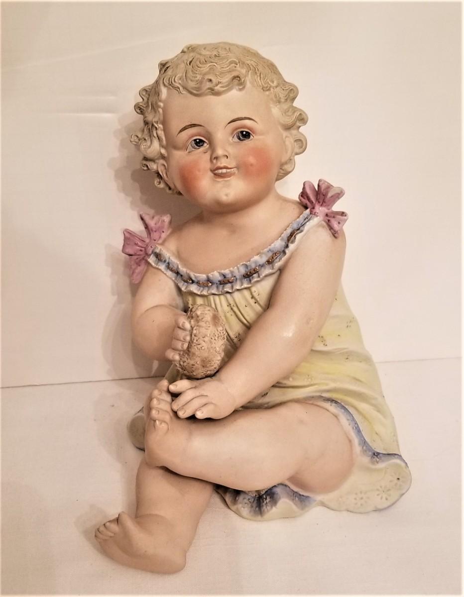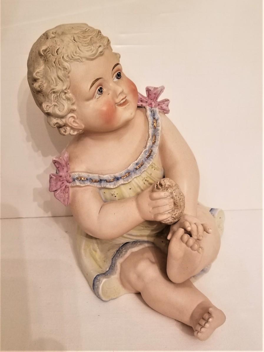 This vintage bisque china Piano Baby is in great vintage condition - no marks - probably Victorian Revival (1940's - 50's). 9" tall. We have a few others (one German) coming up later in the sale.