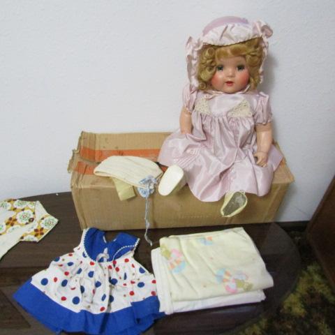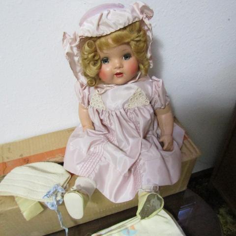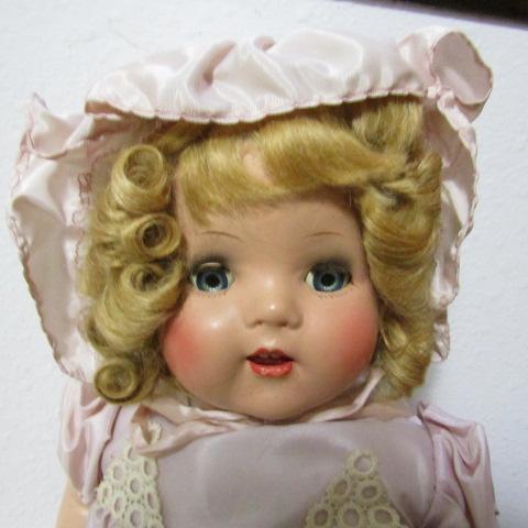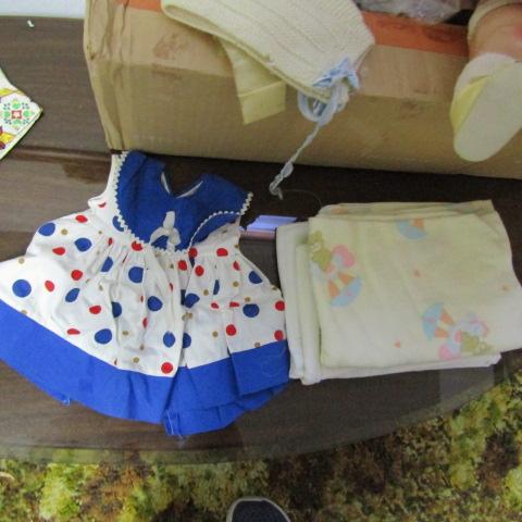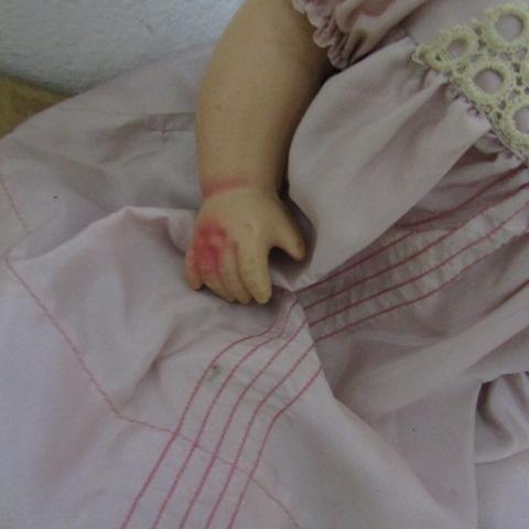 VINTAGE BABY DOLL WITH DRESS AND BLANKETS, NO MAKER MARKS SEEN. GOOD CONDITION WITH RED MARK ON DOLLS HAND