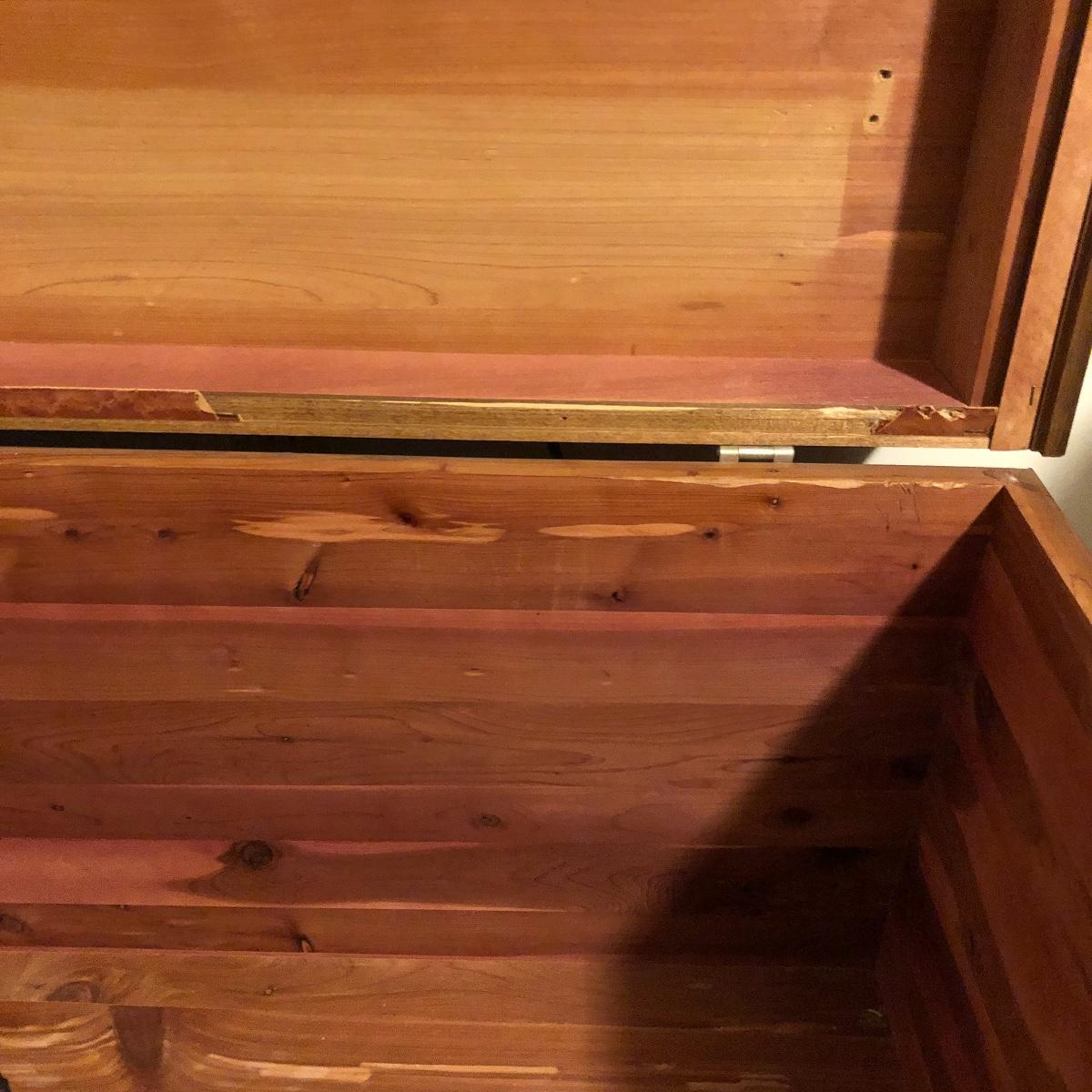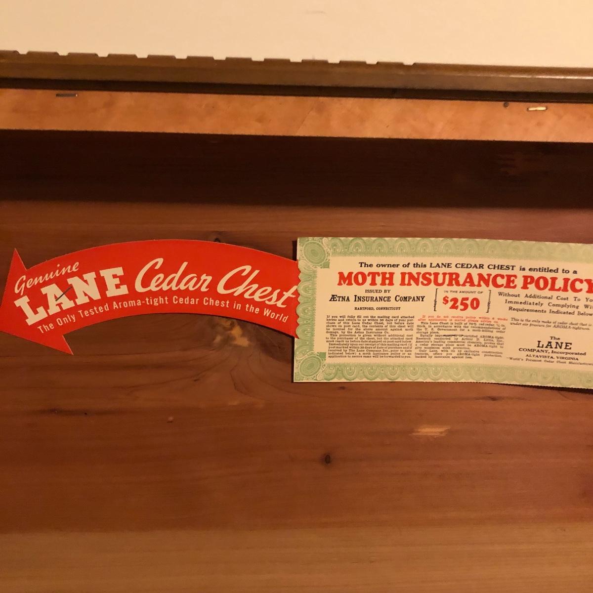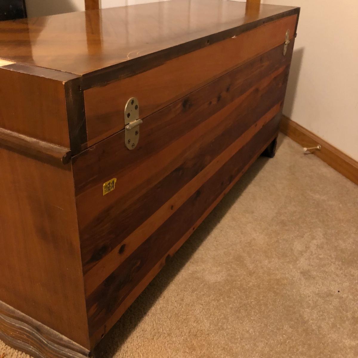 Keep the moths away from your fabric with this vintage Lane Cedar Chest. Open the top to the Wonderful smell of cedar. Chest has some veneer missing and the lock has been disabled and hinges taken off, see pictures. Please note that Lane had several recall on chests for locks, you can go to Lane.com to see if this chest needs a replacement lock. There is no charge for replacement. This is a safety recall and we cannot verify that this one has been done.