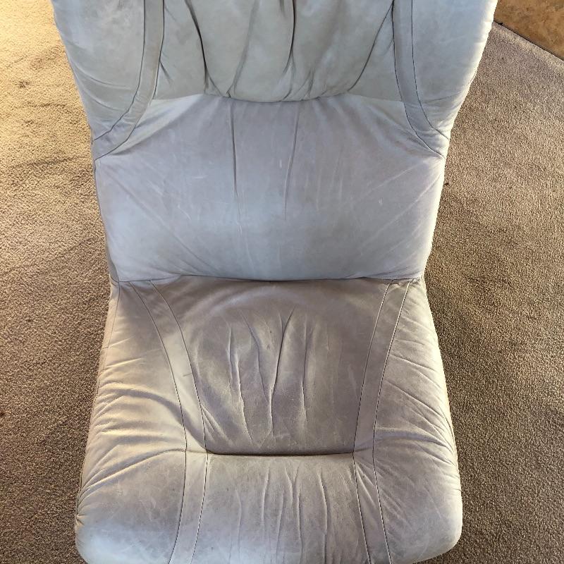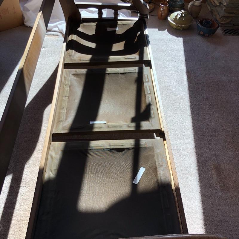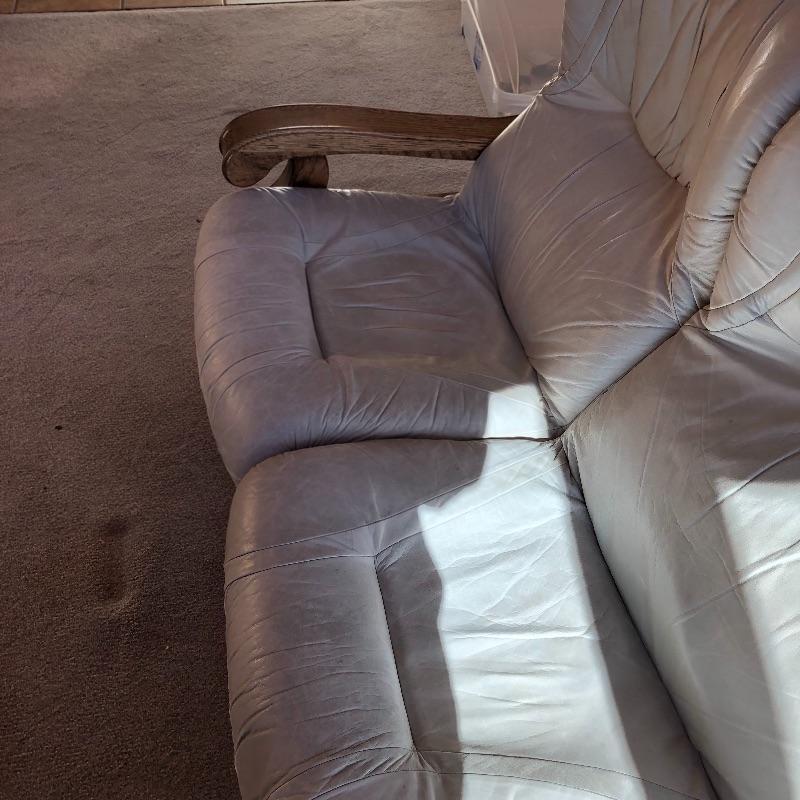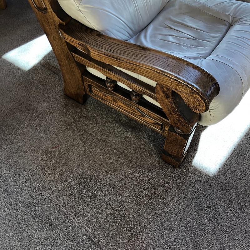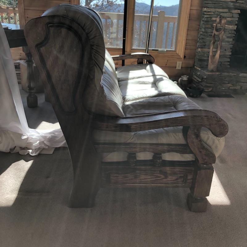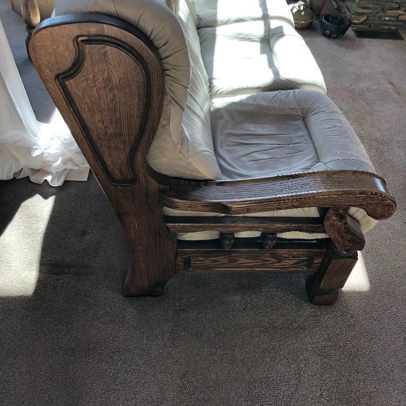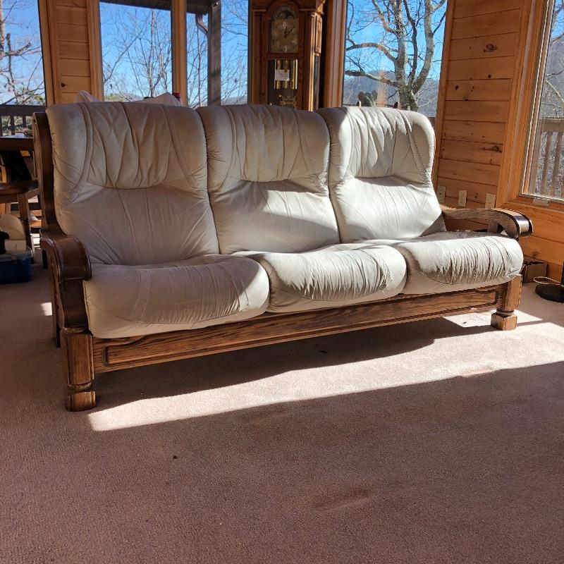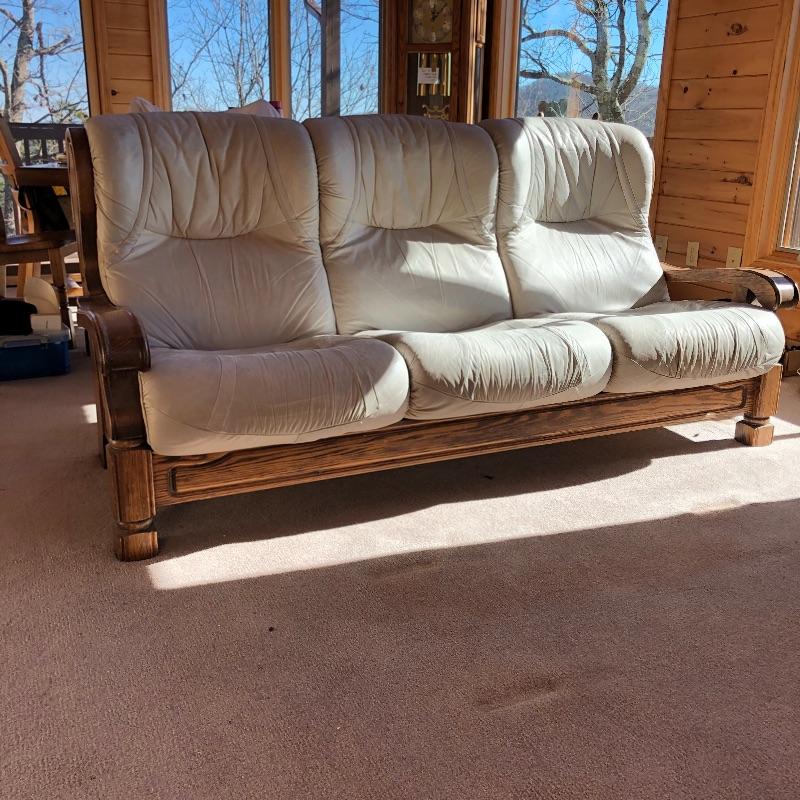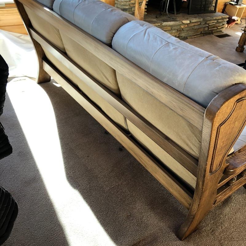 This sofa is solid Oak with leather covered cushions and made in Belgium by the European American Furniture Company. You can enjoy a relaxing evening by the fireplace on this comfortable sofa. Sofa has sun bleaching, see pictures. Matches lot 22. Sofa measures 36” x 78” x 38.5”. Bring help for loading as is substantial.