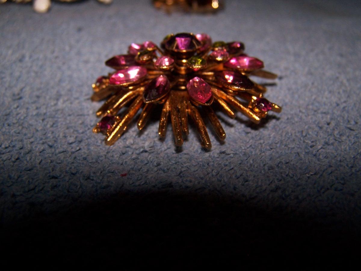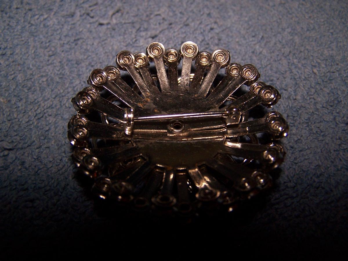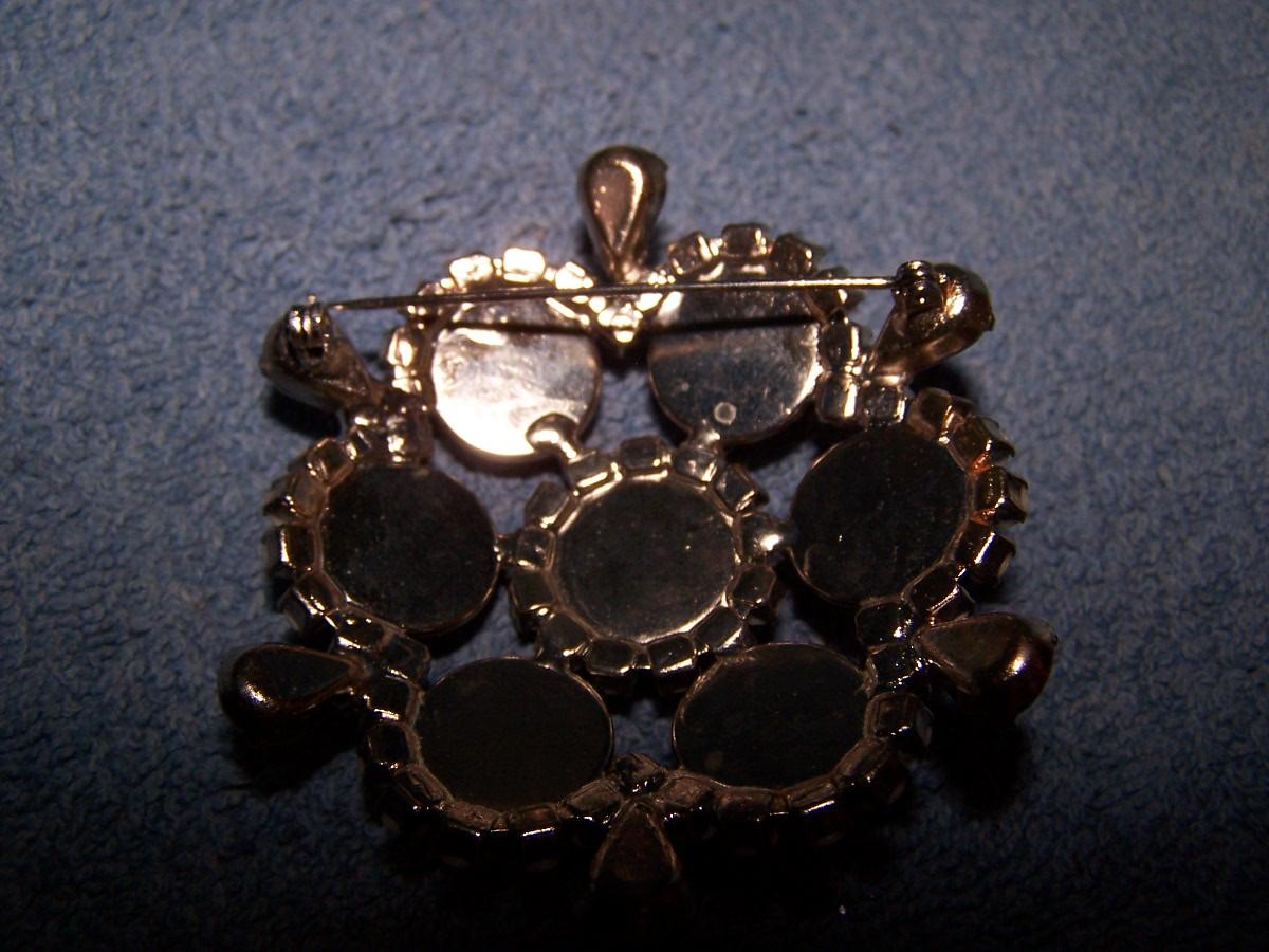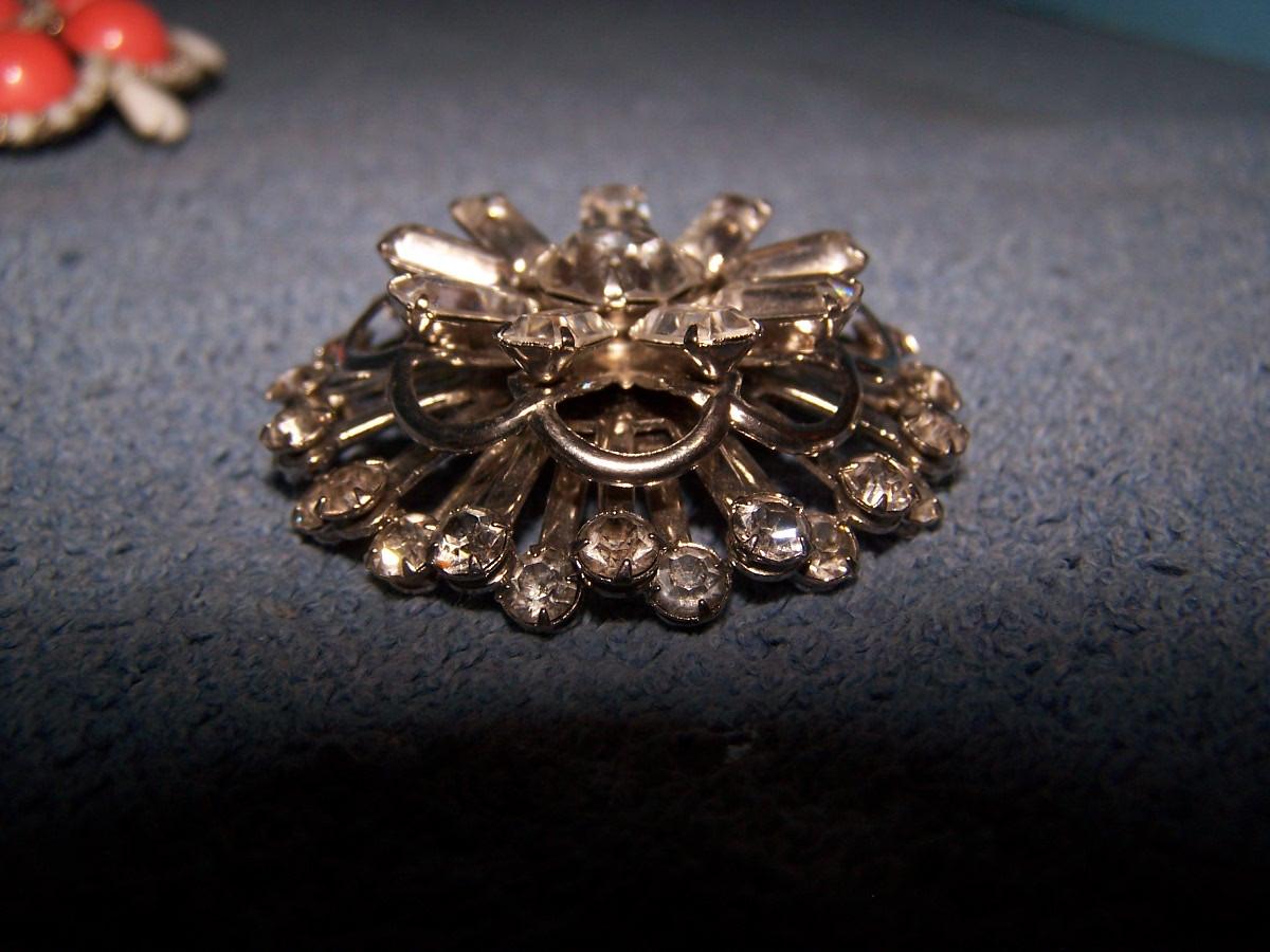 THESE ARE SOME WILD & CRAZY RHINESTONE PINS!!! UNMARKED. ORANGE/WHITE IS 2 5/8'' ACROSS.. LIGHT WEAR.