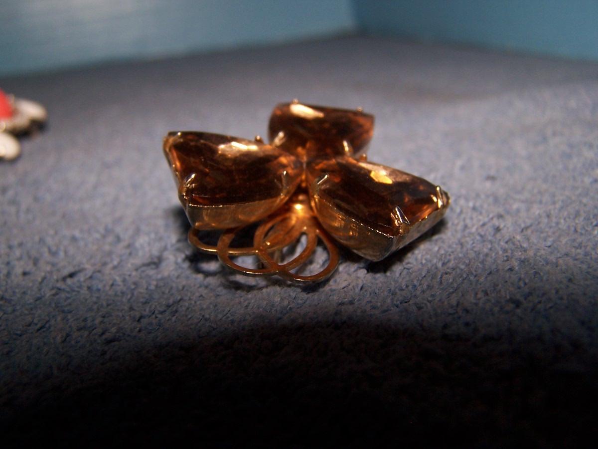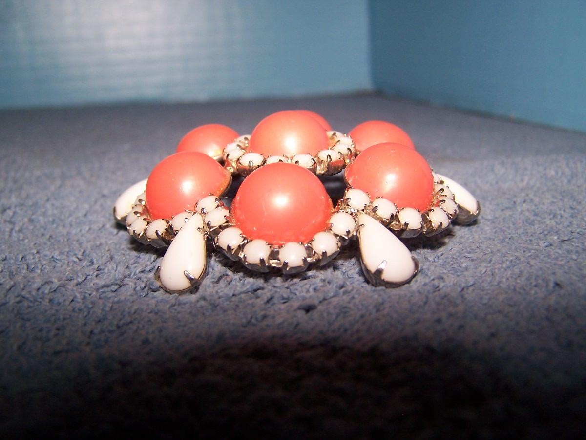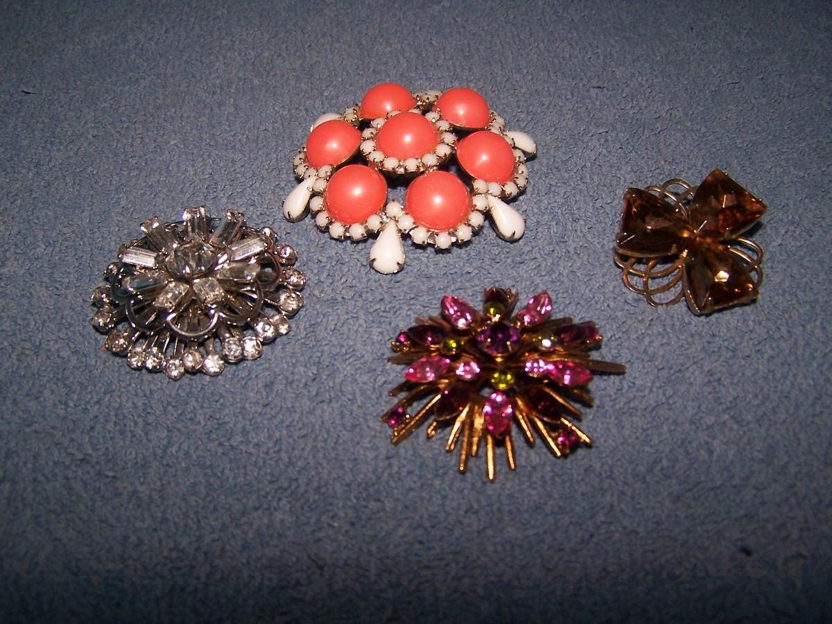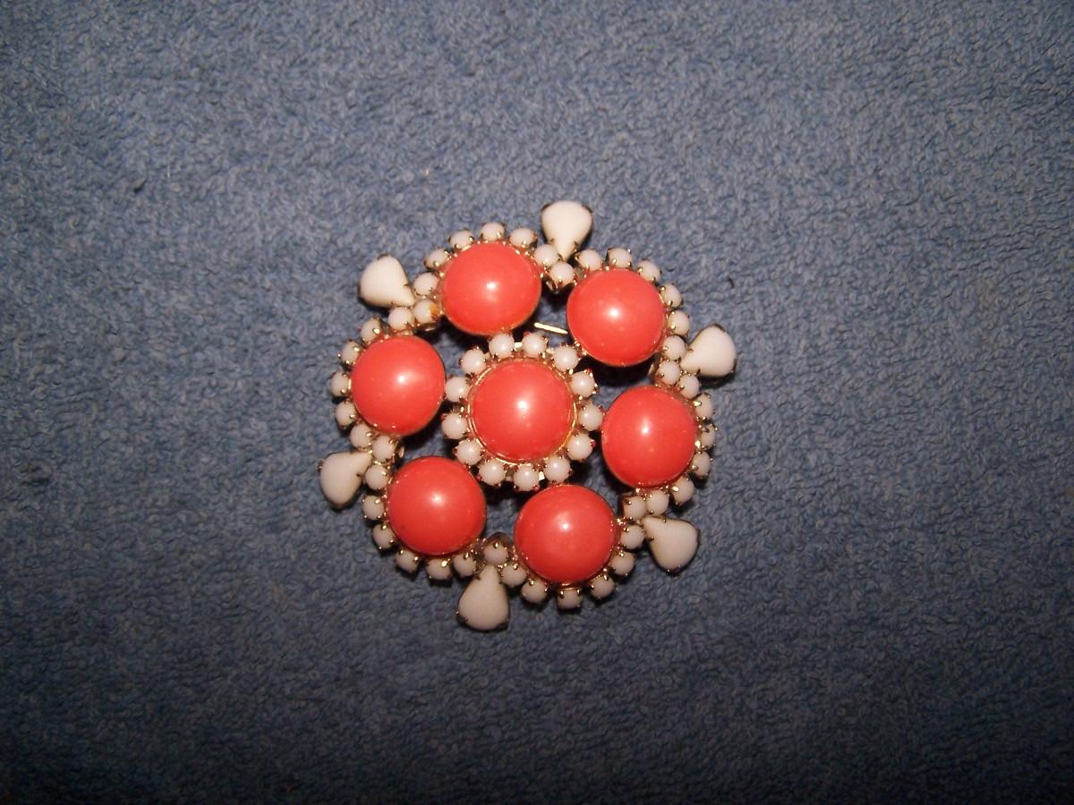 THESE ARE SOME WILD & CRAZY RHINESTONE PINS!!! UNMARKED. ORANGE/WHITE IS 2 5/8'' ACROSS.. LIGHT WEAR.