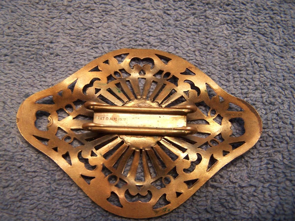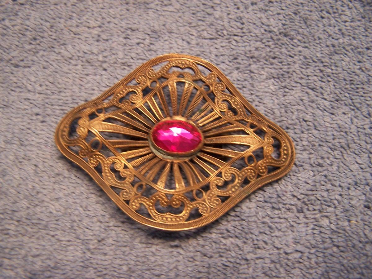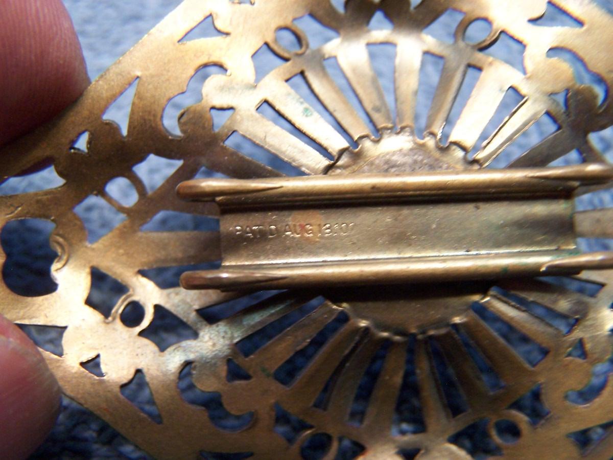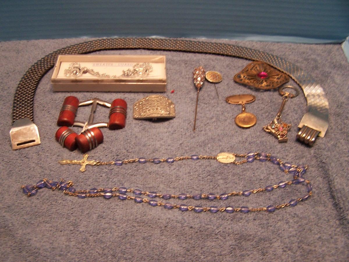 THIS IS AN INTERESTING GROUPING OF VINTAGE ITEMS!!! THE BRASS PIN WITH THE PURPLE/PINK STONE IS MARKED 1907.... THE MARKED METAL TOP BELT STRETCHES.... IT IS 1'' WIDE, AND STRETCHES 27 1/2'' TO 44'' LONG... THERE IS A PERFUME KEY RING/CHAIN.... THE LOCKET IS A BIT SMASHED... OTHERWISE, LIGHT WEAR...