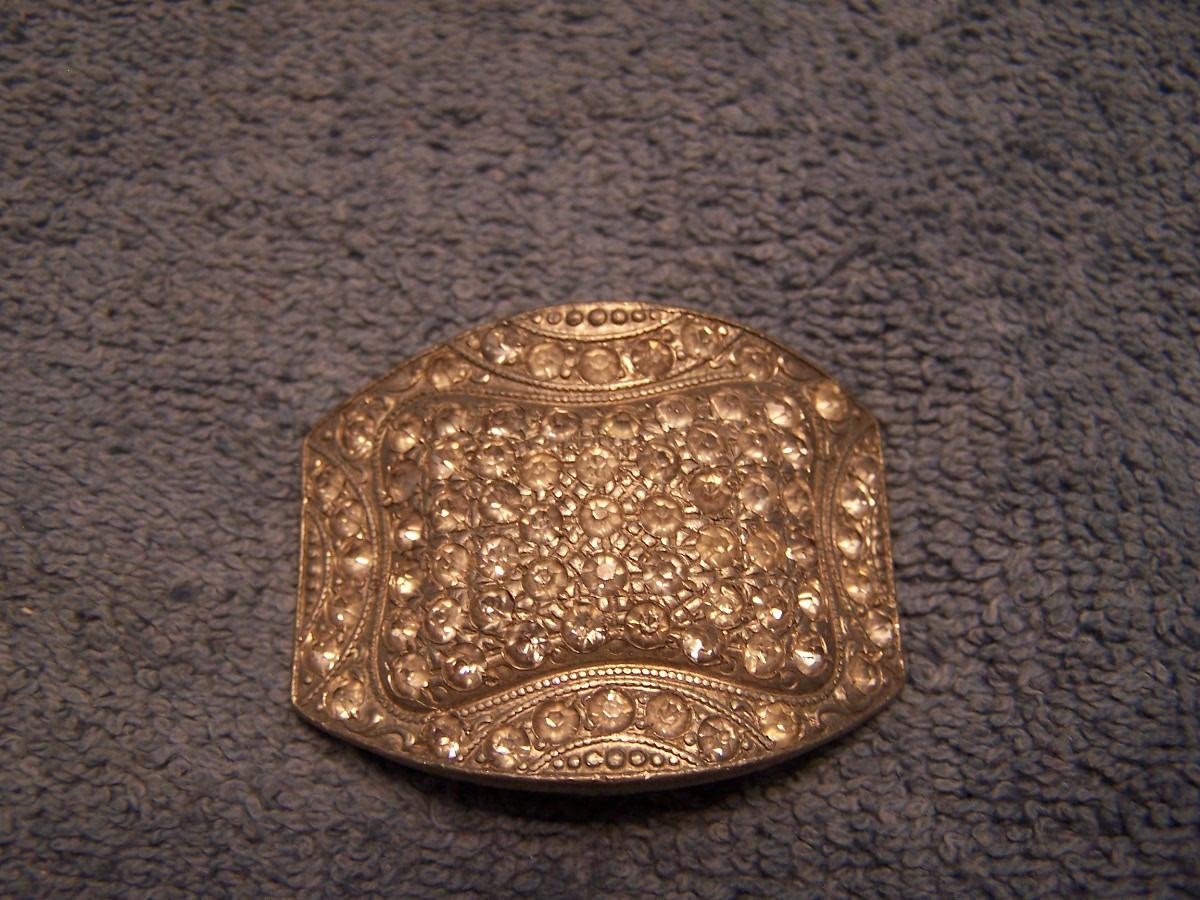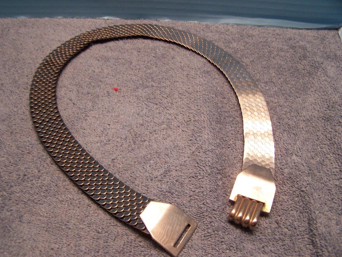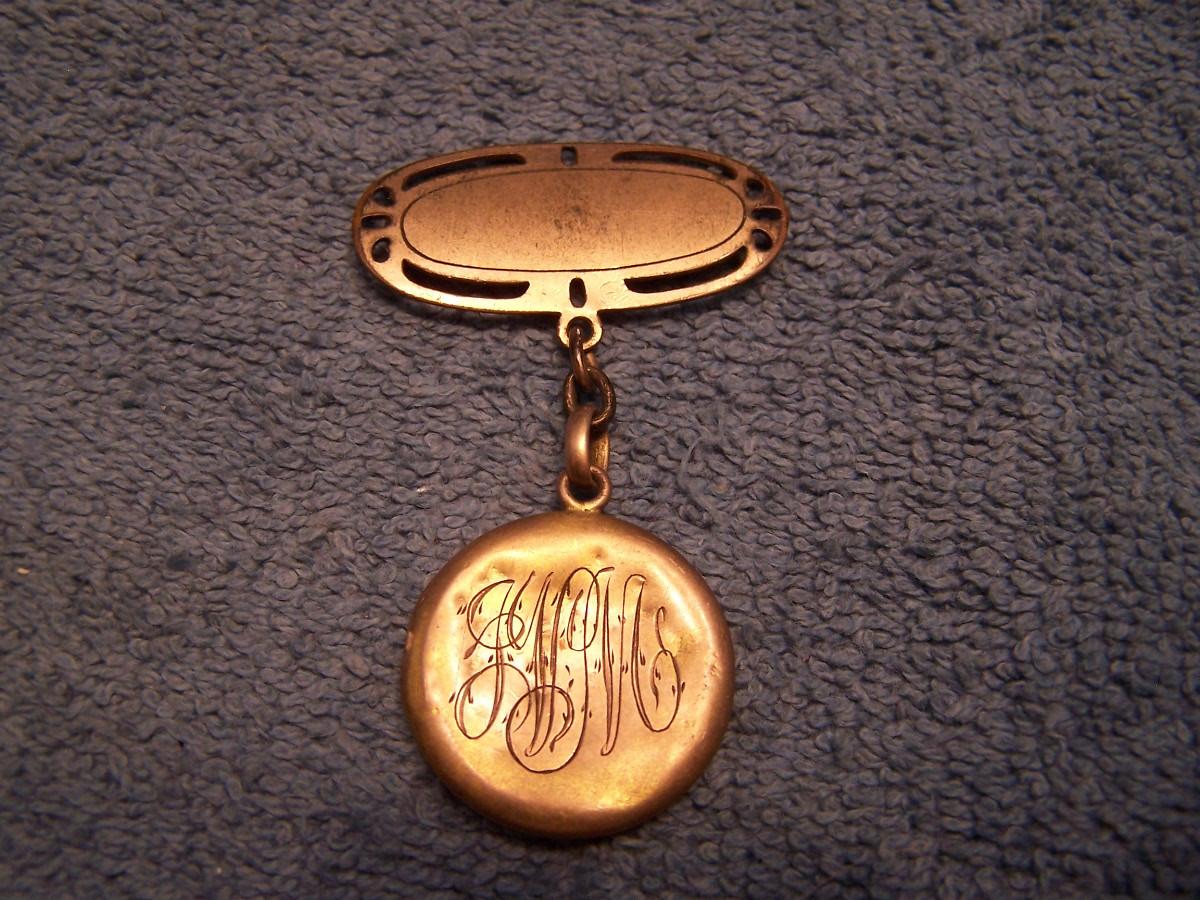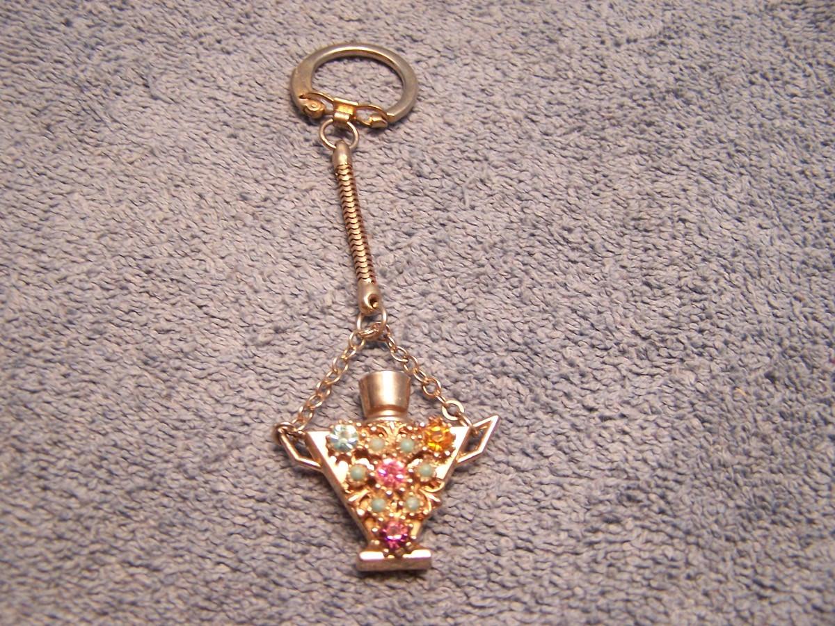 THIS IS AN INTERESTING GROUPING OF VINTAGE ITEMS!!! THE BRASS PIN WITH THE PURPLE/PINK STONE IS MARKED 1907.... THE MARKED METAL TOP BELT STRETCHES.... IT IS 1'' WIDE, AND STRETCHES 27 1/2'' TO 44'' LONG... THERE IS A PERFUME KEY RING/CHAIN.... THE LOCKET IS A BIT SMASHED... OTHERWISE, LIGHT WEAR...