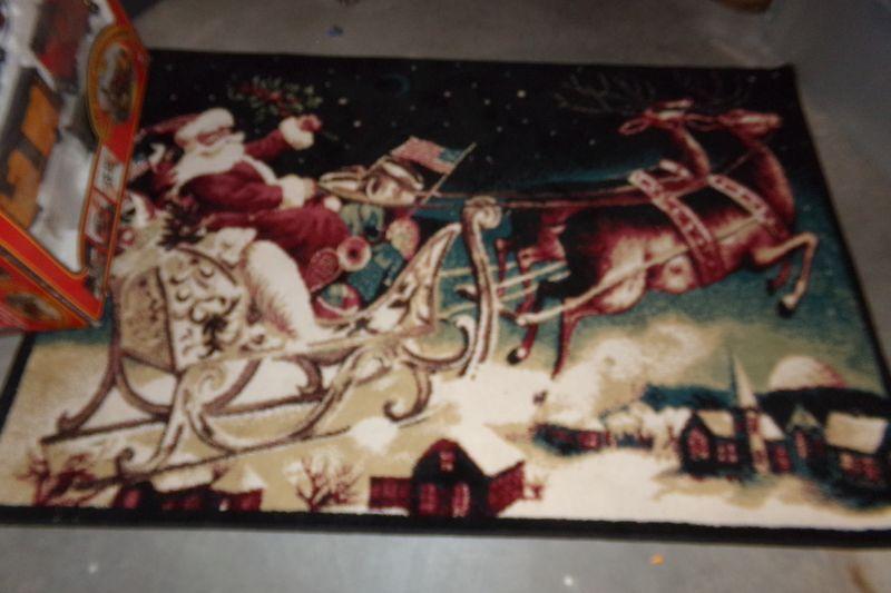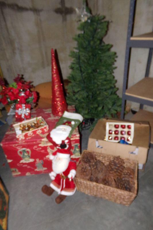 2 ARTIFICIAL TREES, 2 OUTDOOR LIGHTED TREES, NICE CHRISTMAS RUG, OTHER DECORATIONS