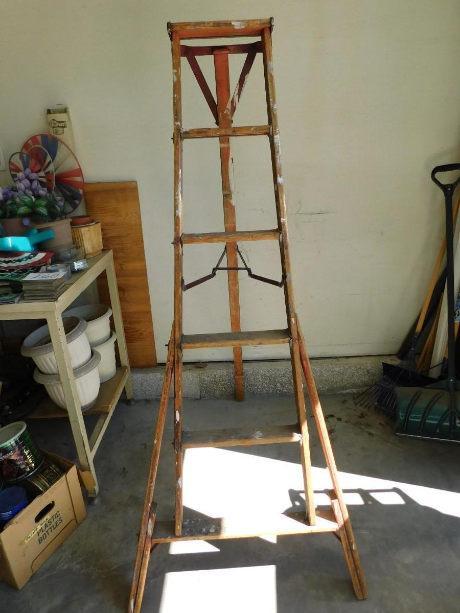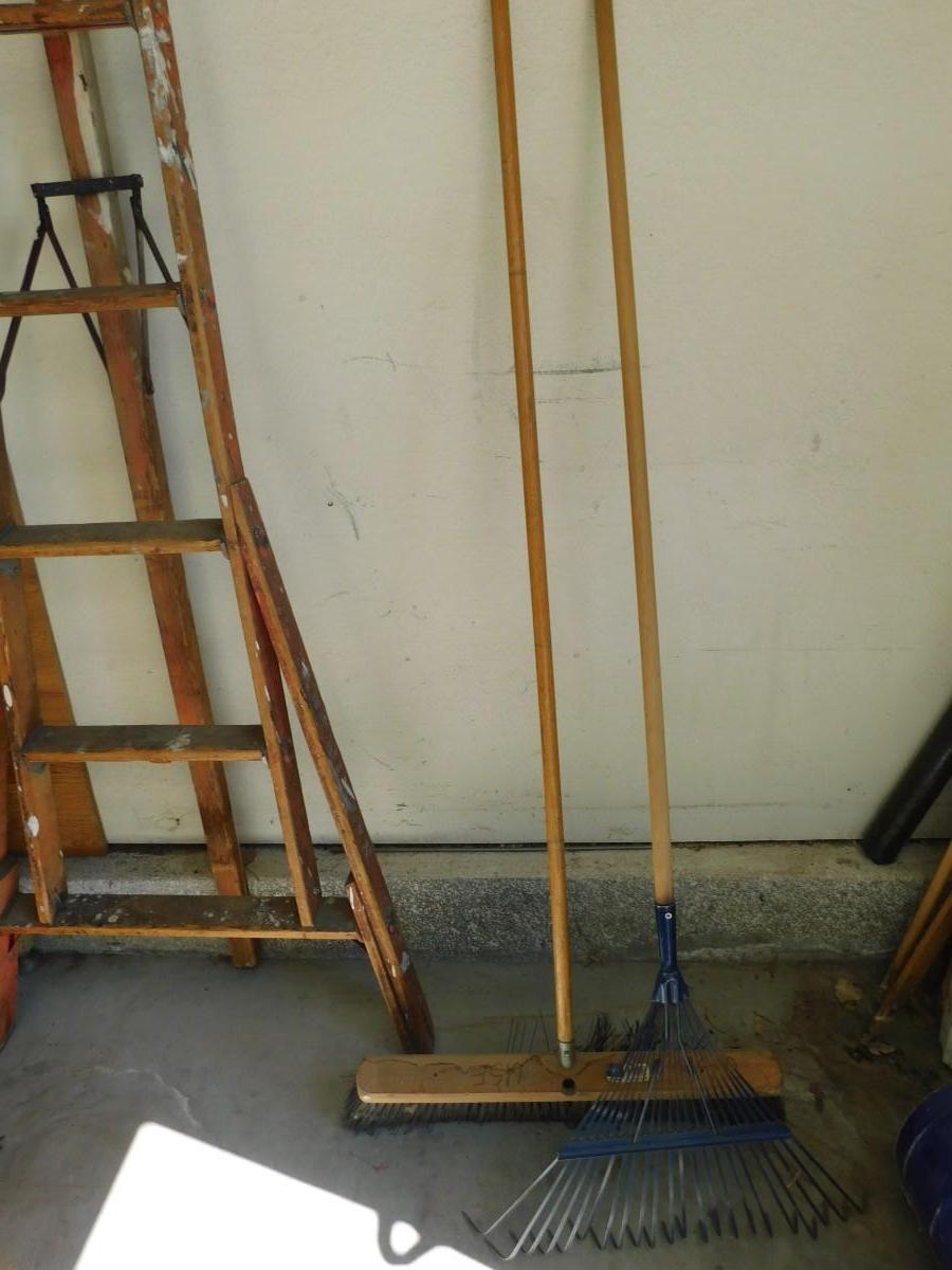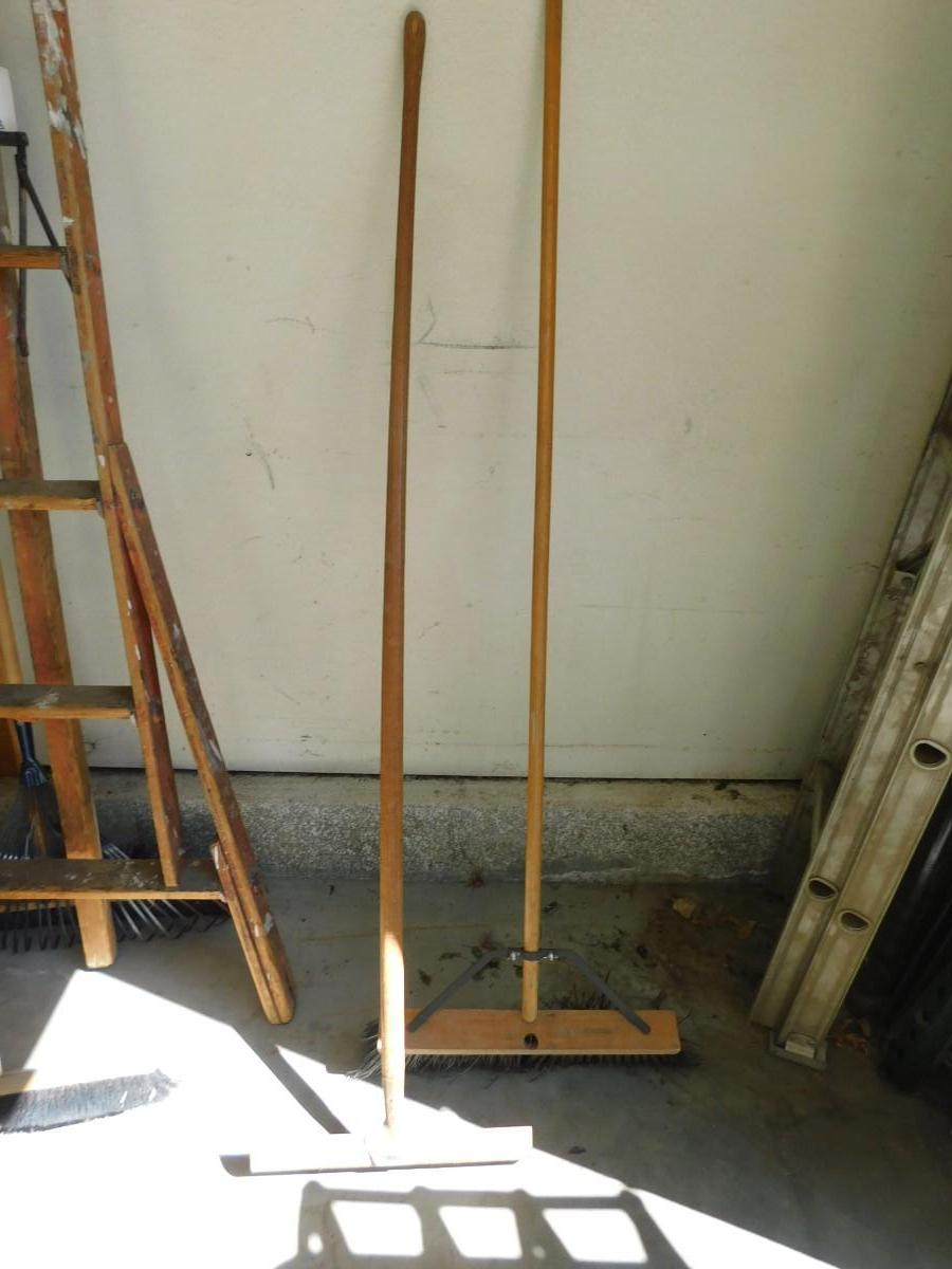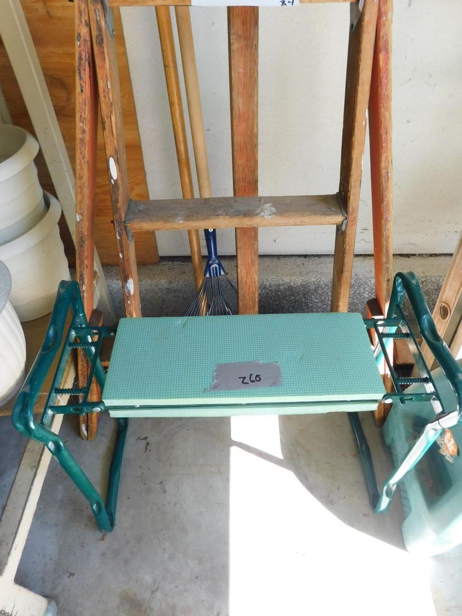 LOT 260 5-1/2' LADDER, GARDEN BENCH, RAKE, PUSH BROOM
