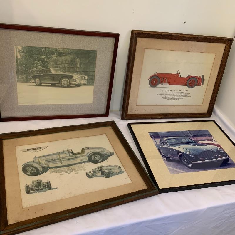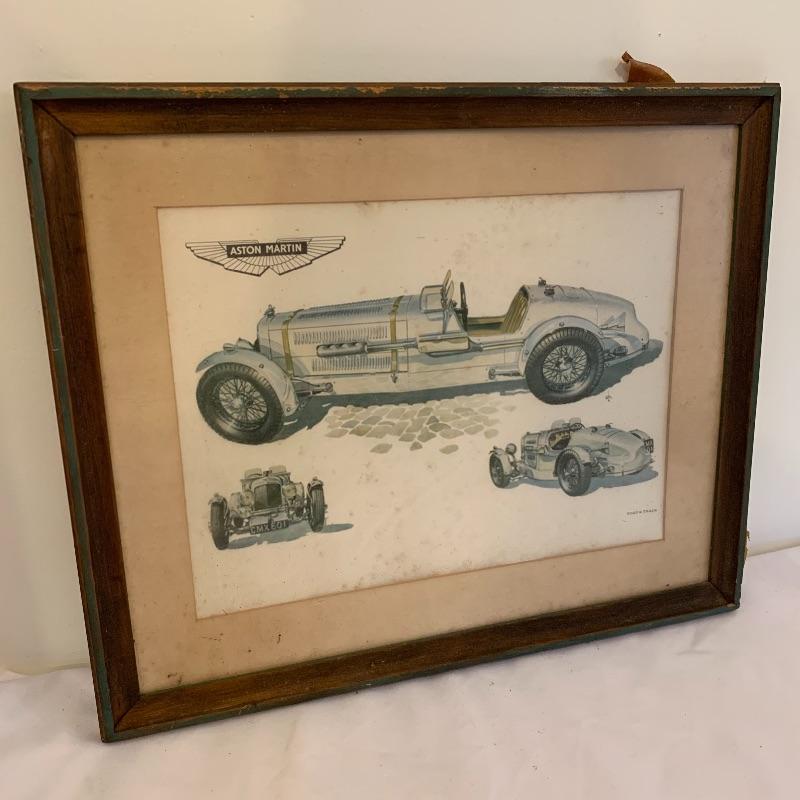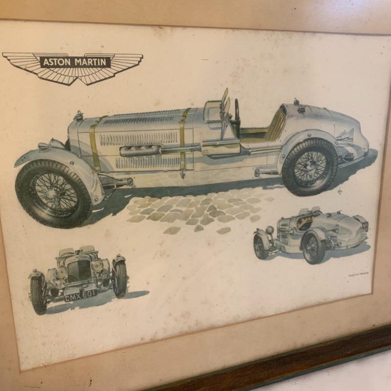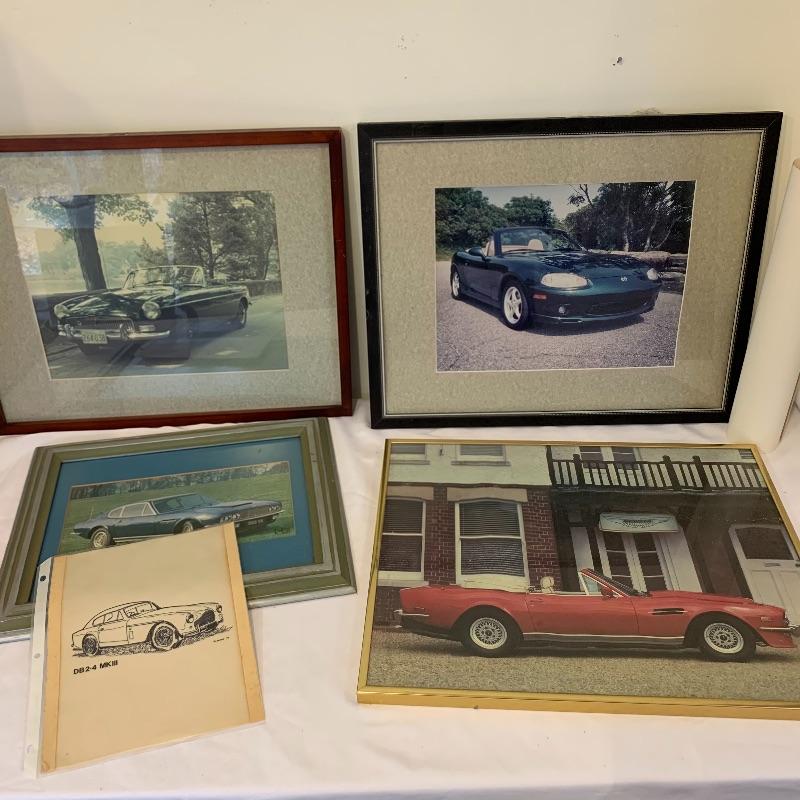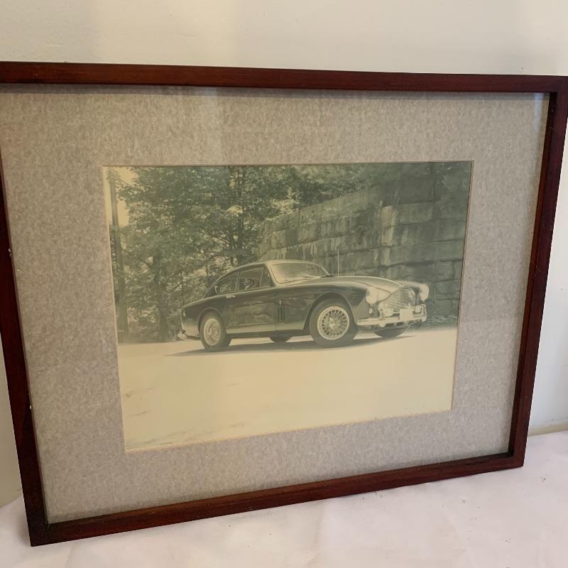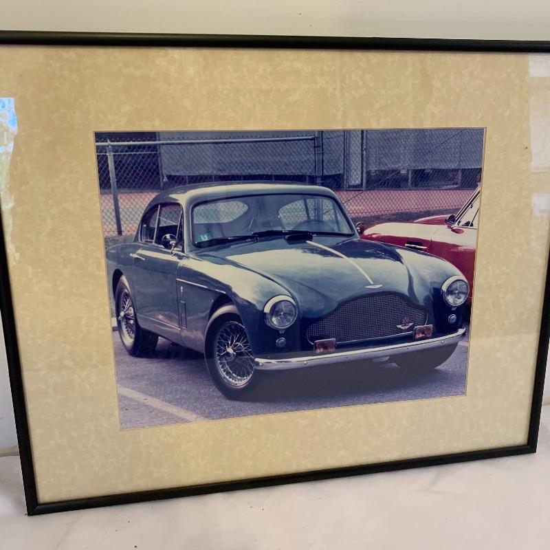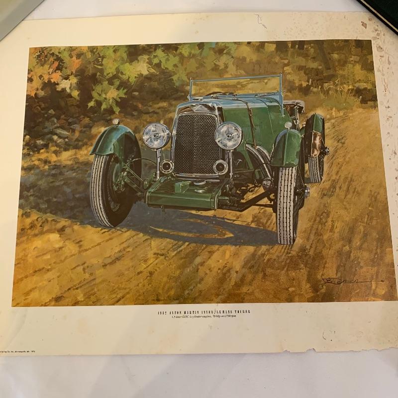 This lot includes several old photos of Aston Martin cars, including an old green one (21” x 17”), a green Mazda (21” x 17”), a blue car (17” x 14”), a red Aston Martin (20.5” x 16.5”, 2 copies), four other Aston Martin photos and a poster. Two of the photos have significant peeling on the back. Local pickup only.