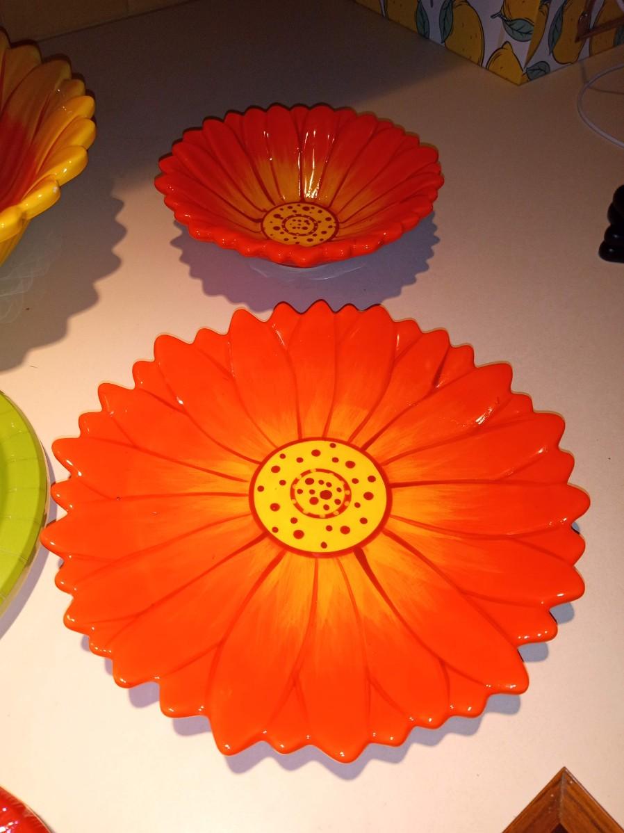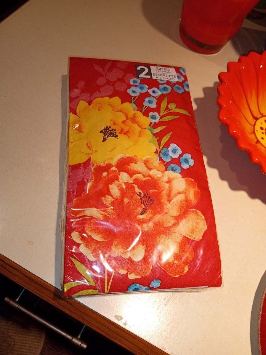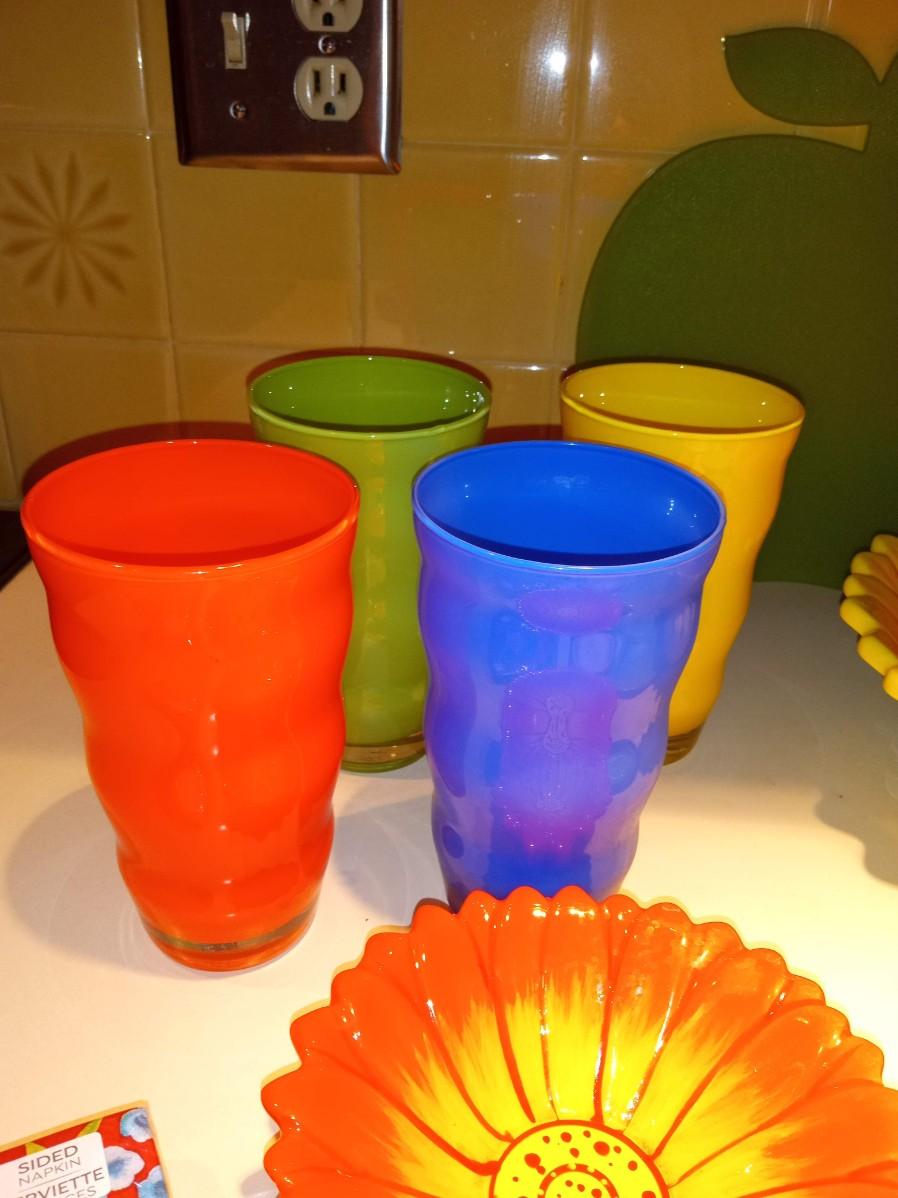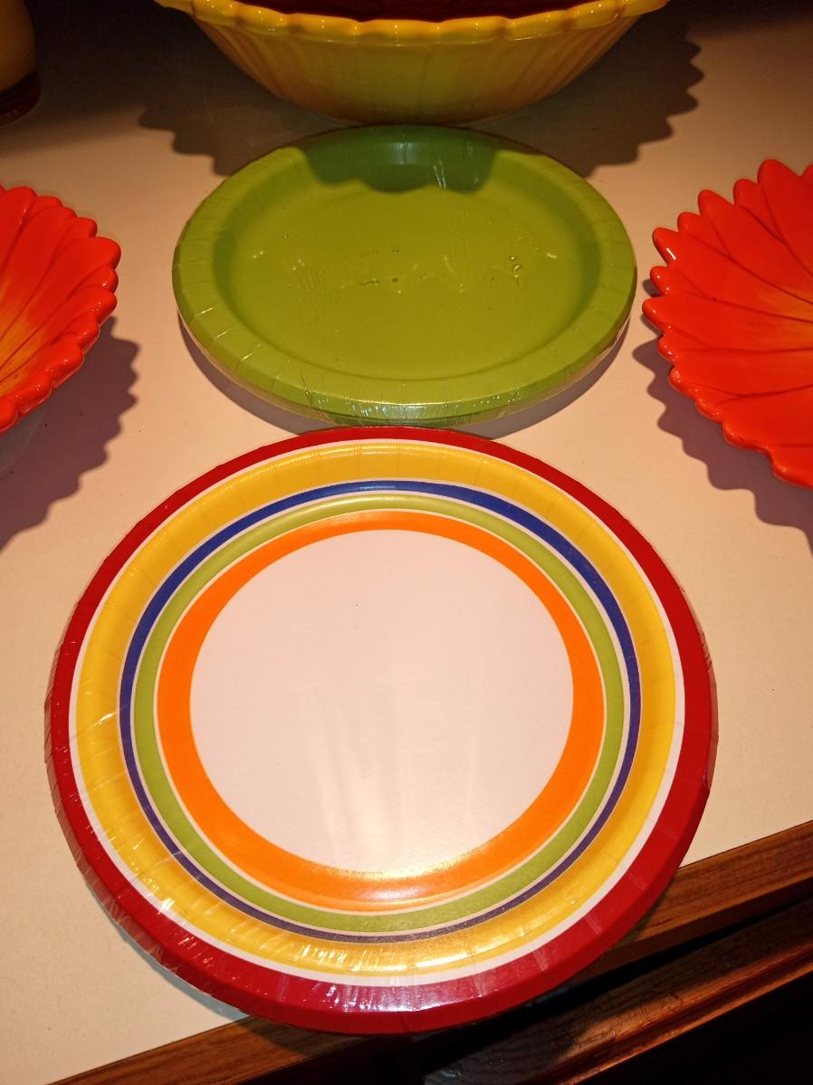 COLORFUL DRINKING GLASSES, FLOWER CHIP AND DIP BOWLS AND PLATE, 2 PACKAGES OF PAPER PLATES, PAPER NAPKINS AND A PLASTIC APPLE CUTTING BOARD