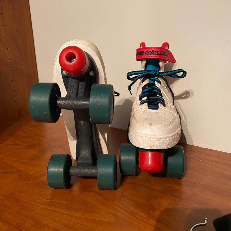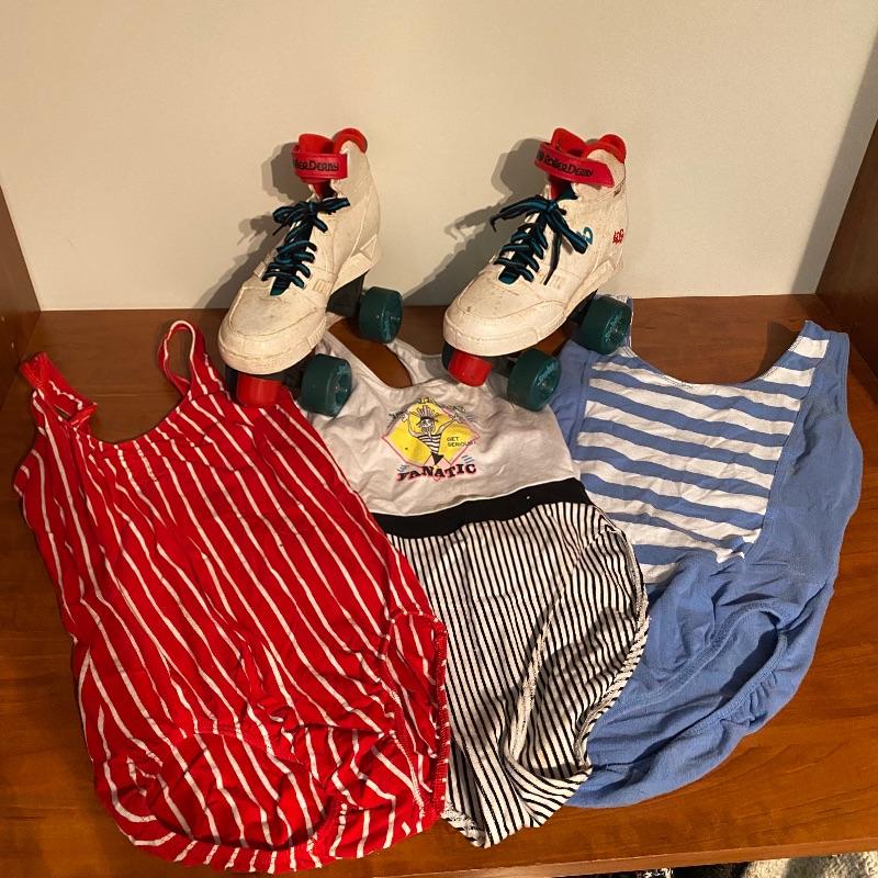 Bring back the 80s in this cool pair of roller skates and these sexy leotards! You’ll be doing aerobics in style with these 7 leotards. Three black and four in vintage fashion. They have a few stains that can hopefully be washed out. They are Smalls and mediums. Also includes a small pair of shorts by Cannondale. The shorts may be mens because they are a bit large. The skates have a tag that says size 4 and they say Roller Derby on the side. Have fun with this lot! Shipping available