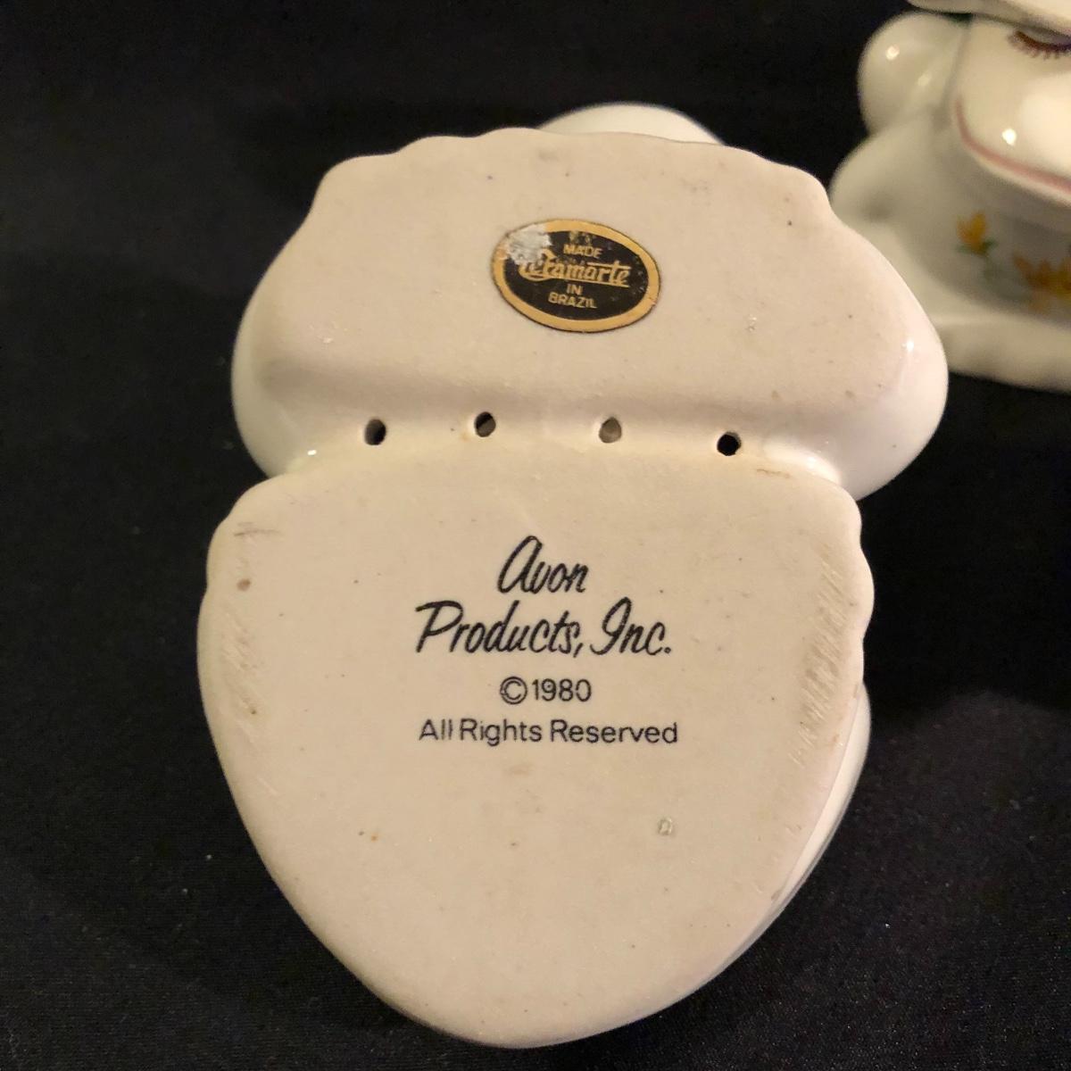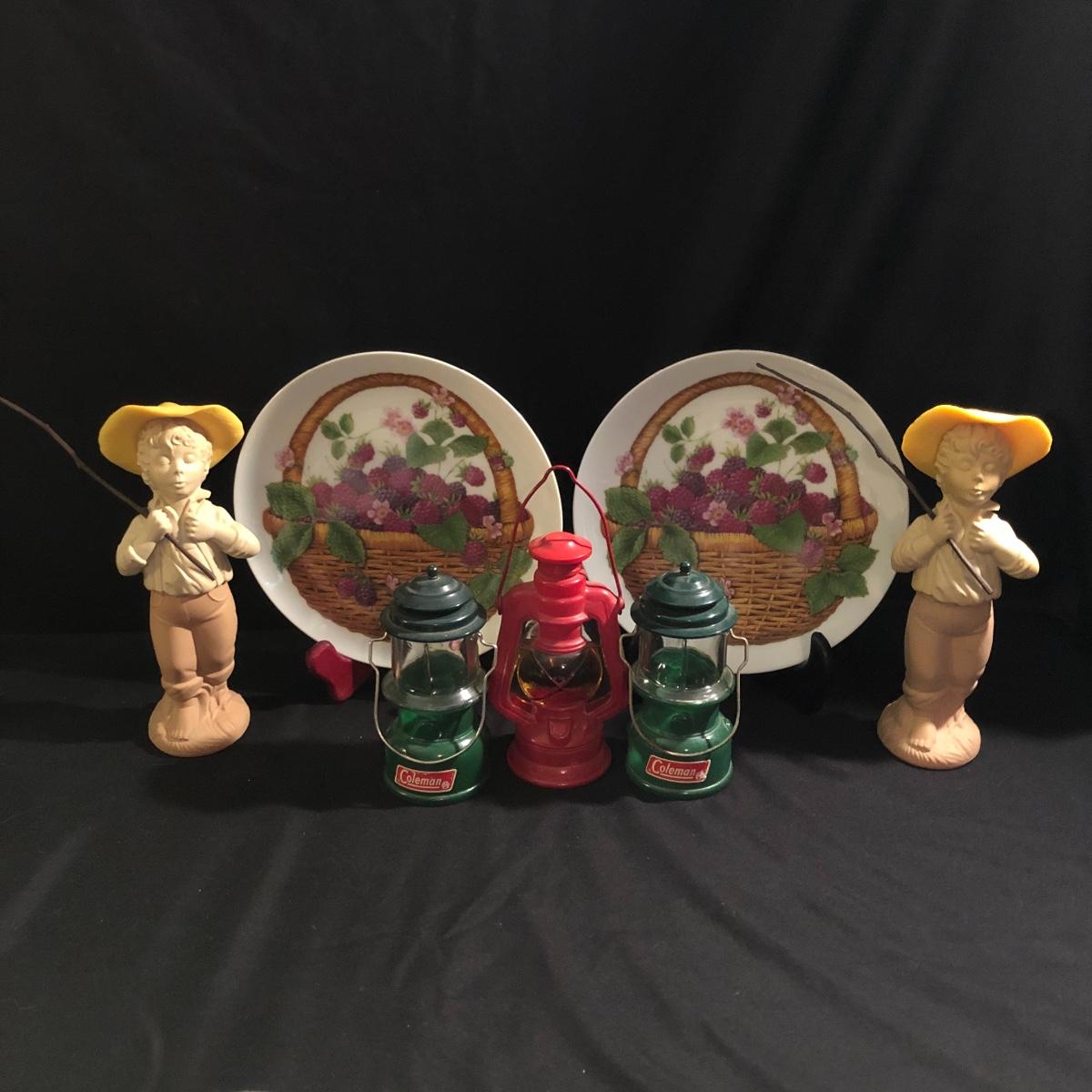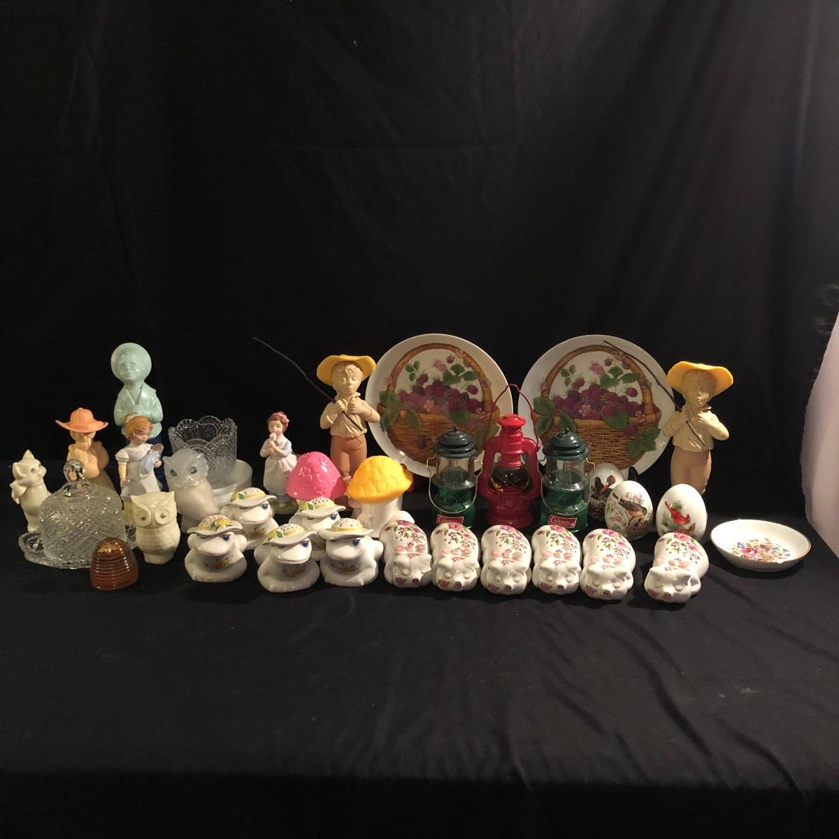 Remember back to the days of the Avon lady coming to your house? This lot includes Avon collectibles - two Coleman lanterns, country lantern, two Catch a Fish, Enchanted mushroom, six ceramic pigs, five ceramic frogs, three ceramic eggs and more.