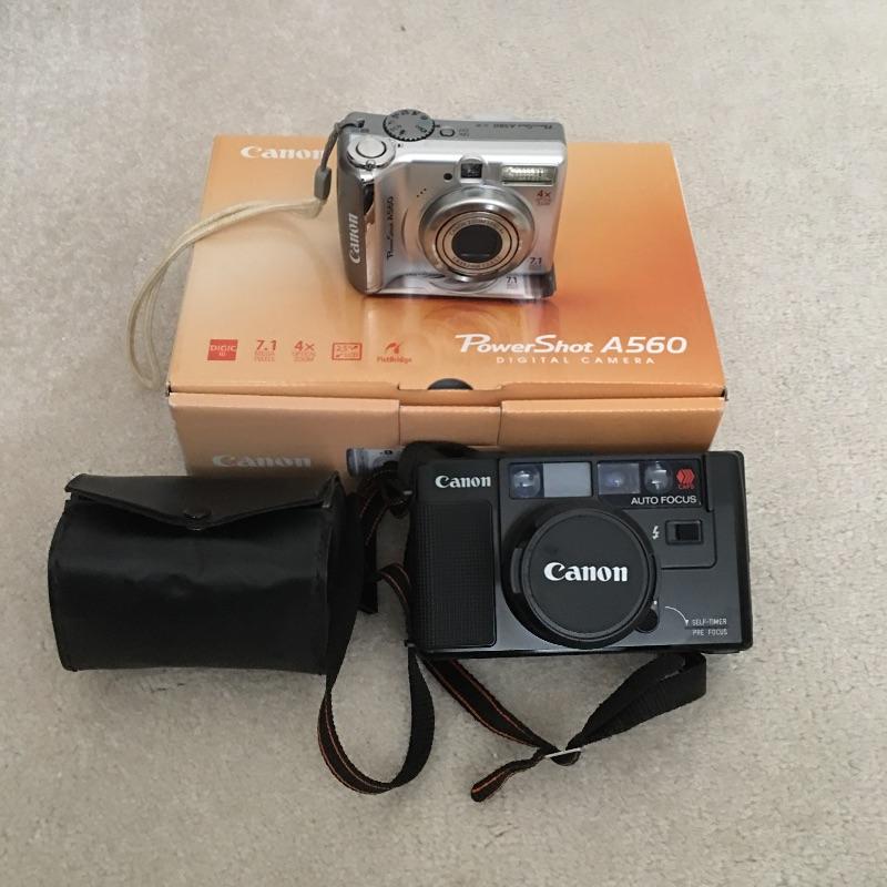Pair of Canon cameras includes a Power Shot A560 digital camera and a Canon AF35M film camera and two lenses by Nalcom. Capture your memories with this nice pair of cameras. Both camera's appear to work.