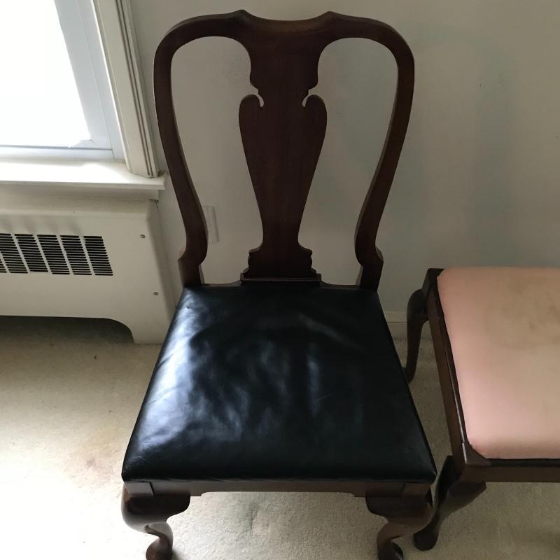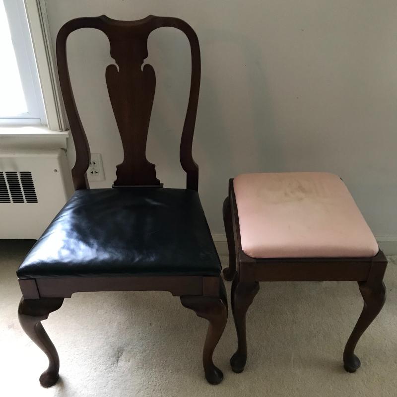 Lot includes unique chair and stool with similar wood color. Chair is approx. 22” x 19” x 38”. Stool is approx. 18.5” x 16.5” x 19.5” and stained on the top. No shipping available. Local pickup only in Asheville, NC.