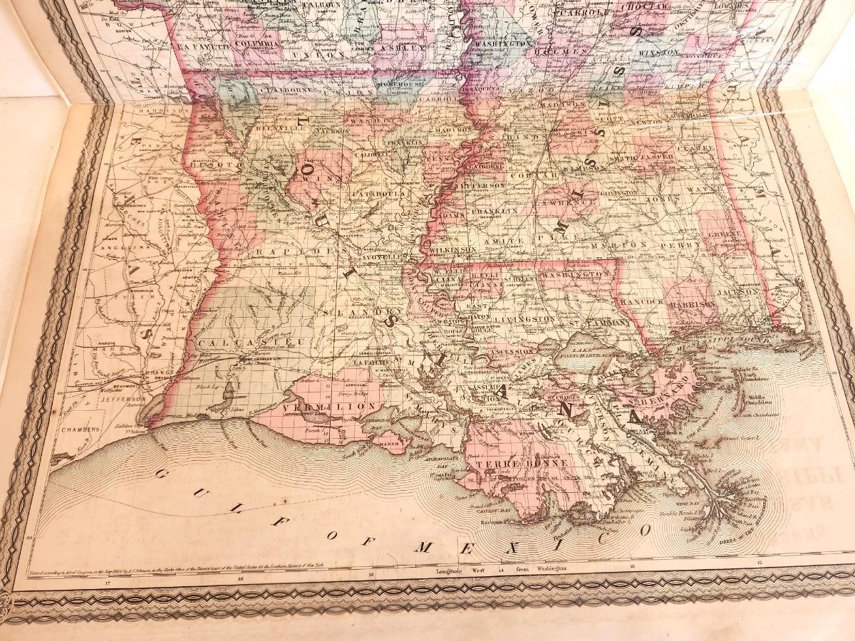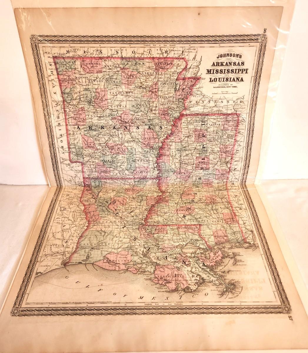 Johnson's Arkansas, Mississippi and Louisiana map - dated 1866 - 18" x 26" perfect for framing. Color excellent. Note the Louisiana map - many central Louisiana parishes not yet formed (Grant, etc.) and other boundaries yet to be changed. This one is a beauty.