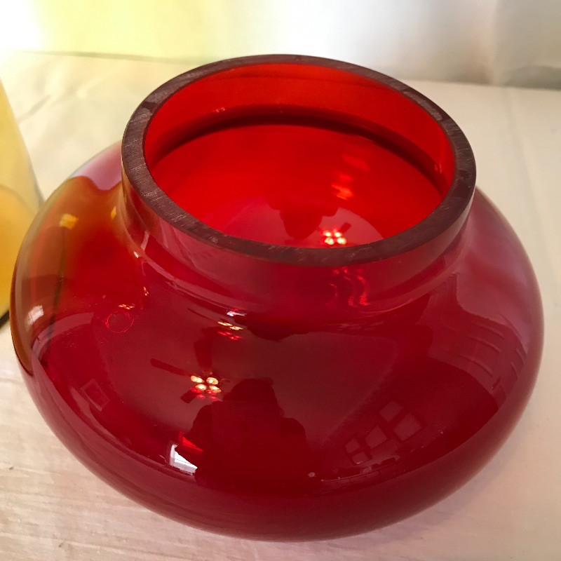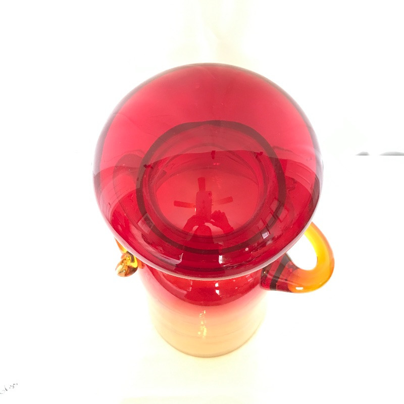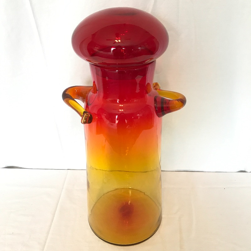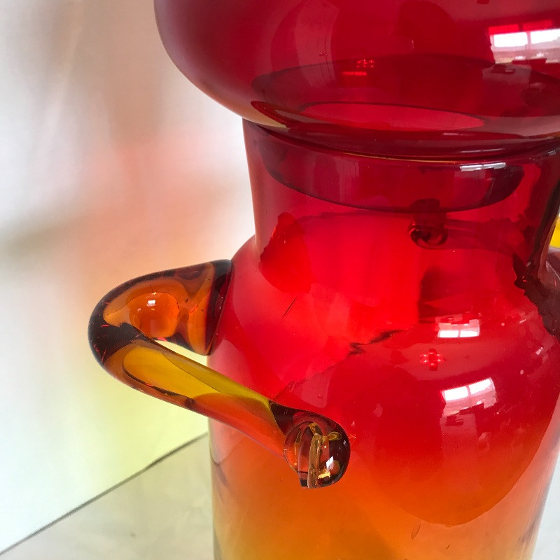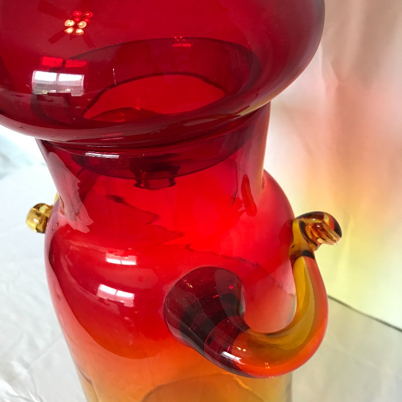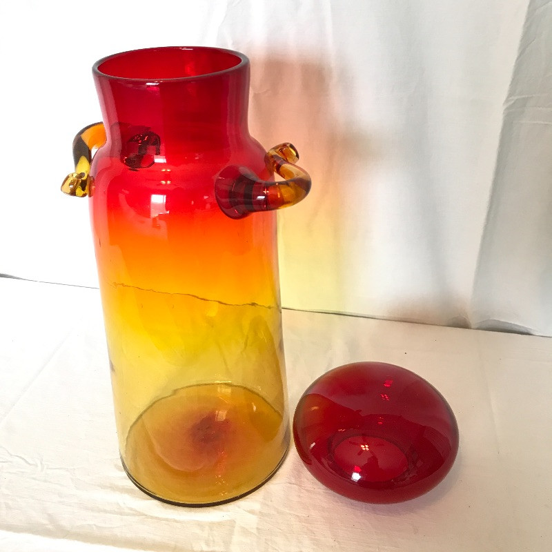 Very unique Blenko domed lidded jar by John Nickerson for Blenko. Red and yellow colors. Very large size makes a statement. 20” tall with 7” diameter. Shipping available. Please get UPS quote prior to bidding. 828-252-6930.