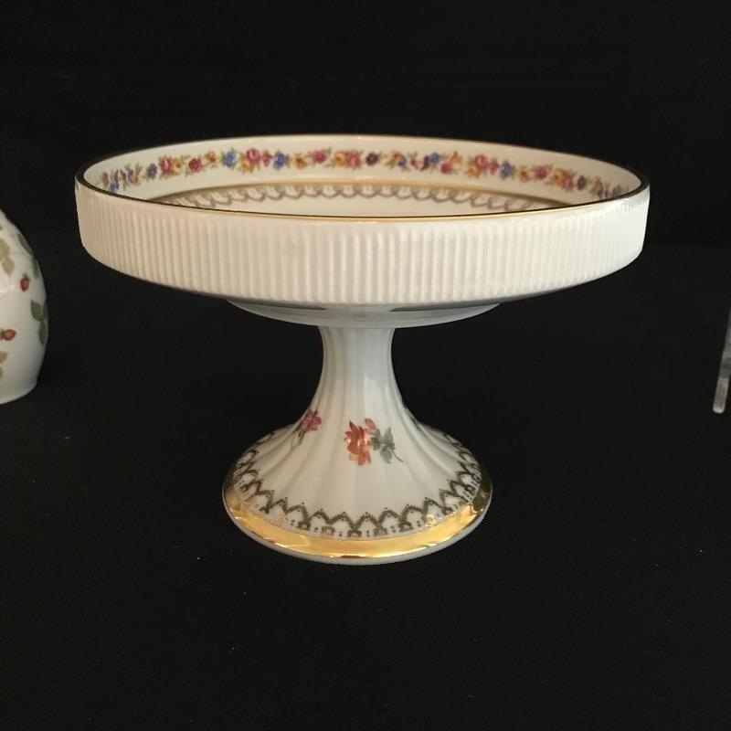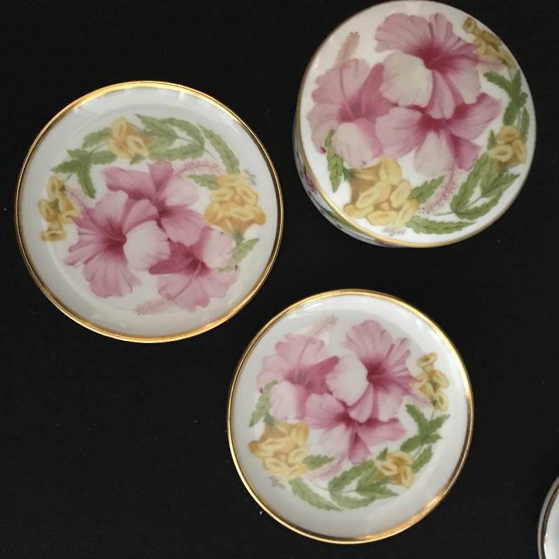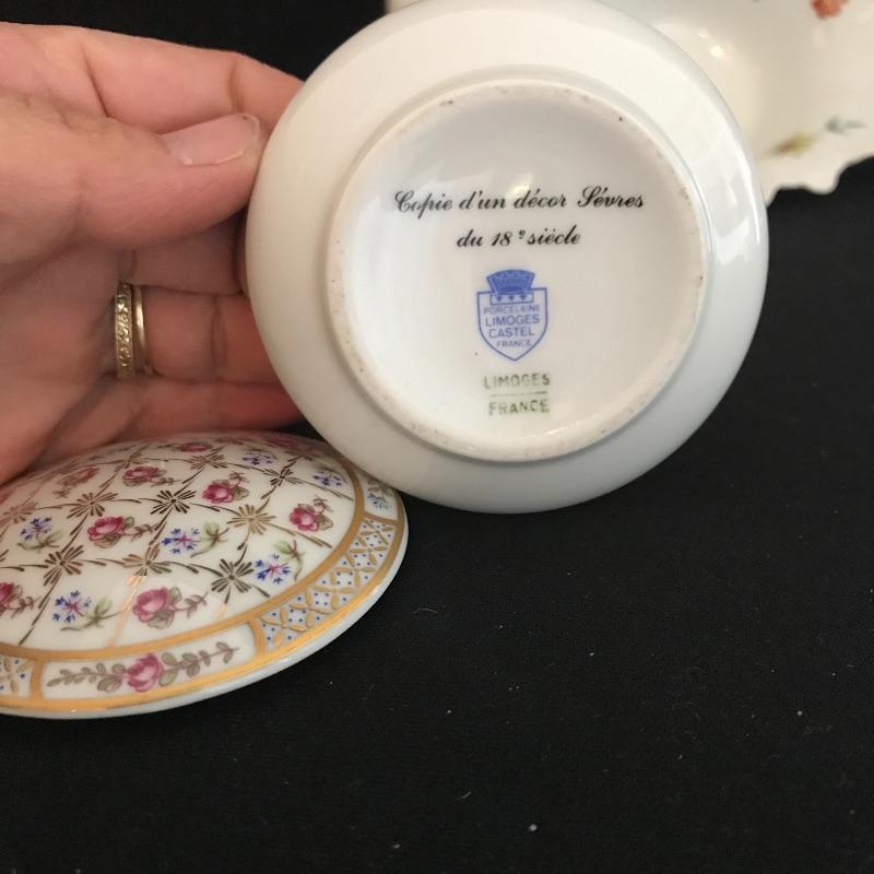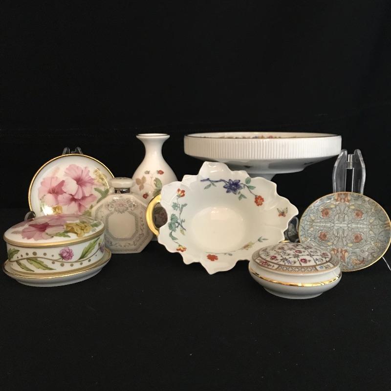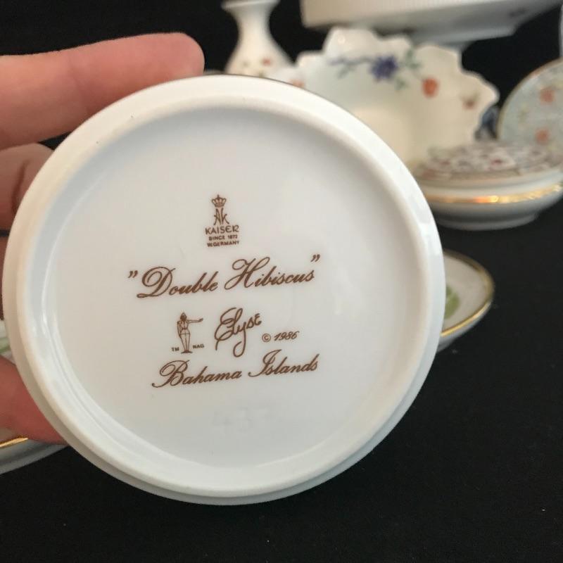 Charming collection of various styles of china. Name brands include Haviland Limoges, Wedgwood and Lenox. All pieces are in great condition. The “Double Hibiscus” Elyse powder box measures approximately 3”d x 2” and has two matching plates. The Pedestal China dish is 7.5” x 5”. See images for all stamps and makers.