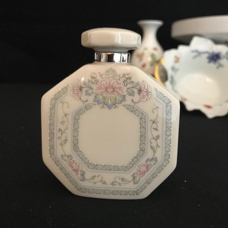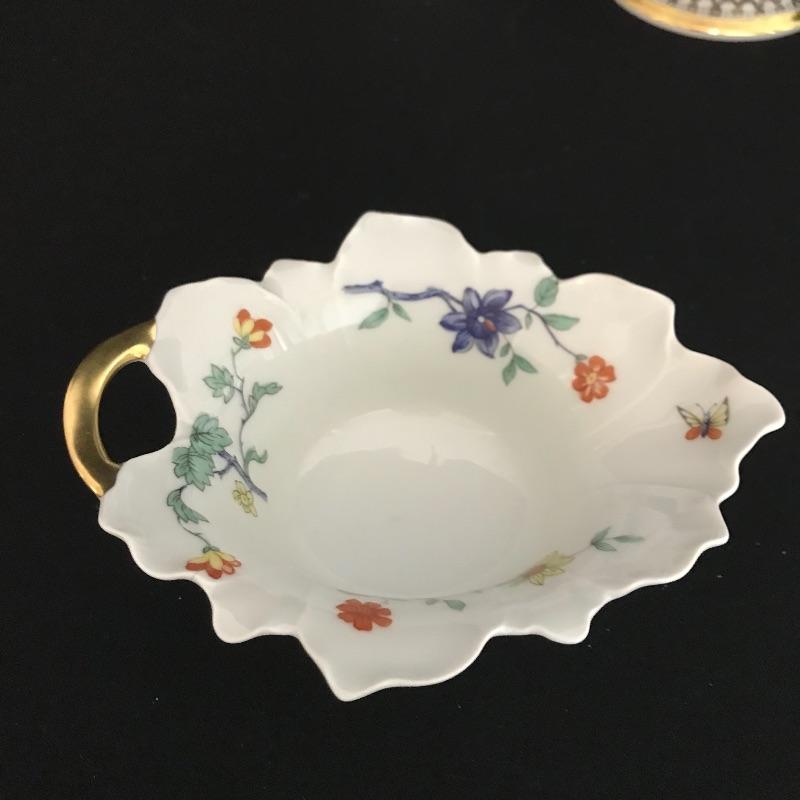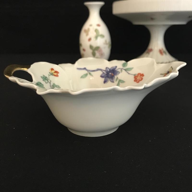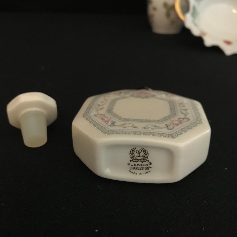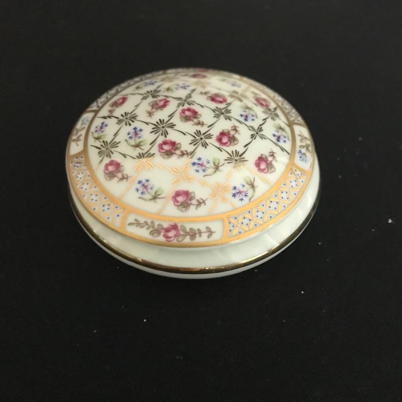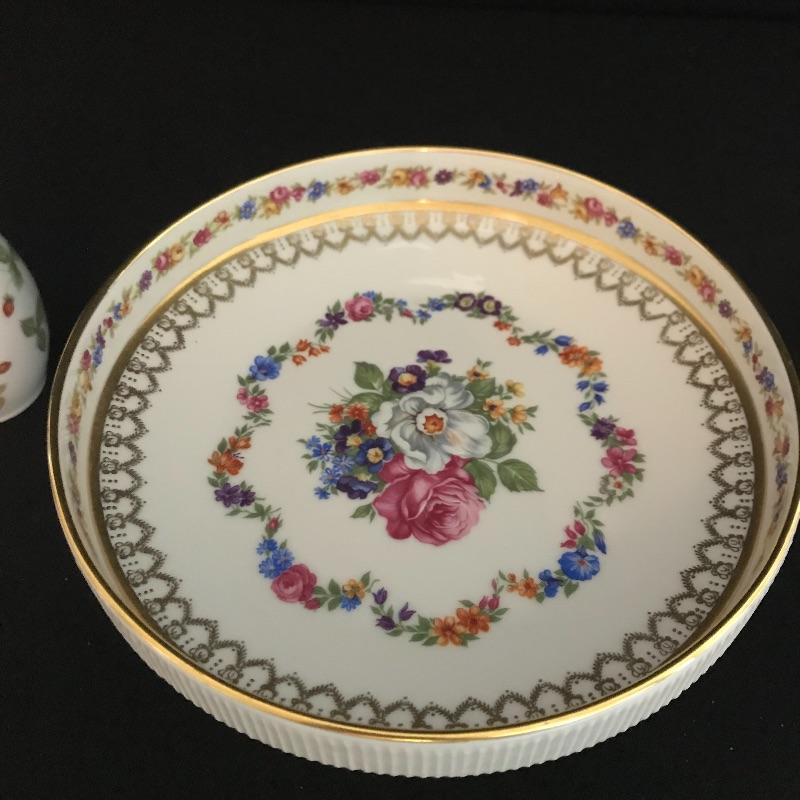 Charming collection of various styles of china. Name brands include Haviland Limoges, Wedgwood and Lenox. All pieces are in great condition. The “Double Hibiscus” Elyse powder box measures approximately 3”d x 2” and has two matching plates. The Pedestal China dish is 7.5” x 5”. See images for all stamps and makers.
