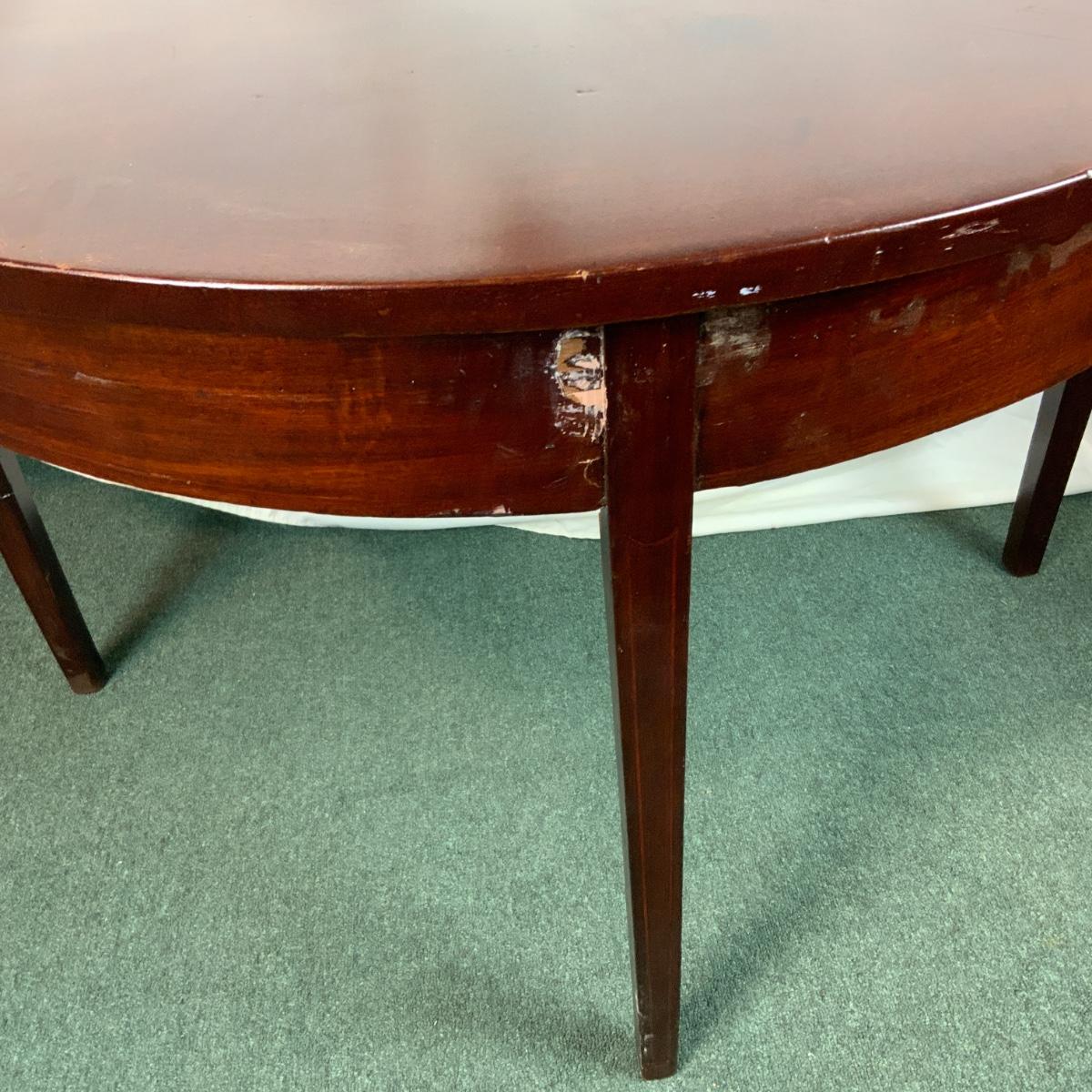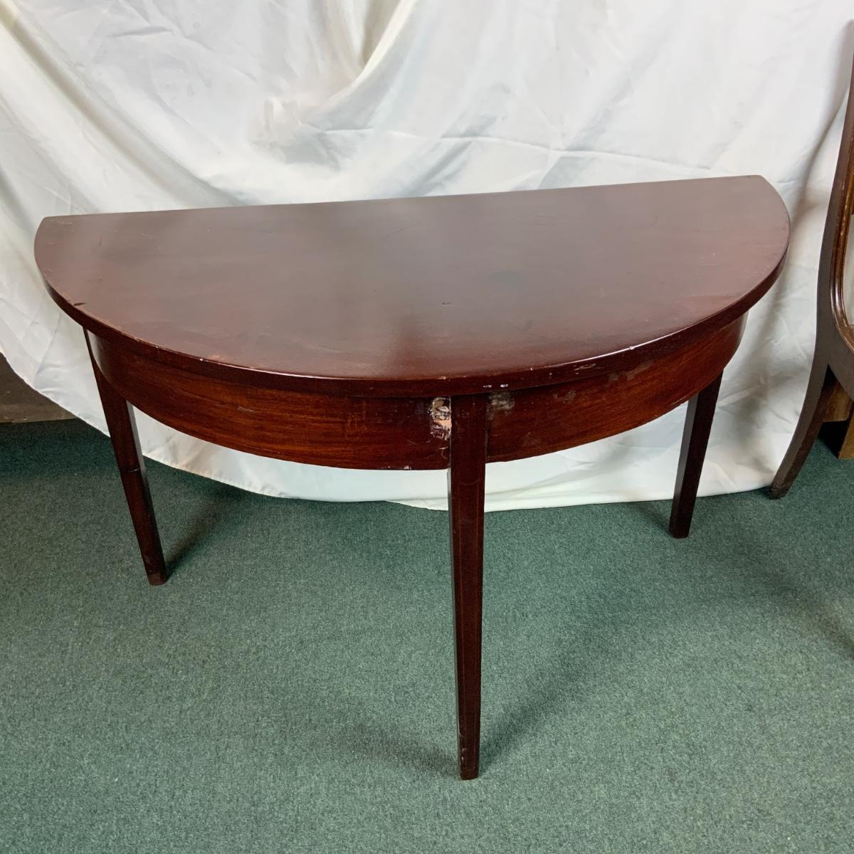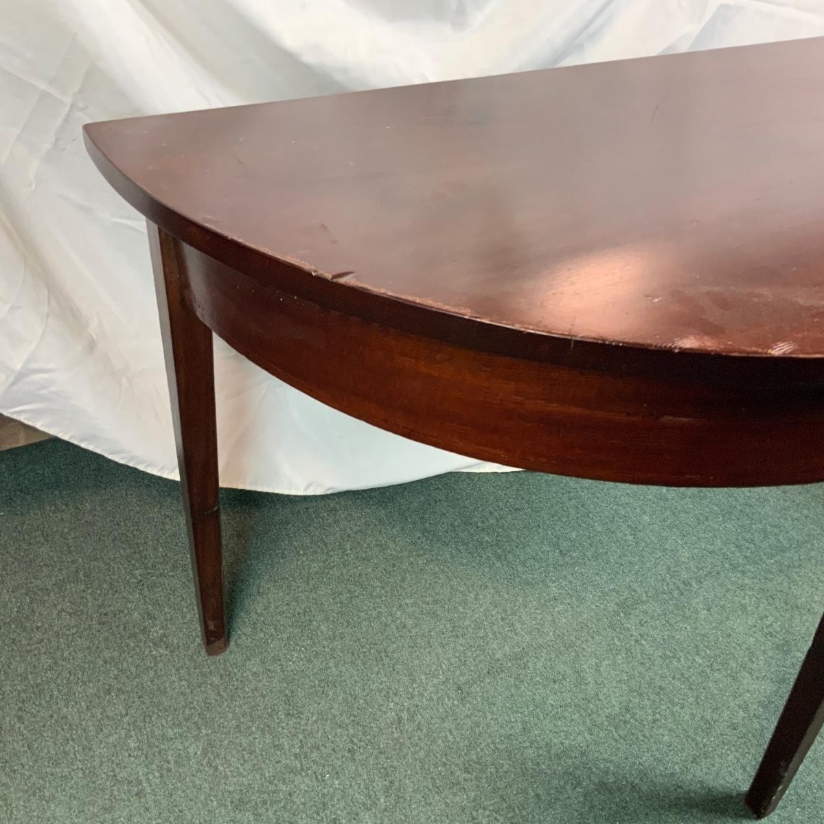 Mahogany half table. This is a commonly requested and highly sought after item. If you can do a little restoration work, you could be one of the lucky ones that has a half table. //::\\ Please see photos for details and condition. No attempt has been made to hide any imperfections. All items listed in this auction are warehouse items, and need to be cleaned. A majority of the items need restoration as well. All items are sold AS IS and WITHOUT GUARANTEE. If you are uncertain about an item, DO NOT BID. Due to the nature of this online auction in-person inspection is HIGHLY recommended. All Sales are FINAL. Pick Up Times are FIRM. Please confirm with your own schedule that you can pick up in the scheduled times listed in the Terms and Conditions. Any questions please message the auctioneer. DO NOT Contact The Harp Gallery.