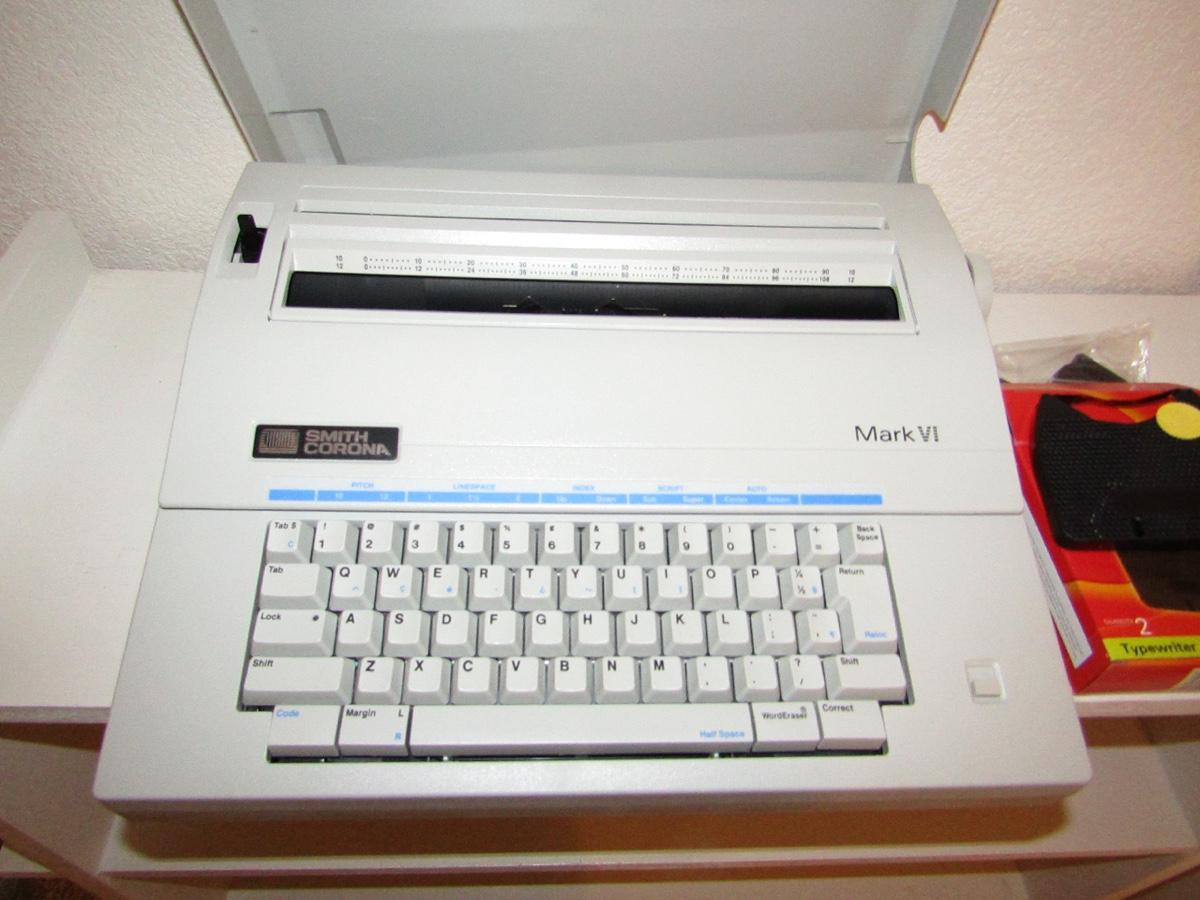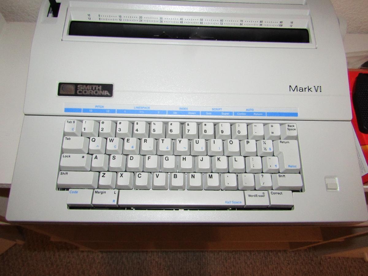 SMITH CORONA MARK VI ELECTRIC PORTABLE TYPEWRITER. CLOSE TOP. COMES WITH EXTRS TOMER CARTRIDGE.