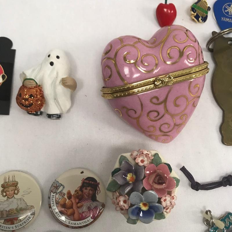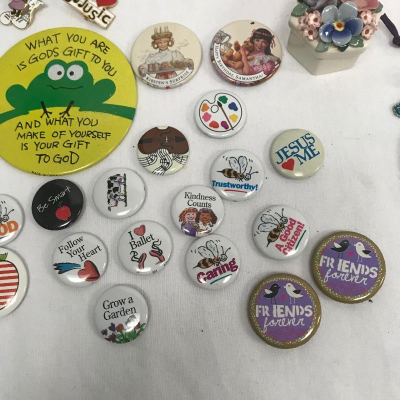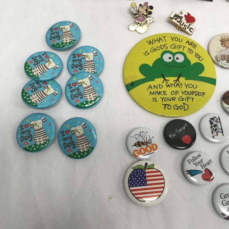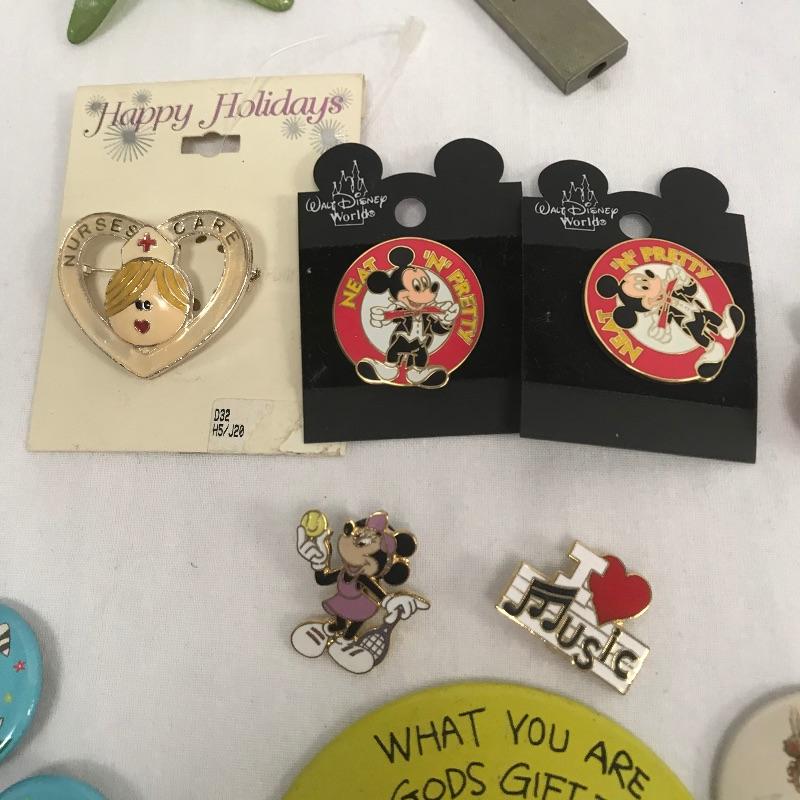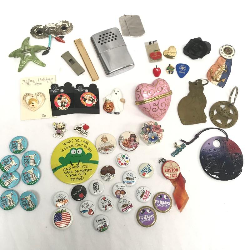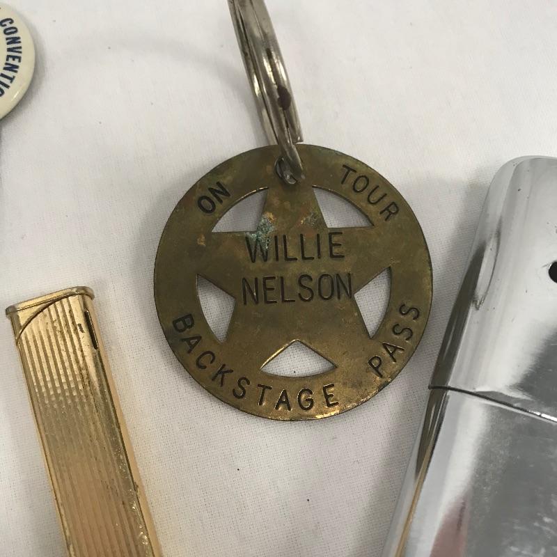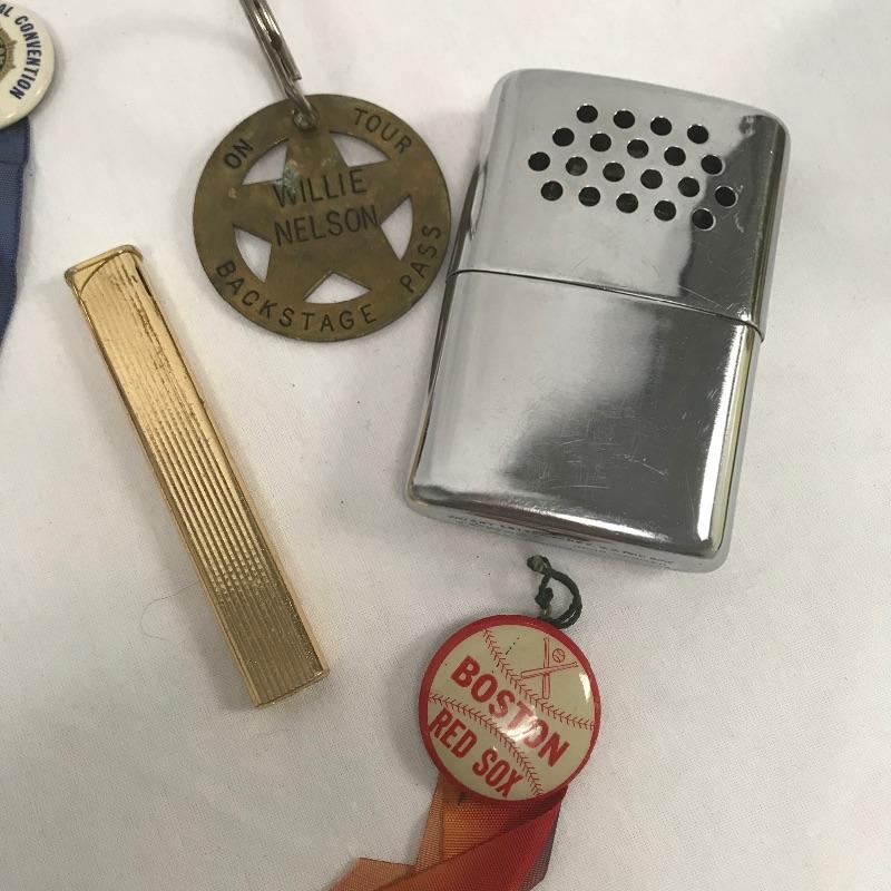 Neat lot with lots of Collectables. Lot features a Willie Nelson metal back stage pass, an Aladdin Labs Hans Warmer with vintage lighter and cutter. Lot also contains button pins, Disney Pins, band and teacher pins and even a vintage Red Sox pin. Hair clips and guitars pics included. See photos.