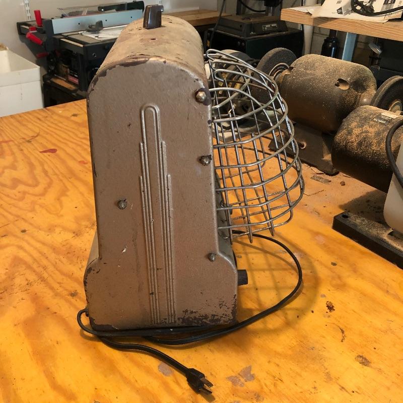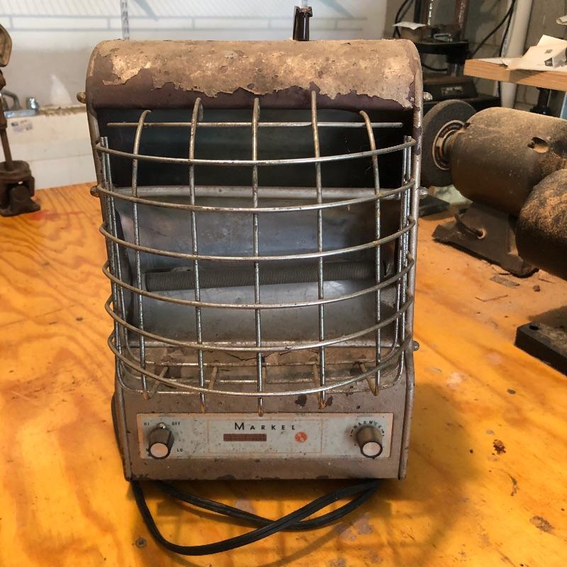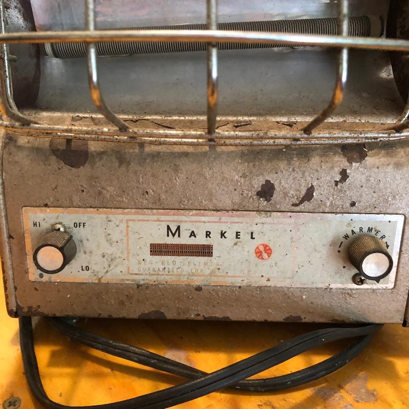 This vintage Markel heater appears to work. It turns on and heats up. It would benefit from a good cleaning. The handle on top of heater is broken. Measures 14"H x 9.5"W x 7.5"D