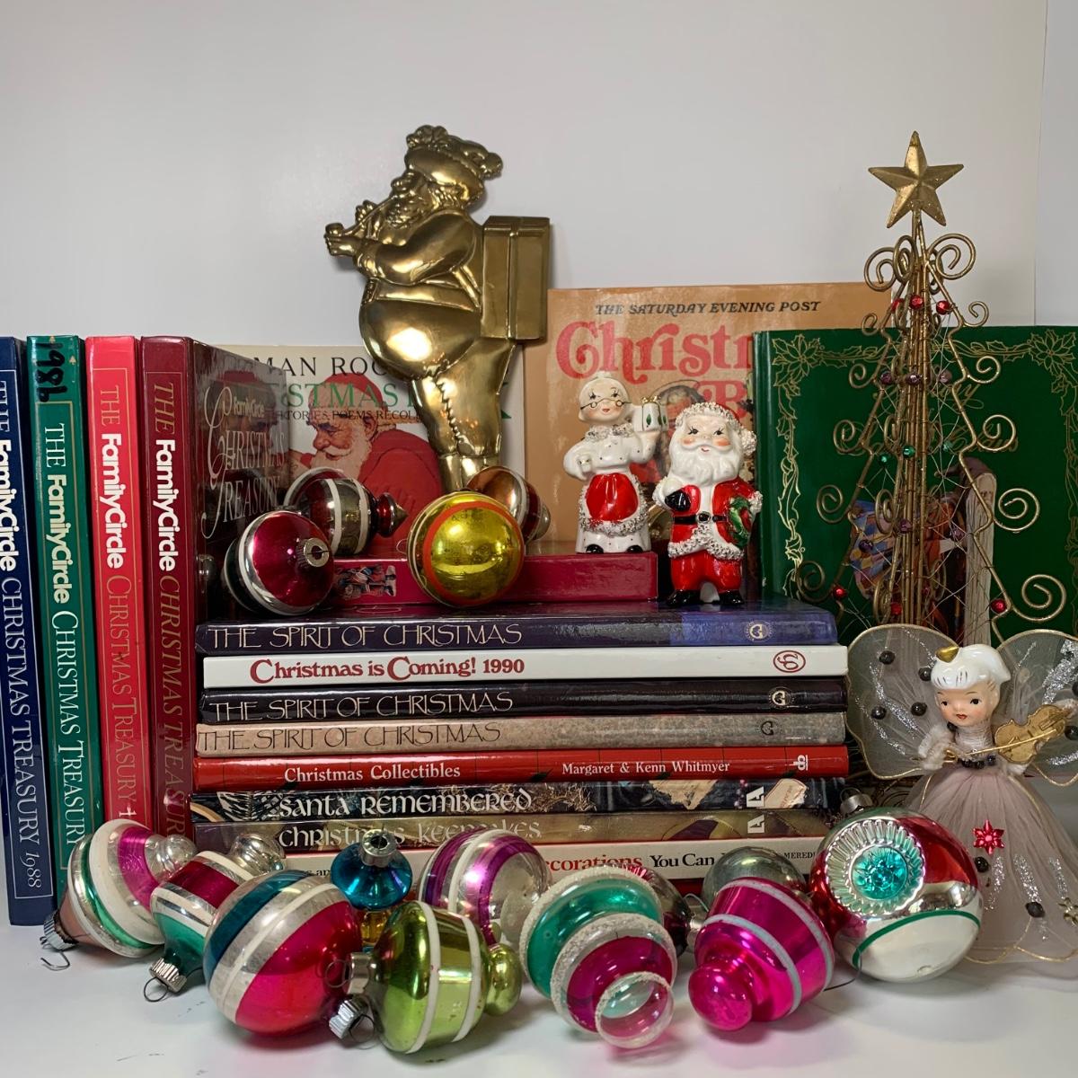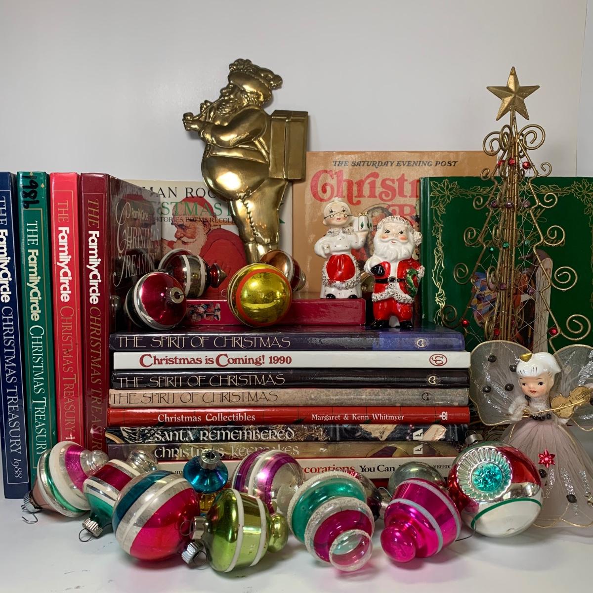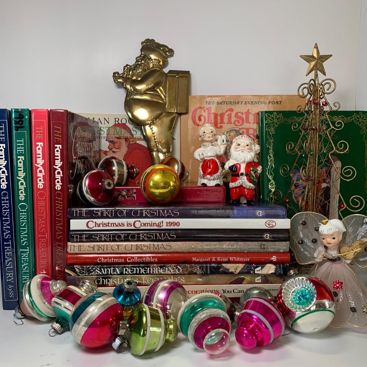 Includes vintage Christmas balls, Family Circle Christmas Treasury books, 'The Spirit of Christmas' books and more.