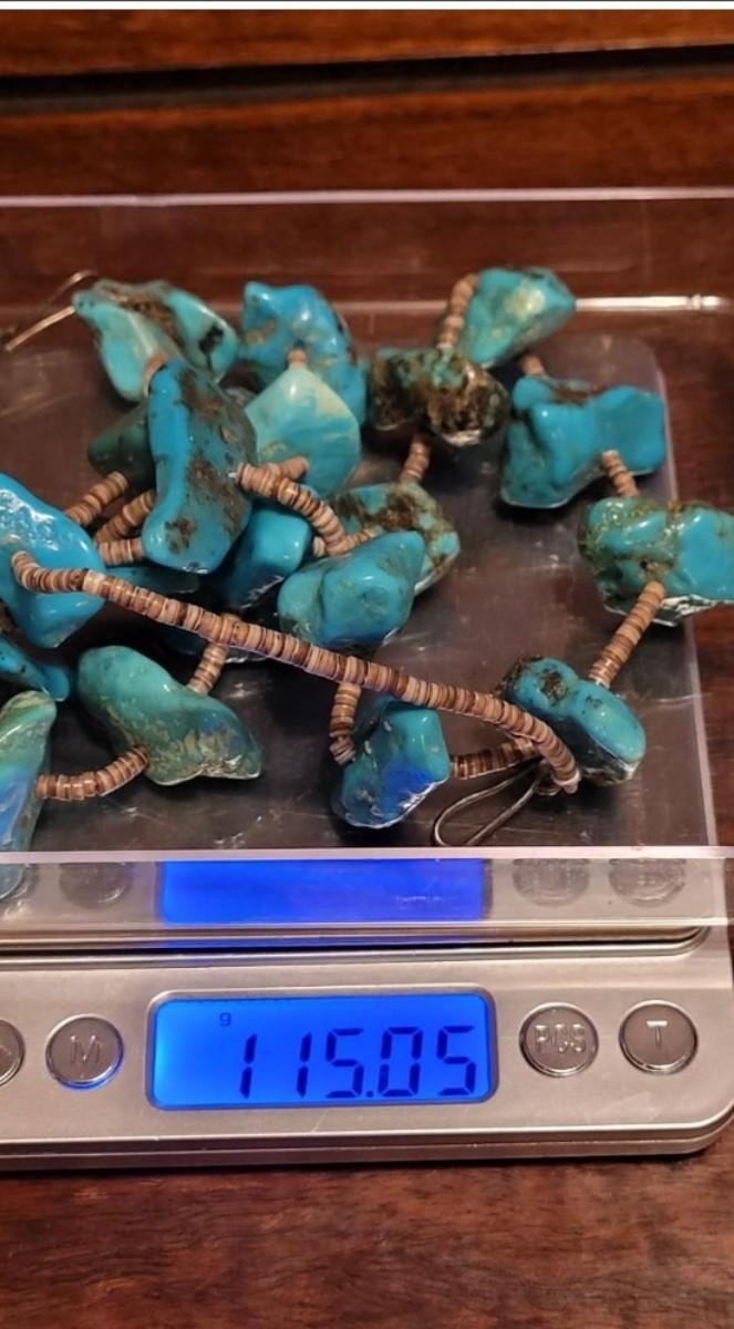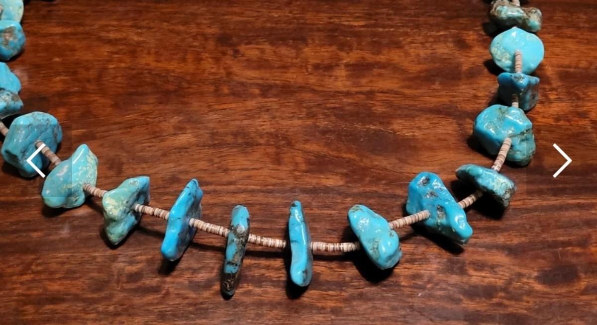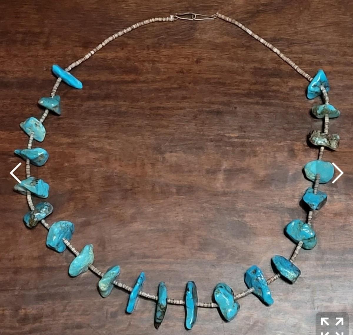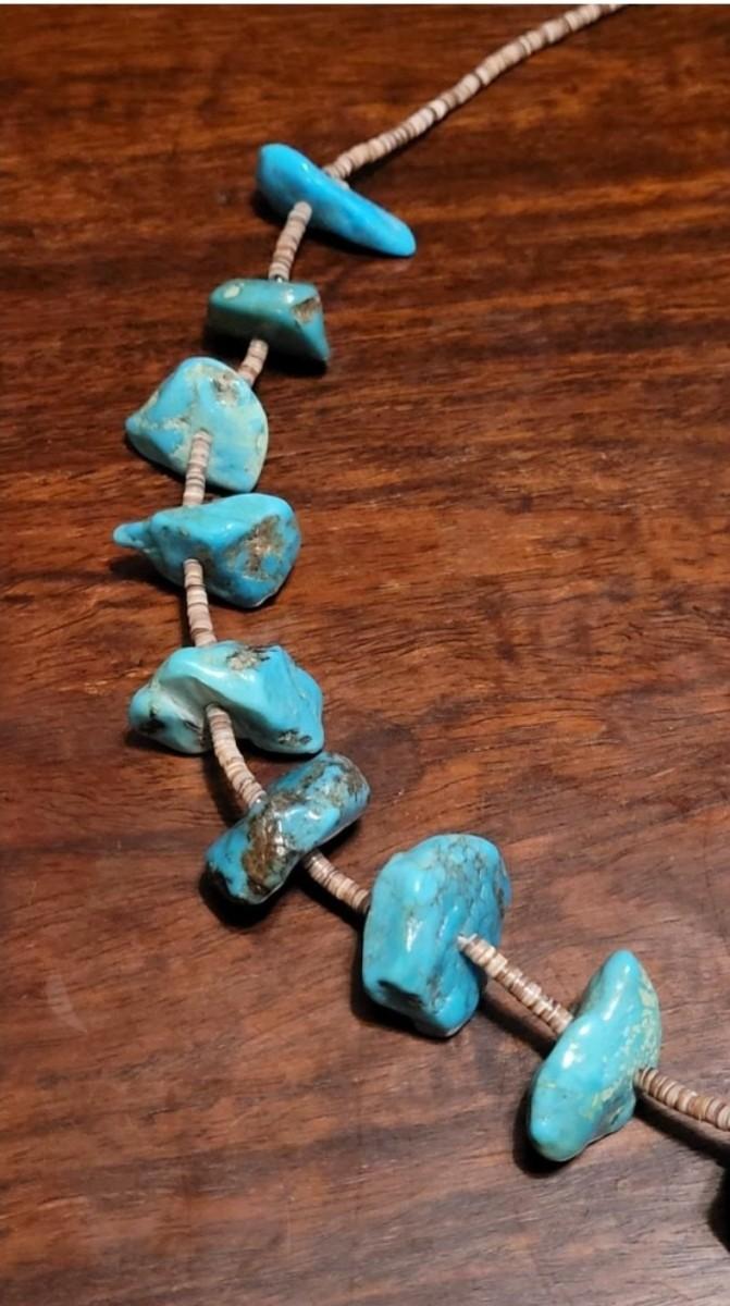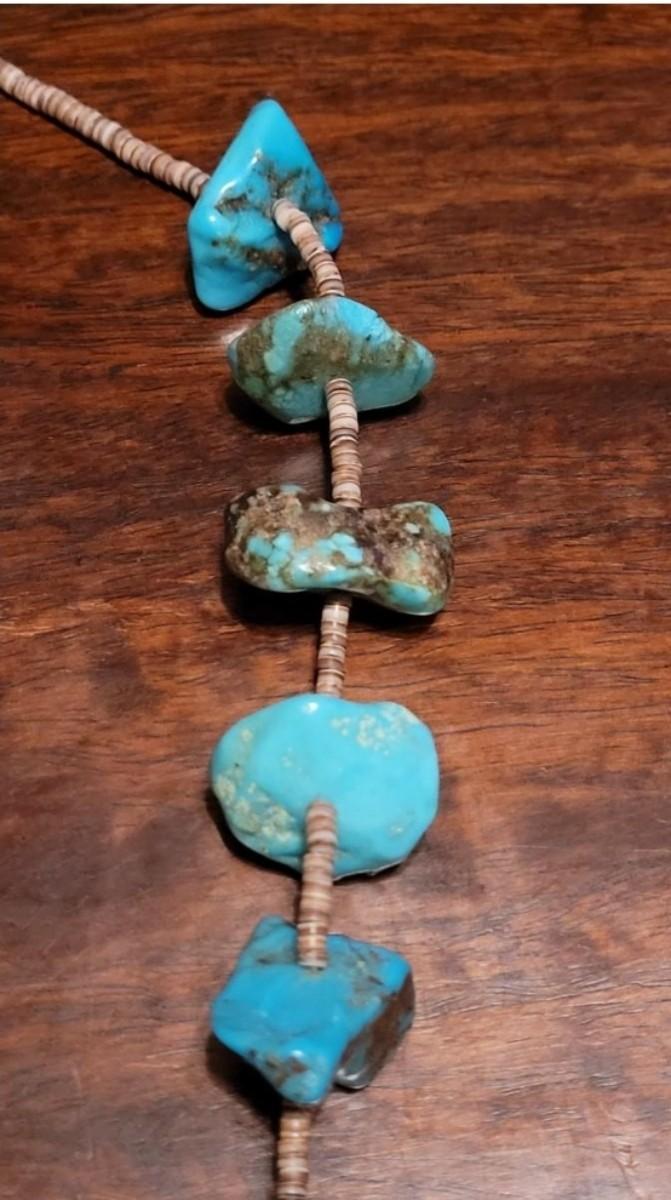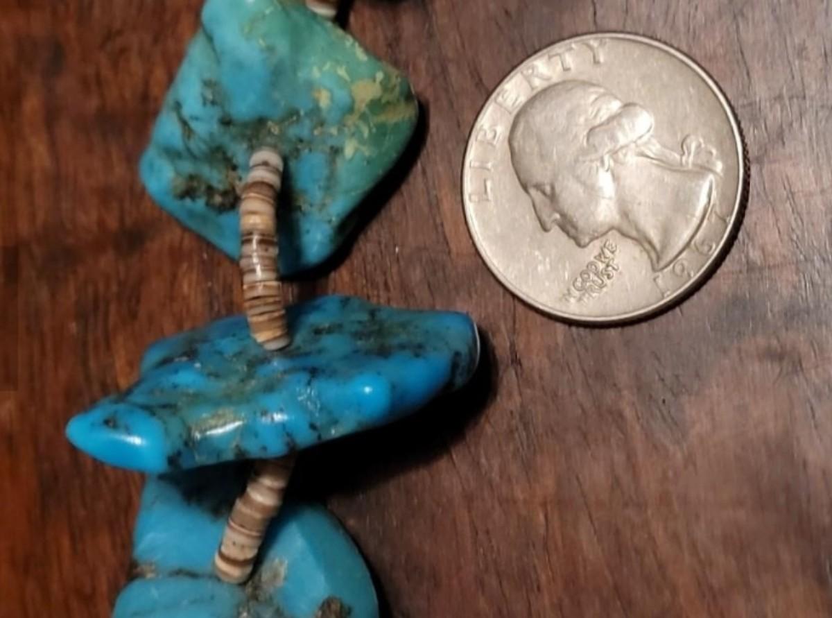 This beautiful Santo Domingo necklace is 29.5" long. The turquoise comes from the Royston turquoise mines paired with shell heishi beads. The stones are around the size of a quarter. True statement piece.