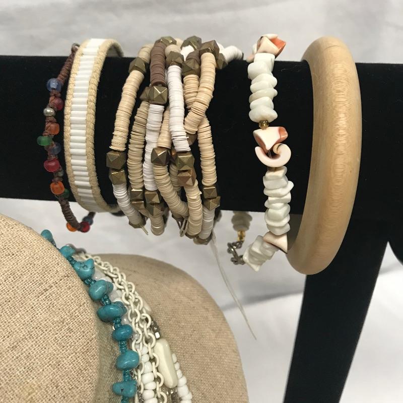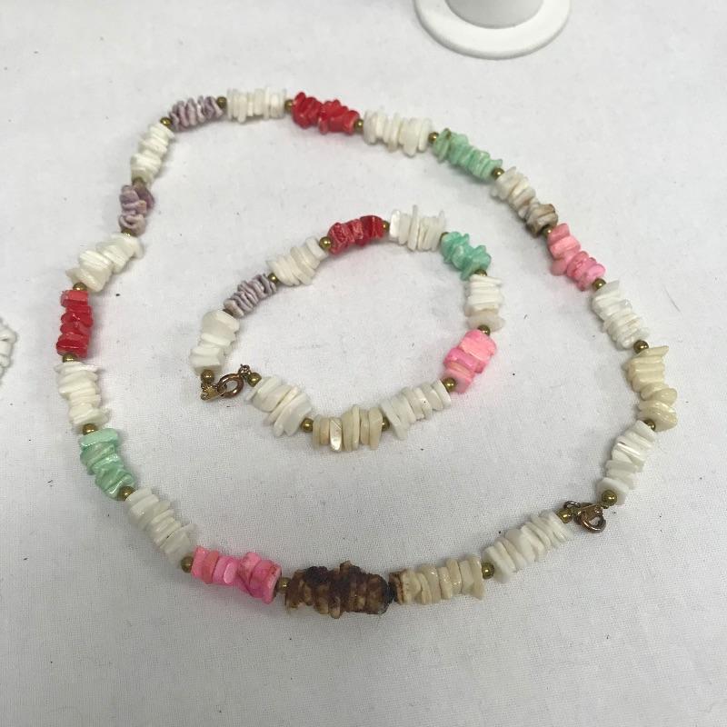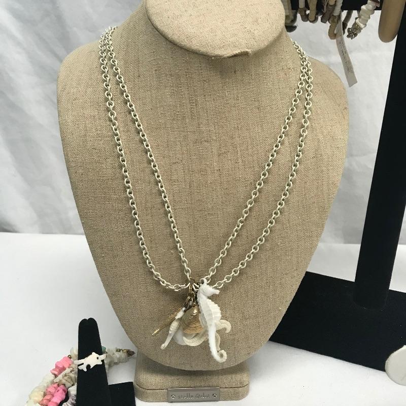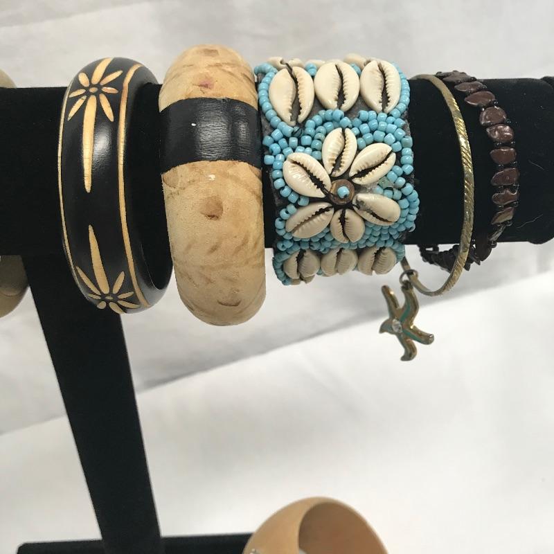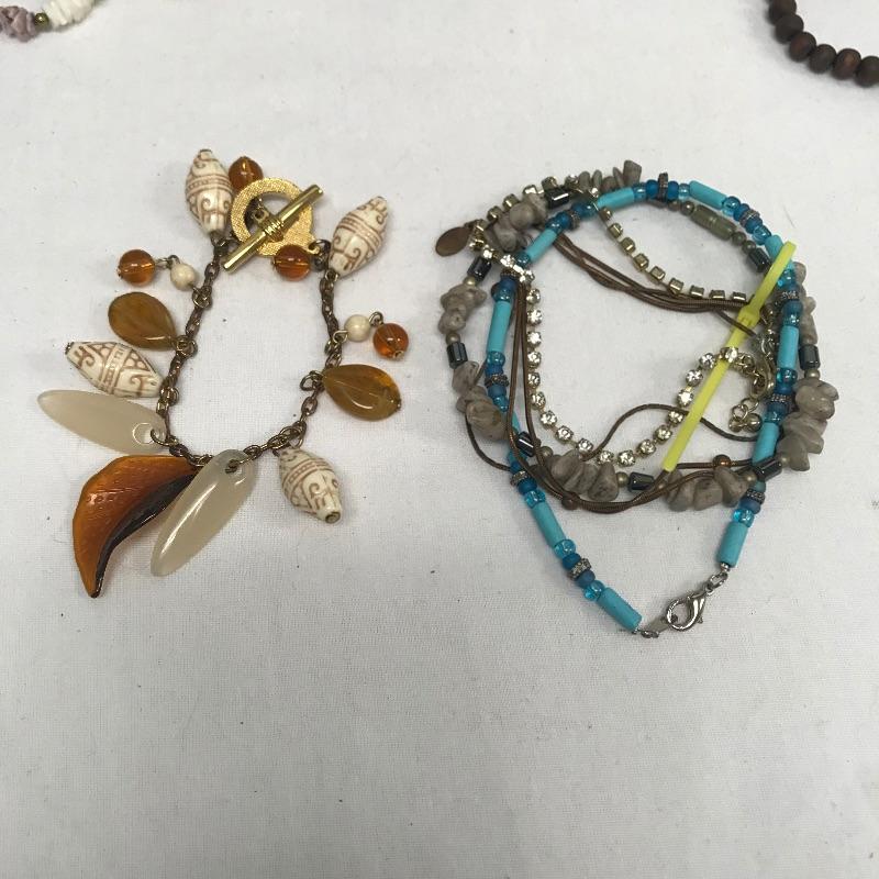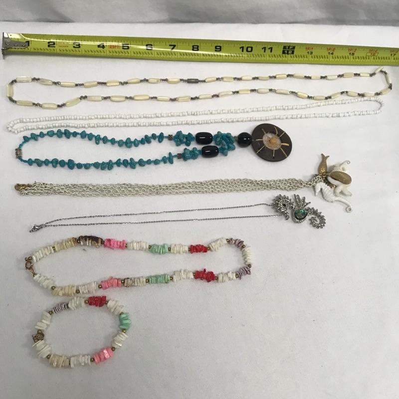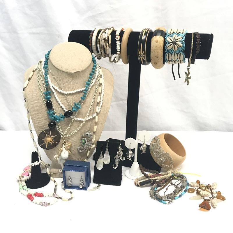 Fun lot full of tropical feelings! Pieces include wood, shell, and more. There is a photo with a yellow zip tie. Those zip tied appear to be anklets while the bracelet next to it is made for a petit wrist. The other bracelets in lot are of average size. Three pairs of earrings are marked 925, the pearly seahorse boxed pair are stainless steel. There is one necklace/bracelet set that needs to be cleaned. See photos.