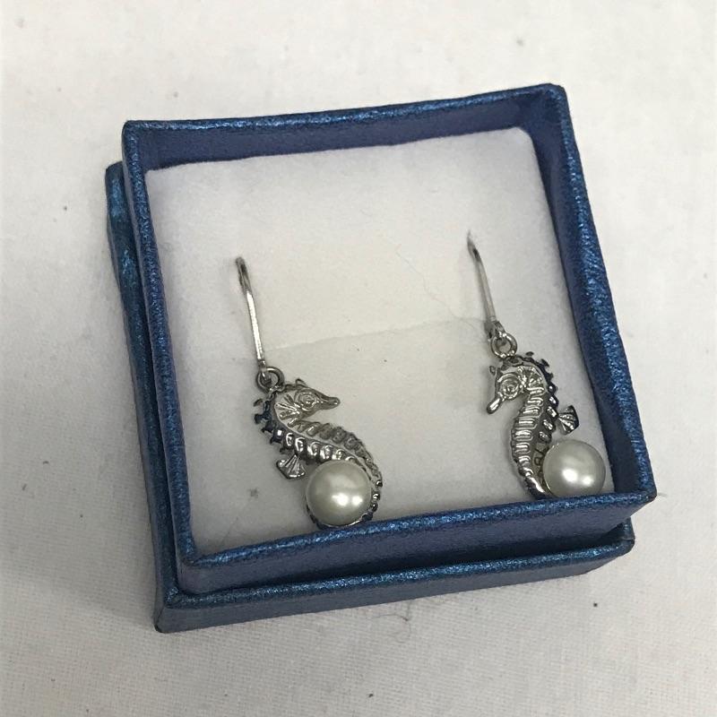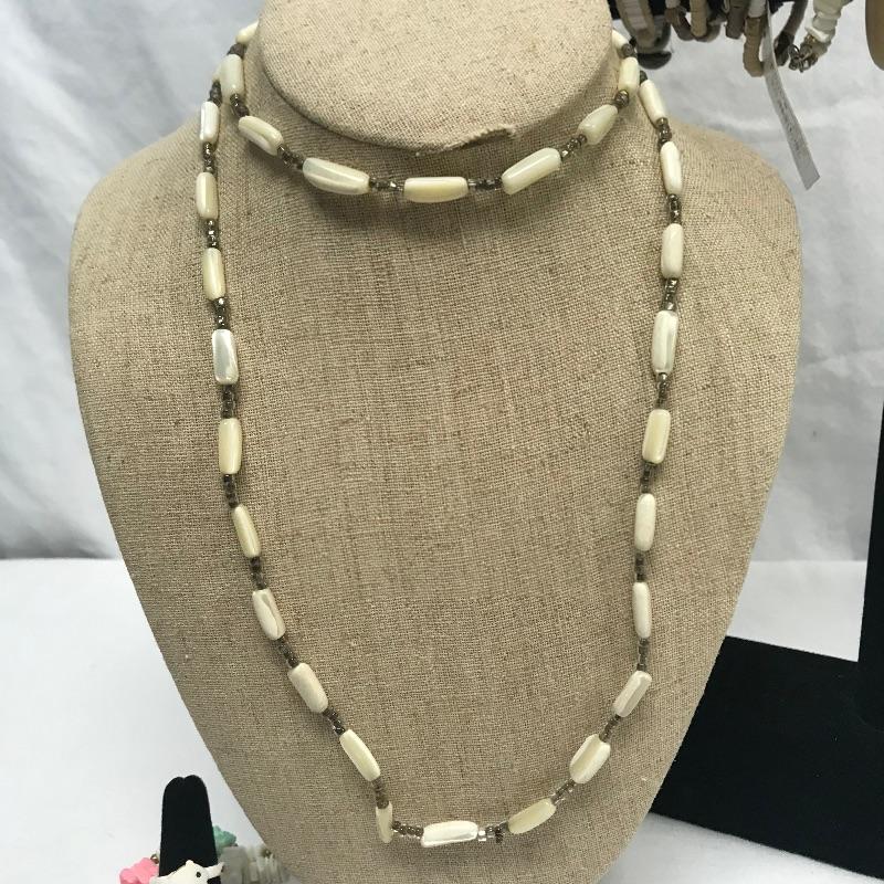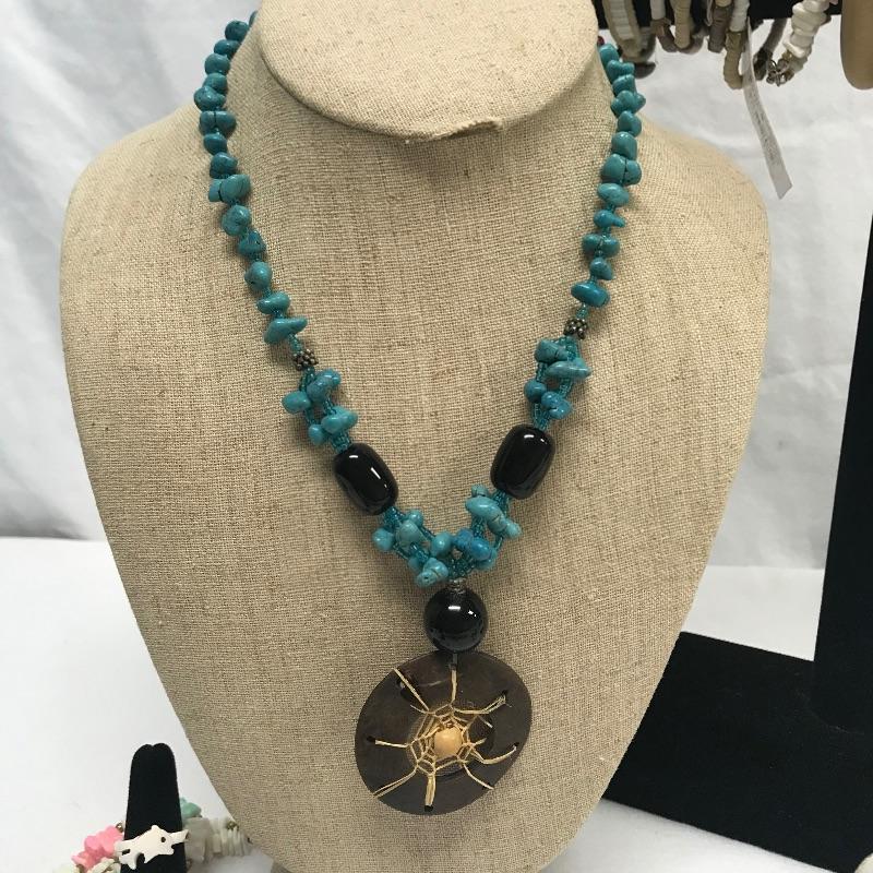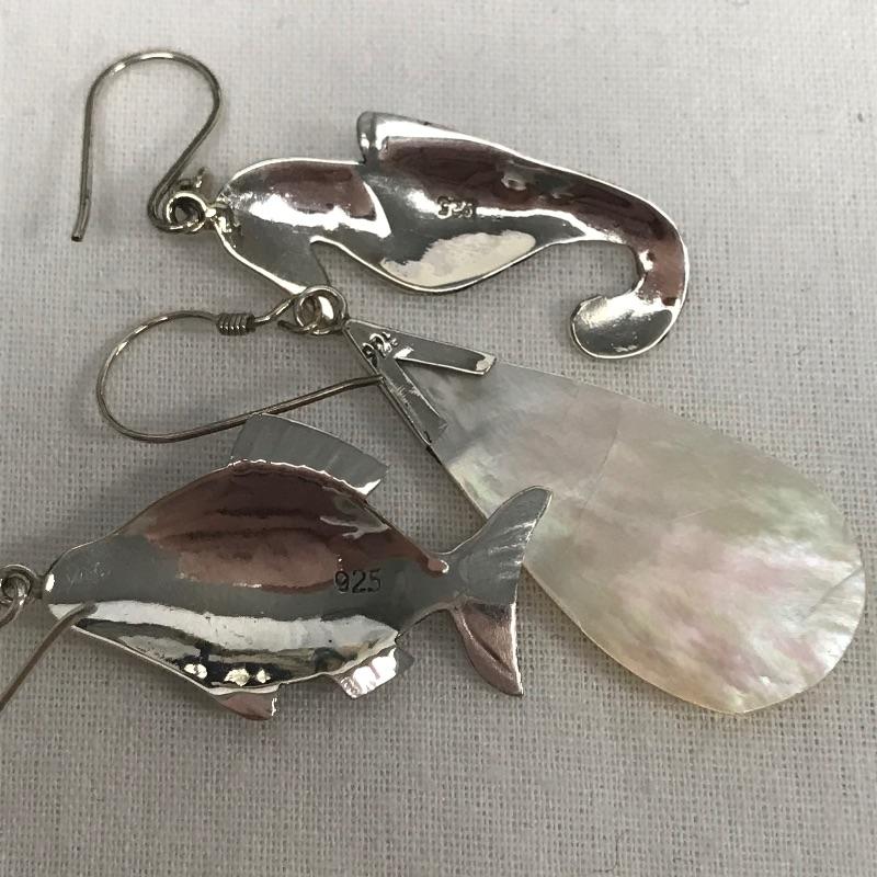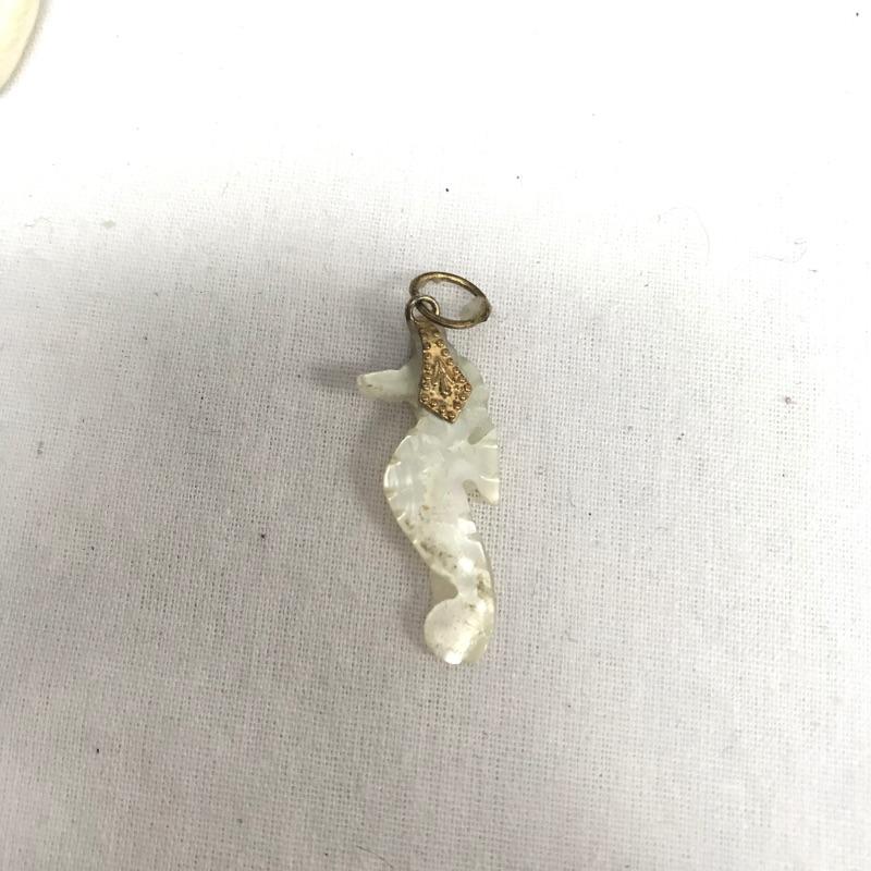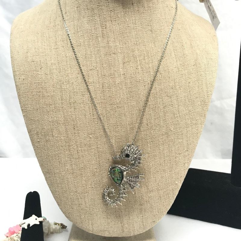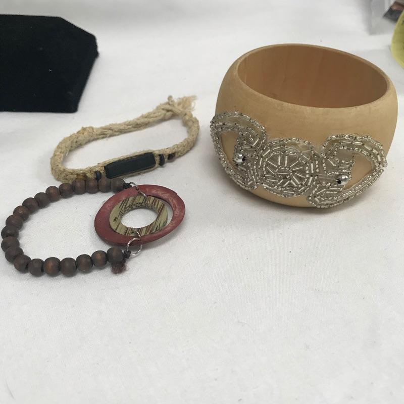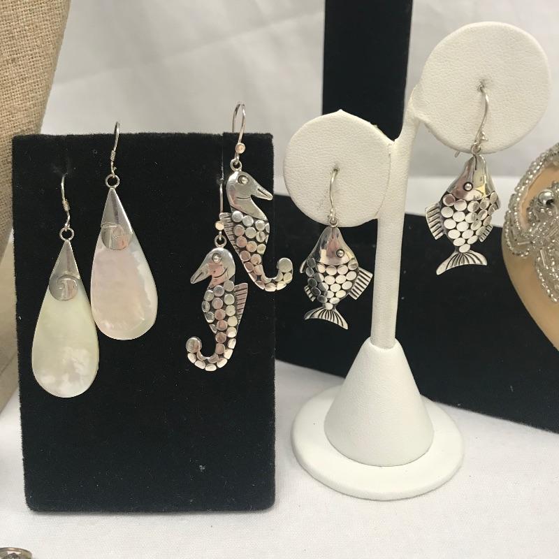 Fun lot full of tropical feelings! Pieces include wood, shell, and more. There is a photo with a yellow zip tie. Those zip tied appear to be anklets while the bracelet next to it is made for a petit wrist. The other bracelets in lot are of average size. Three pairs of earrings are marked 925, the pearly seahorse boxed pair are stainless steel. There is one necklace/bracelet set that needs to be cleaned. See photos.