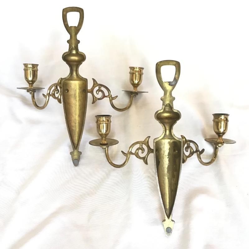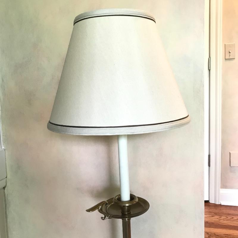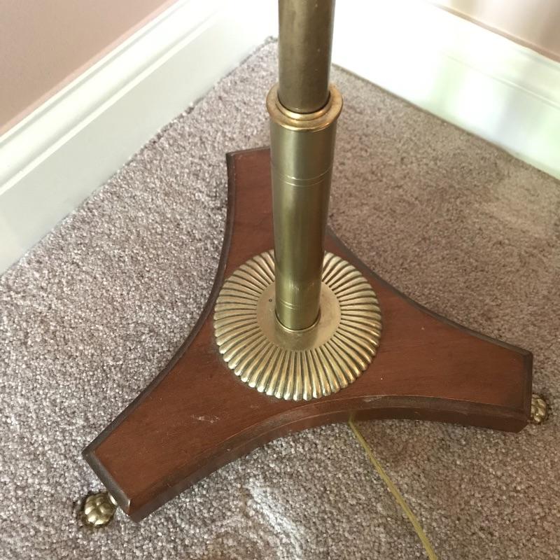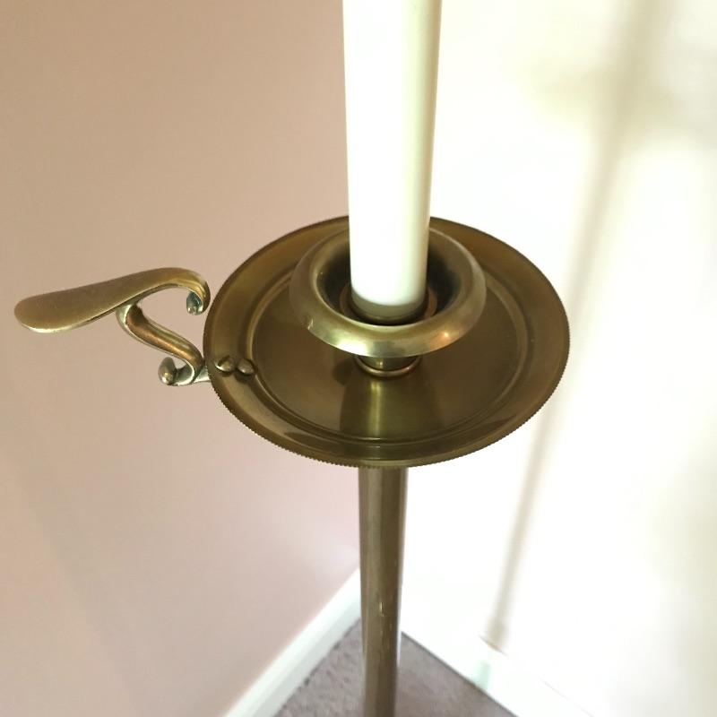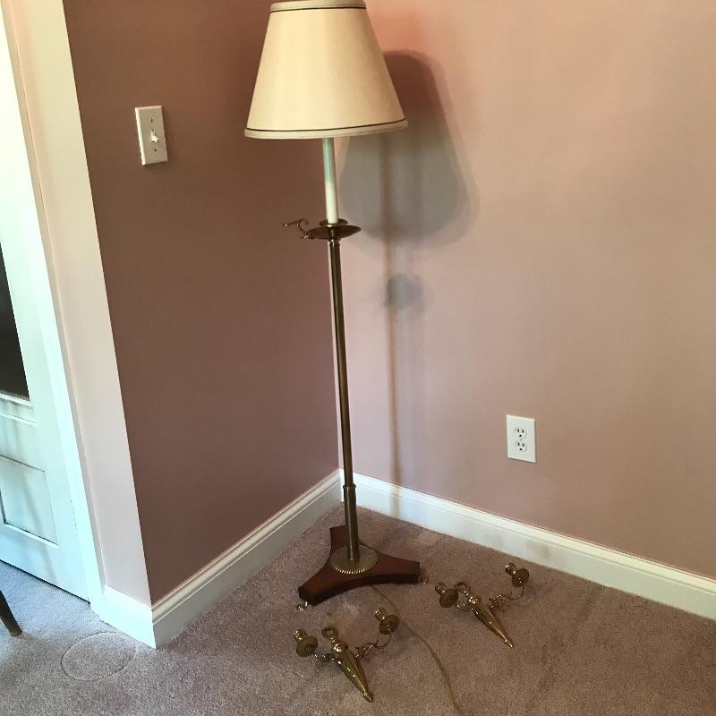 This tall vintage floor lamp has a candle holder-like body with a wood base and claw feet. Lamp measures 56” tall with a cream colored shade in nice classic shape. The lamp turns on when plugged in and is accompanied by two matching candle holder sconces. Sconces measure approximately 10” x 10.5”.