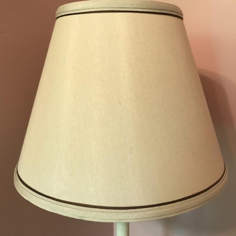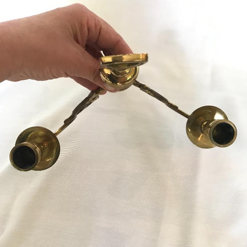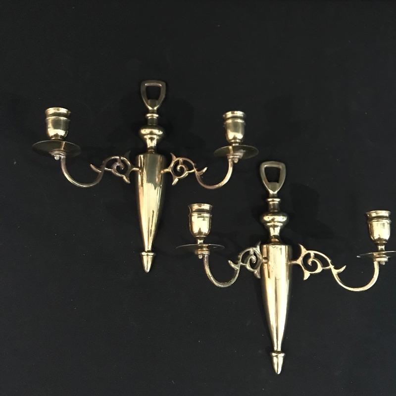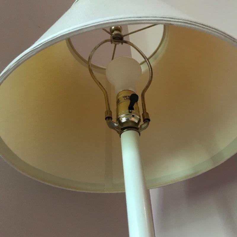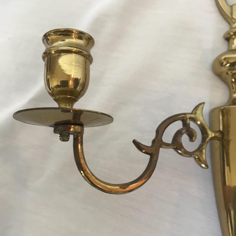 This tall vintage floor lamp has a candle holder-like body with a wood base and claw feet. Lamp measures 56” tall with a cream colored shade in nice classic shape. The lamp turns on when plugged in and is accompanied by two matching candle holder sconces. Sconces measure approximately 10” x 10.5”.