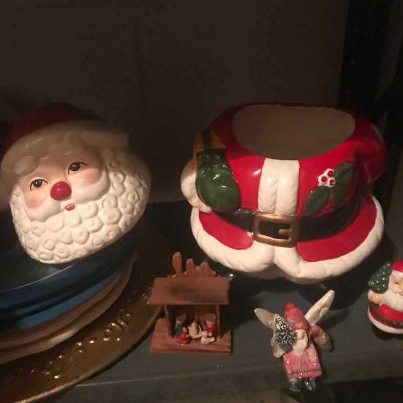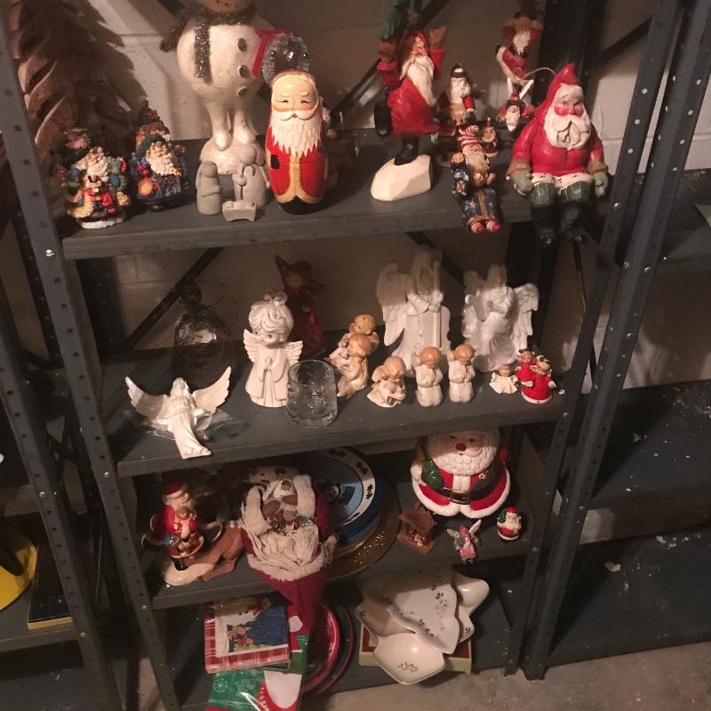 This lot includes holiday figurines of Santa, snowman, nativity, angels, and more. Holiday plates and serving pieces, as well as plastic and paper products that are still in packages. Local pick up only.