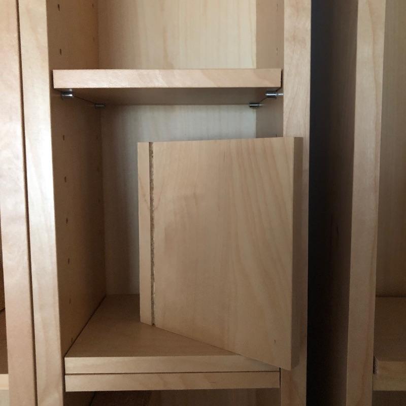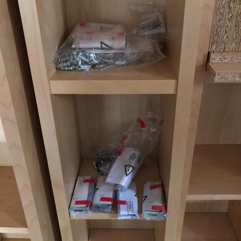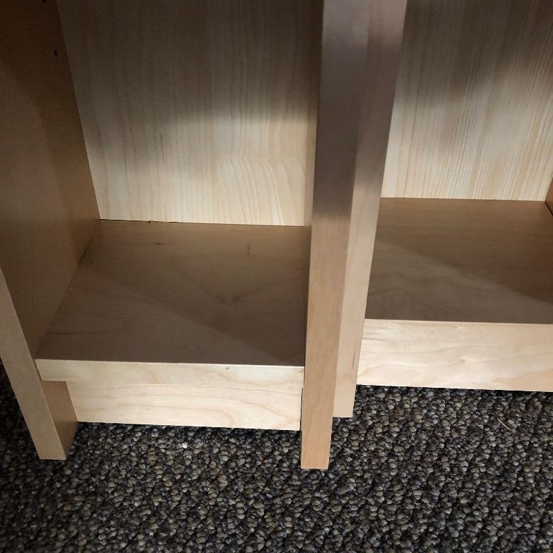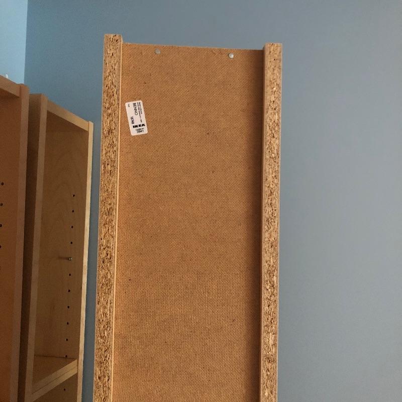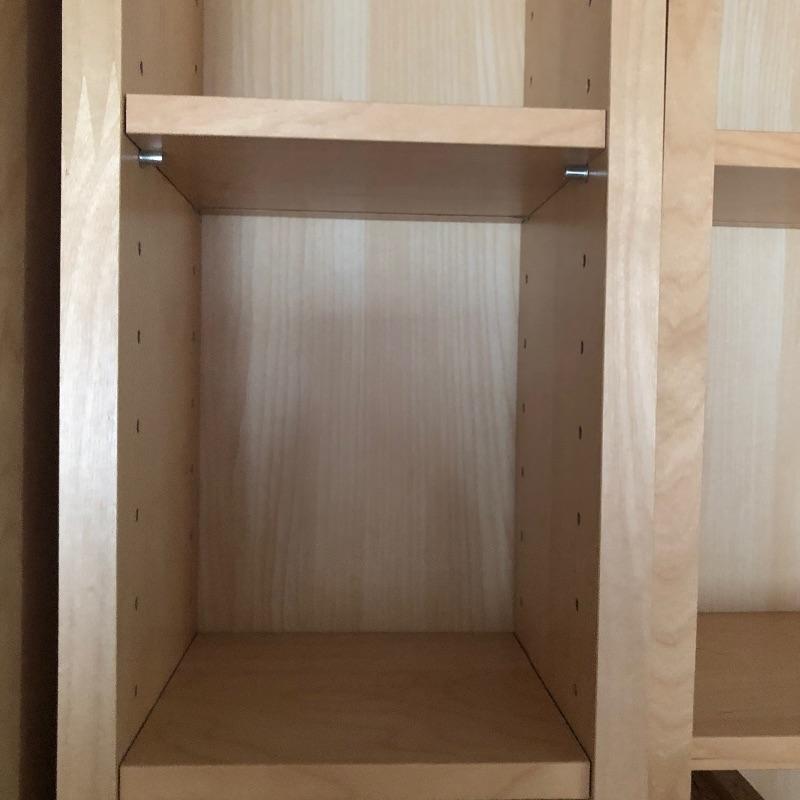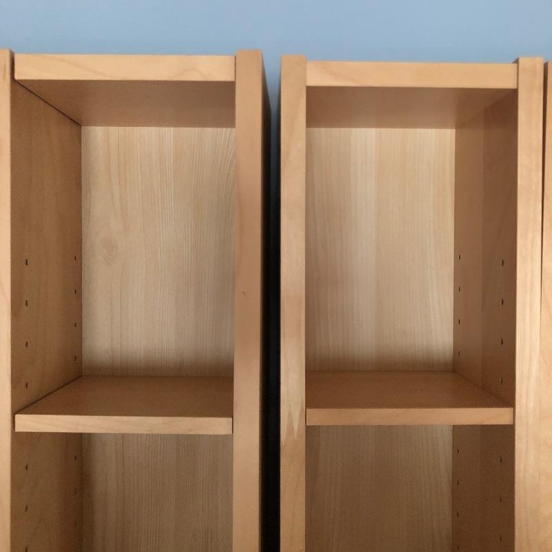 Nine Benno Shelf units by IKEA. Shelf height is adjustable and currently spaced to hold hundreds of DVDs. Extra shelves, pegs and brackets are included. Each unit is fully assembled manufactured wood shelving units, including instructions, brackets for fastening to the wall and extra pegs for adjusting shelves to fit your needs. Please note that lot # 260 has the same wood finish and will make a great addition to these shelves. Each piece measures 8” x 7” x 79”. Local pickup only. You will need to go up a flight of stairs to take these out of the house.