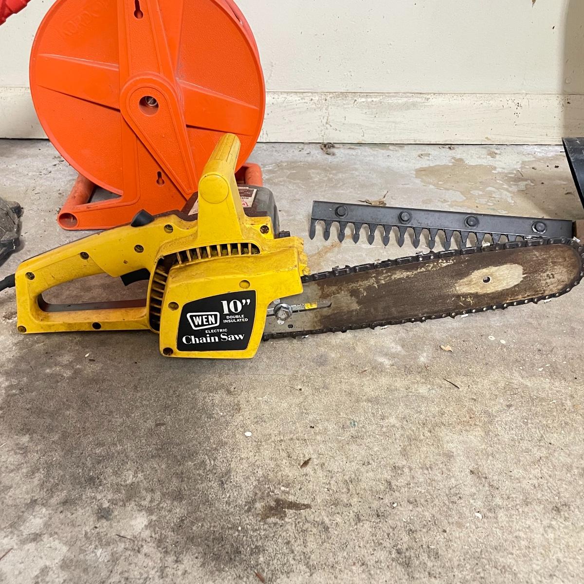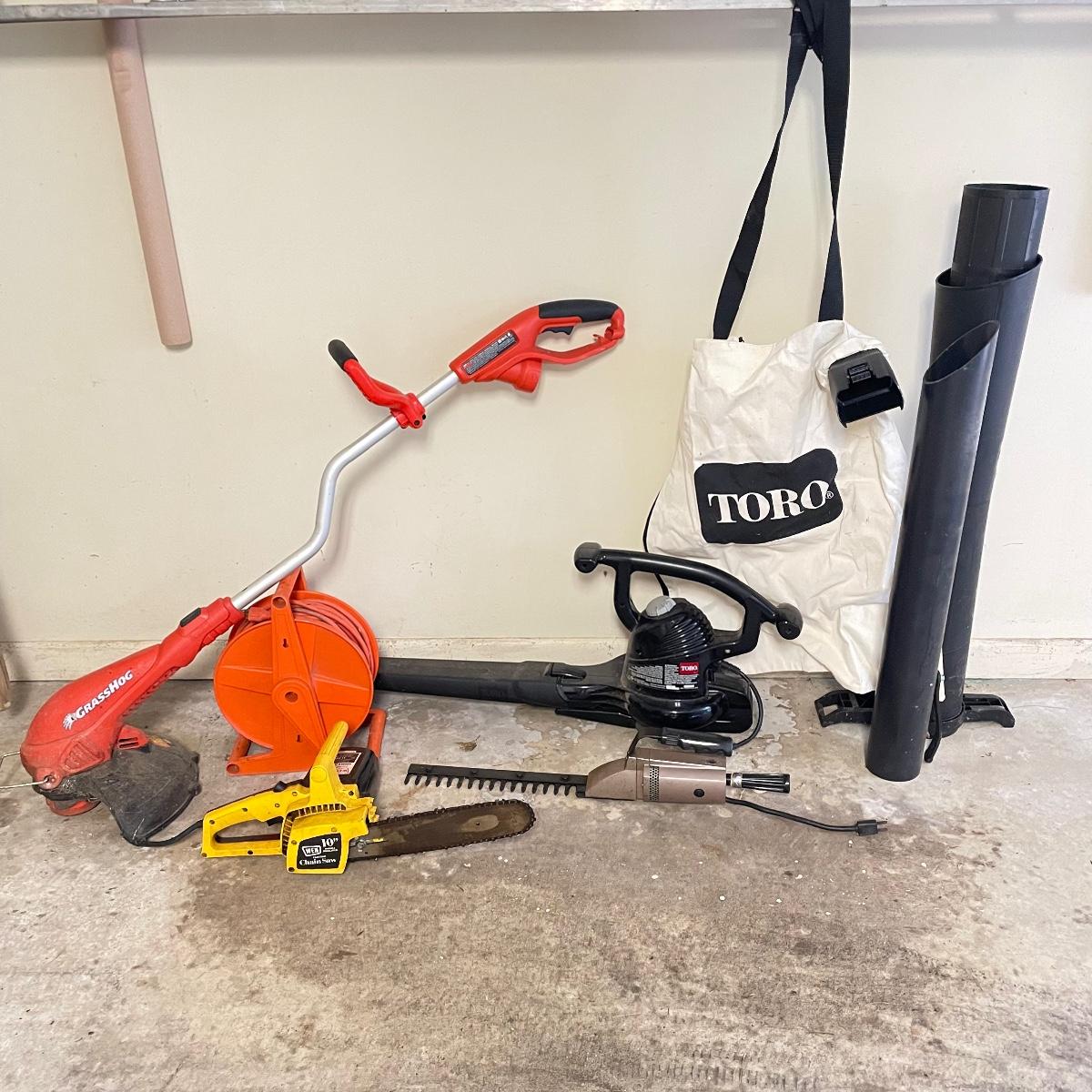 Every electric yard tool you need in one neat lot! First of all, how cool is the KordOPak outdoor extension cord spool! It’s manually powered and easy to keep your cords from knots and kinks. We tested it, and the large orange outdoor extension cord turned on the Toro Super Blower Vac, the Wen 10” chain saw, the Craftsman hedge trimmer and the Black+Decker Grass Hog weed eater. Model numbers shown in photos. The cord has some tape on it, but worked well. See images. Local pick up only.