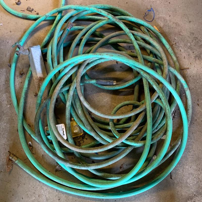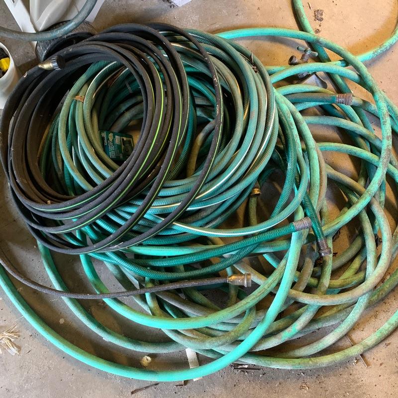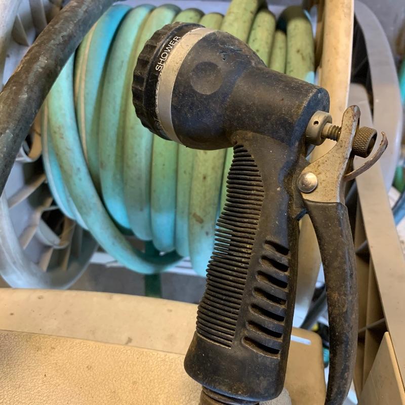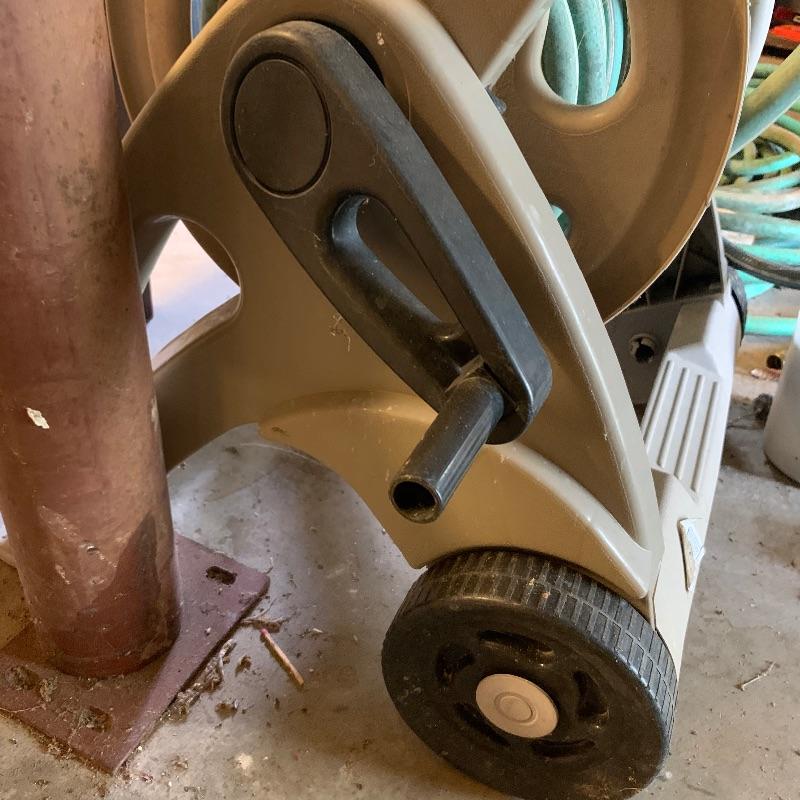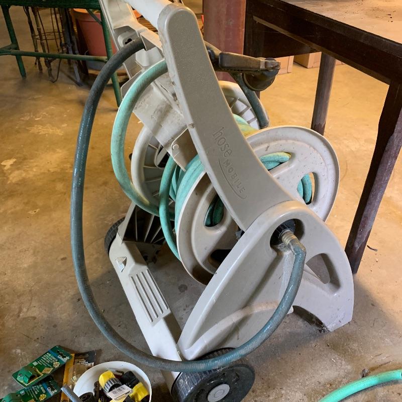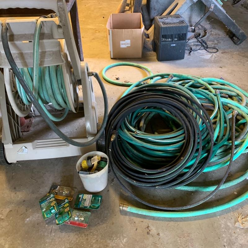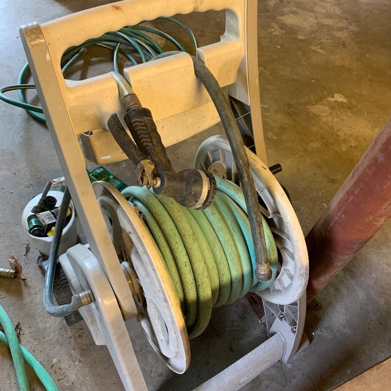 There are six garden hoses in this lot, one of which is a soaker hose.. Lots of different sizes and styles. Lot also has a handy storage holder with a crank to reel it in and out. One of the larger hoses is connected to a spigot on one end. Also included is a small bucket of accessories. No shipping.