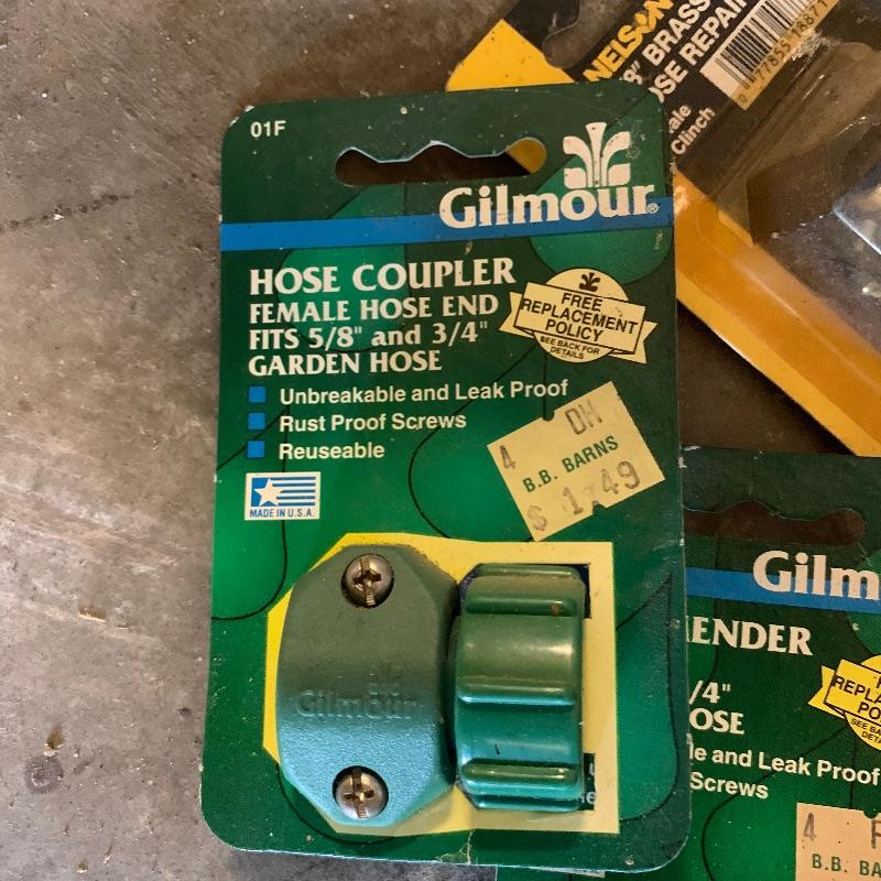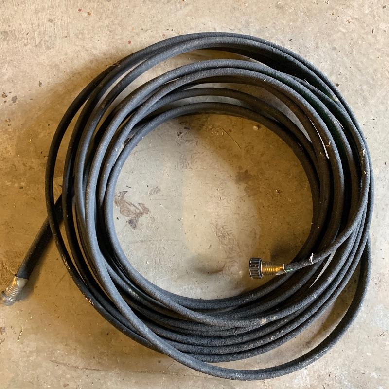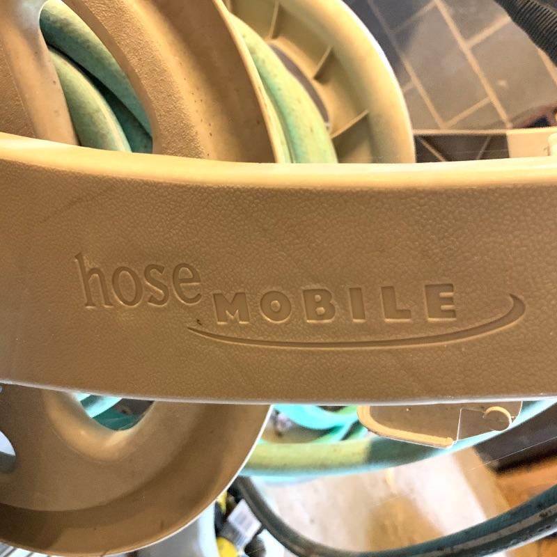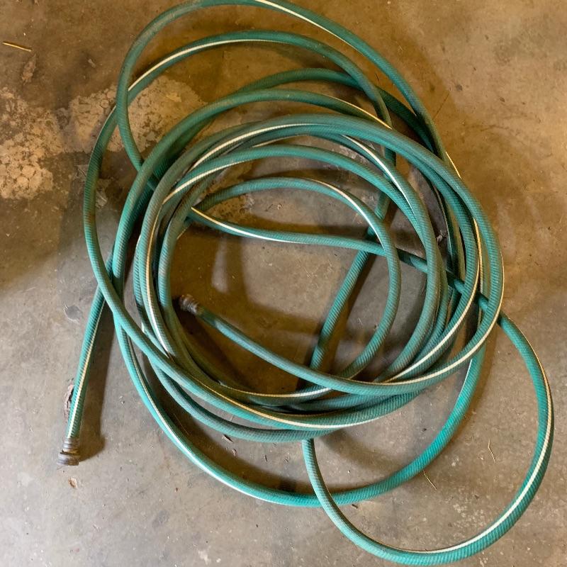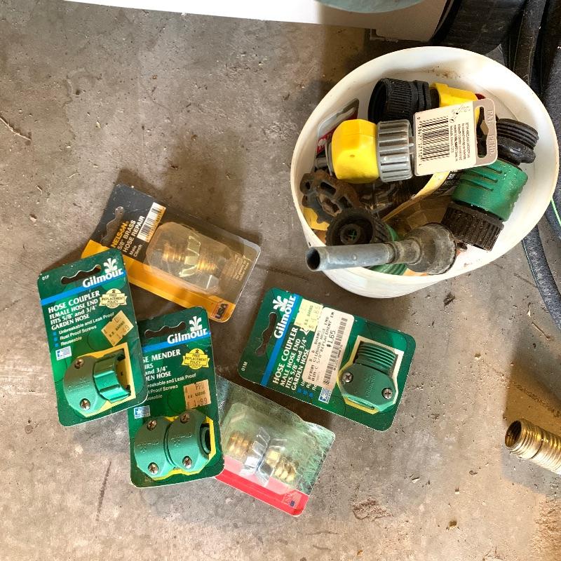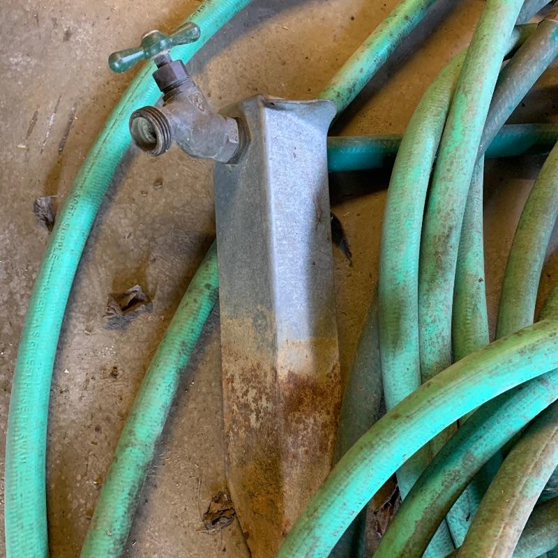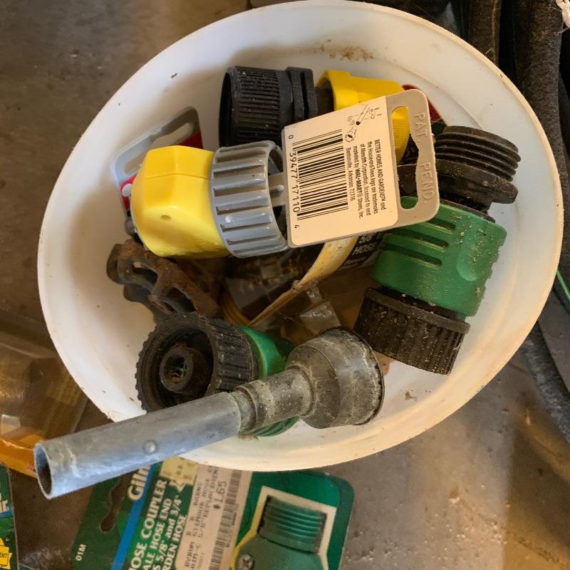 There are six garden hoses in this lot, one of which is a soaker hose.. Lots of different sizes and styles. Lot also has a handy storage holder with a crank to reel it in and out. One of the larger hoses is connected to a spigot on one end. Also included is a small bucket of accessories. No shipping.