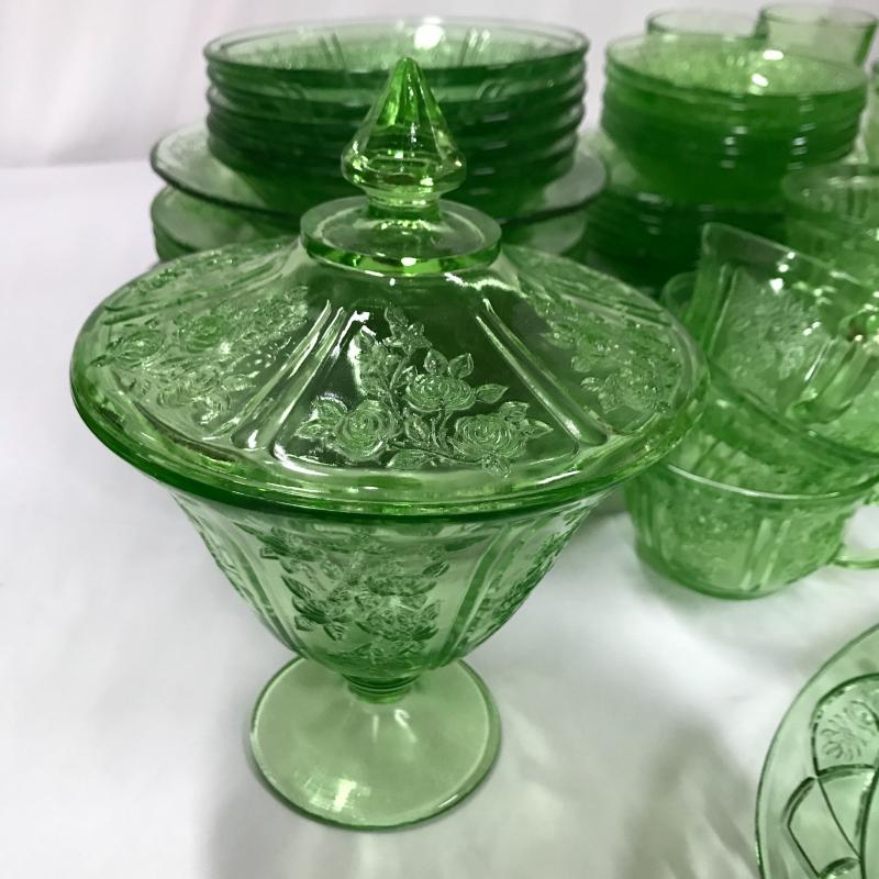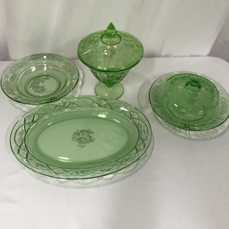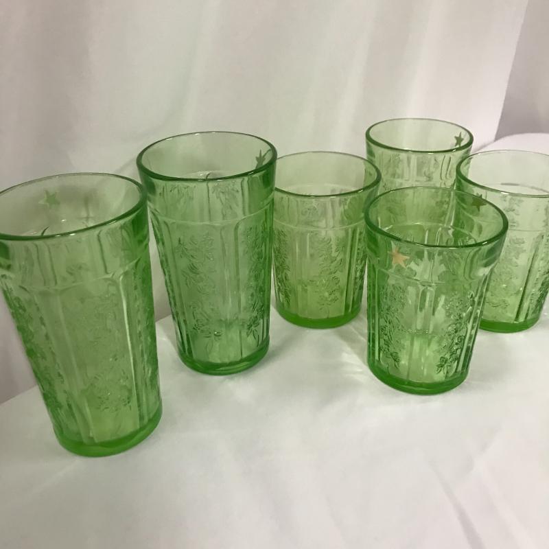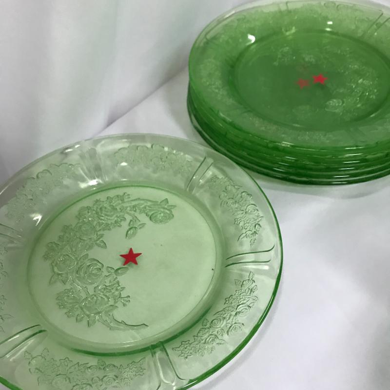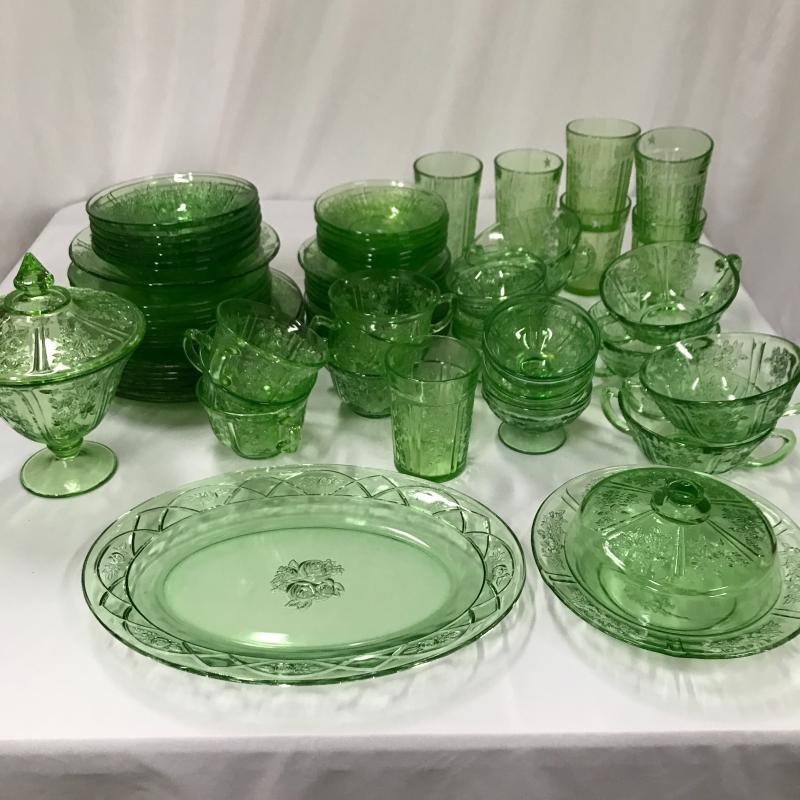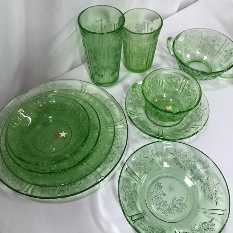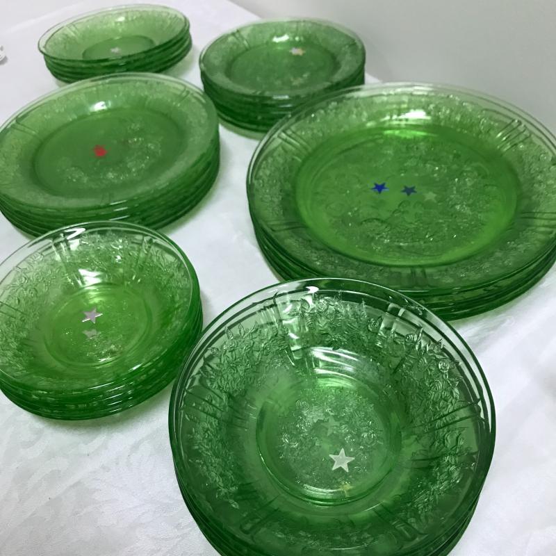 Large set of green depression glass dinnerware. Excellent condition. No obvious visible scratches or cracks that we saw. At least six of each dish (some have 7) except for glasses. Four serving pieces also included. See photos for details. Almost all have small removable star stickers on them. No shipping. Only local pick up in Asheville