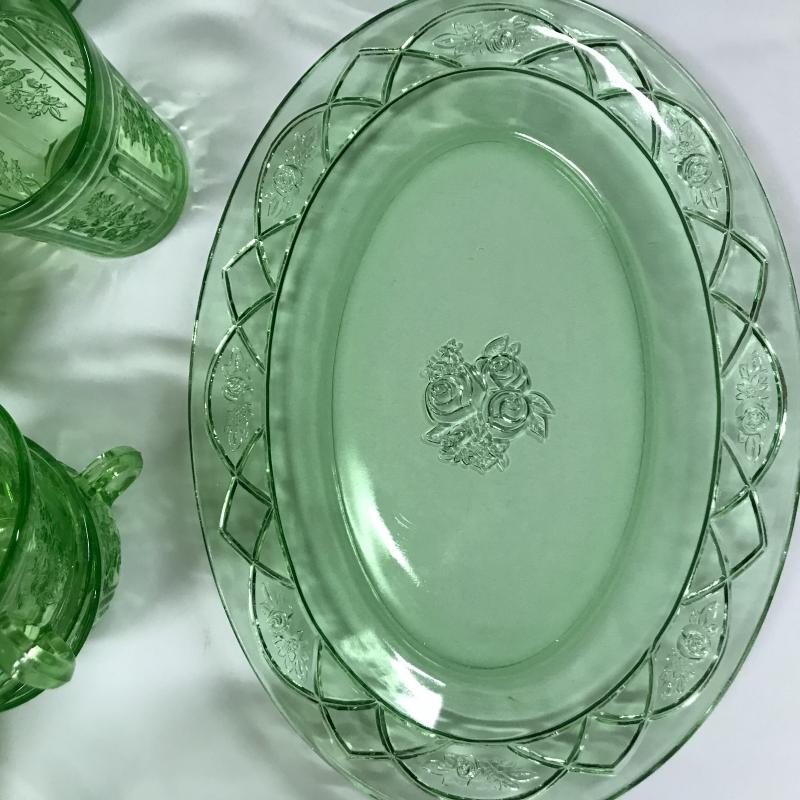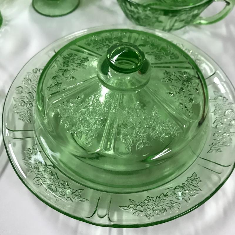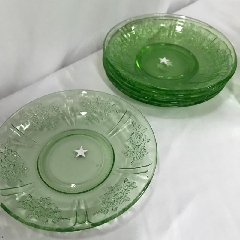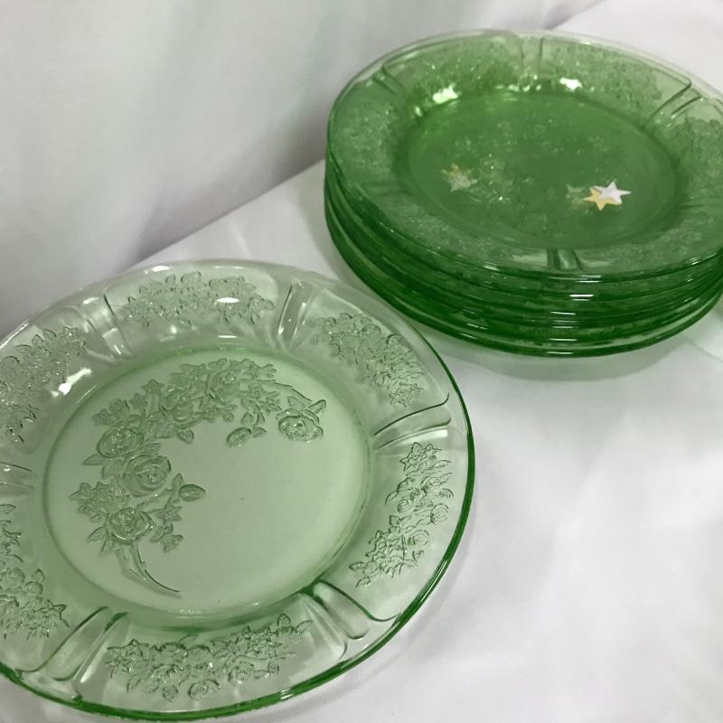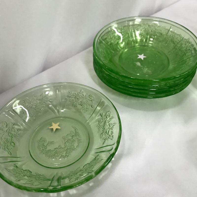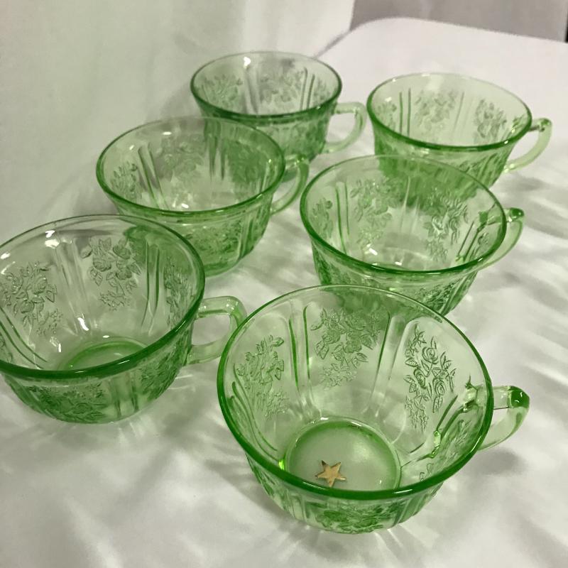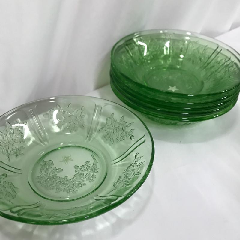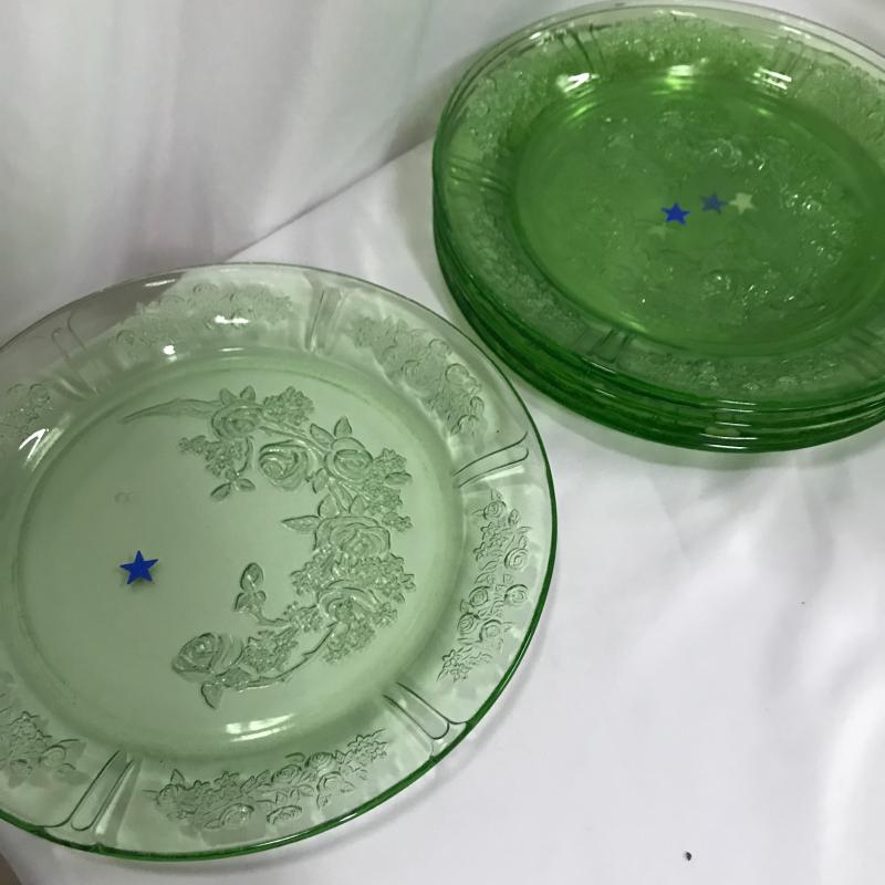 Large set of green depression glass dinnerware. Excellent condition. No obvious visible scratches or cracks that we saw. At least six of each dish (some have 7) except for glasses. Four serving pieces also included. See photos for details. Almost all have small removable star stickers on them. No shipping. Only local pick up in Asheville