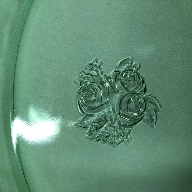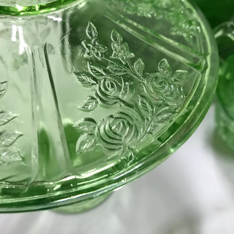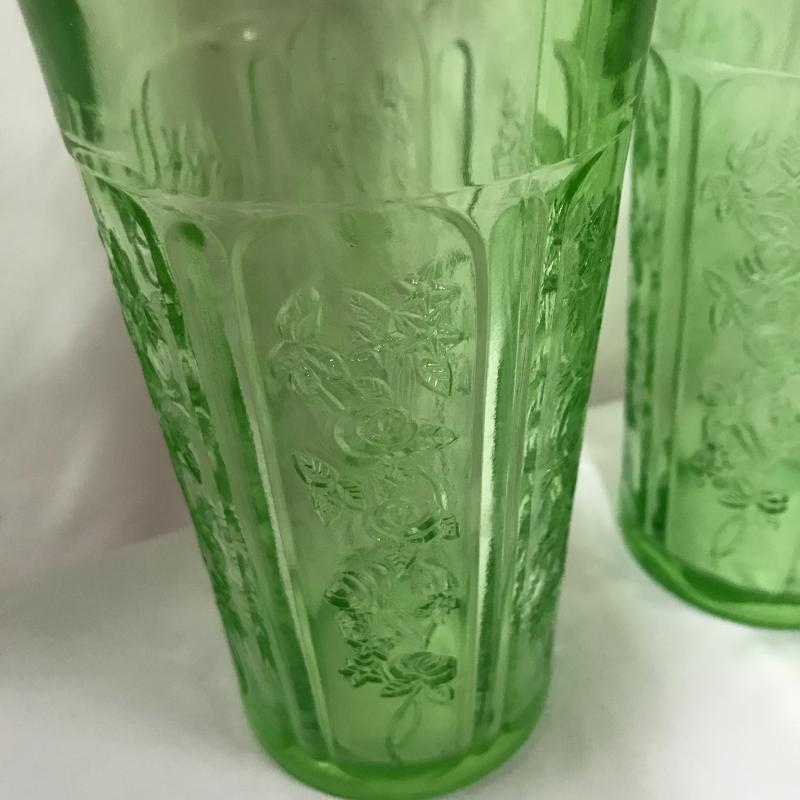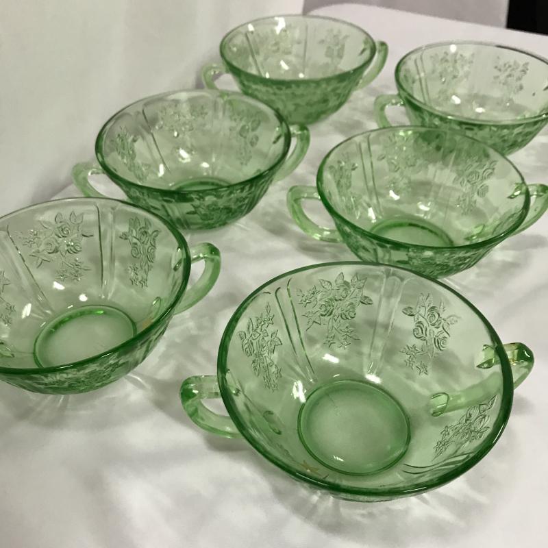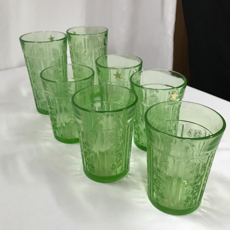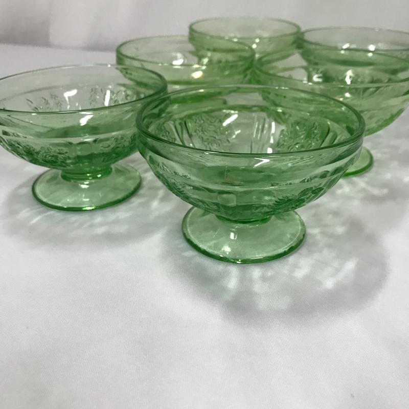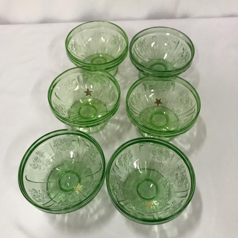 Large set of green depression glass dinnerware. Excellent condition. No obvious visible scratches or cracks that we saw. At least six of each dish (some have 7) except for glasses. Four serving pieces also included. See photos for details. Almost all have small removable star stickers on them. No shipping. Only local pick up in Asheville
