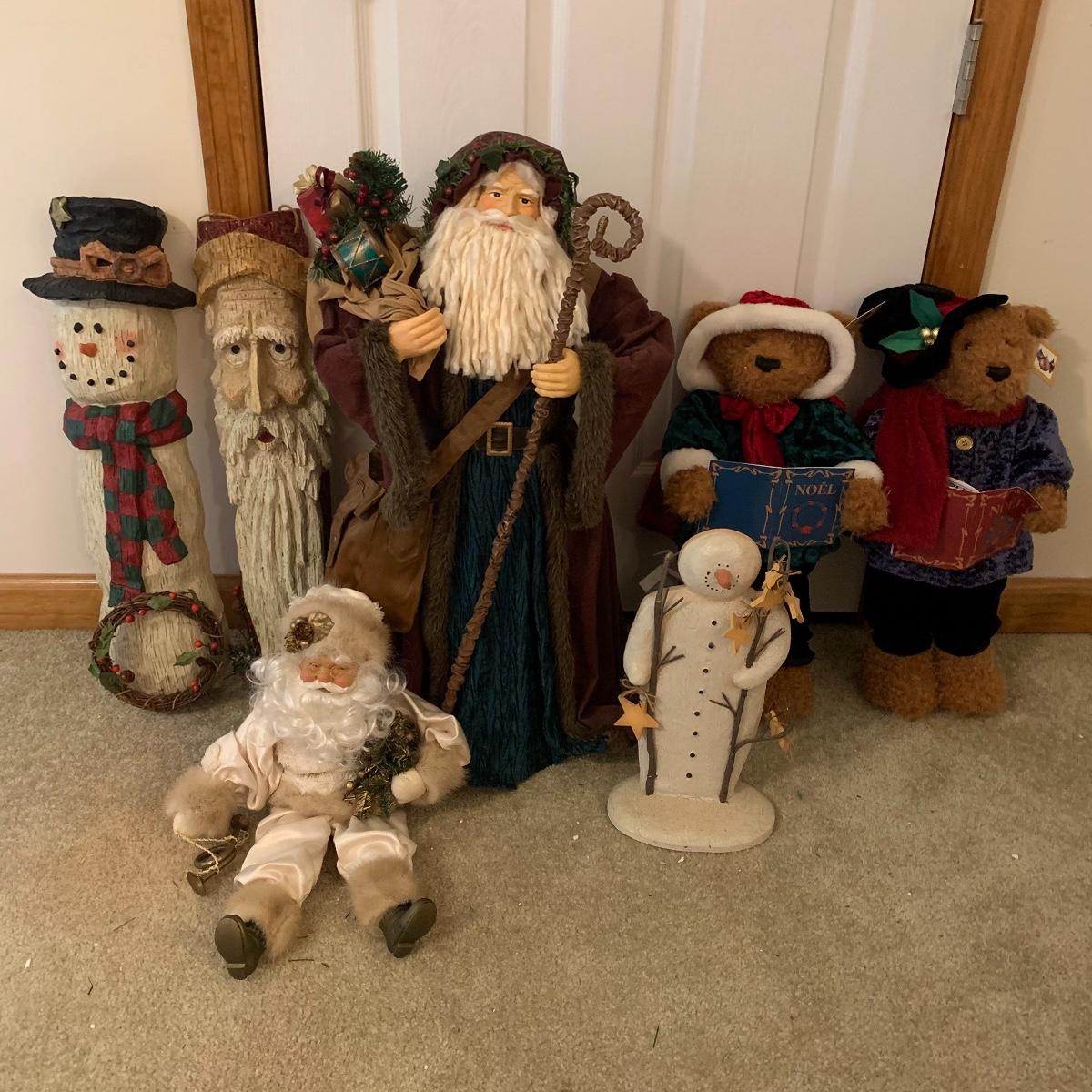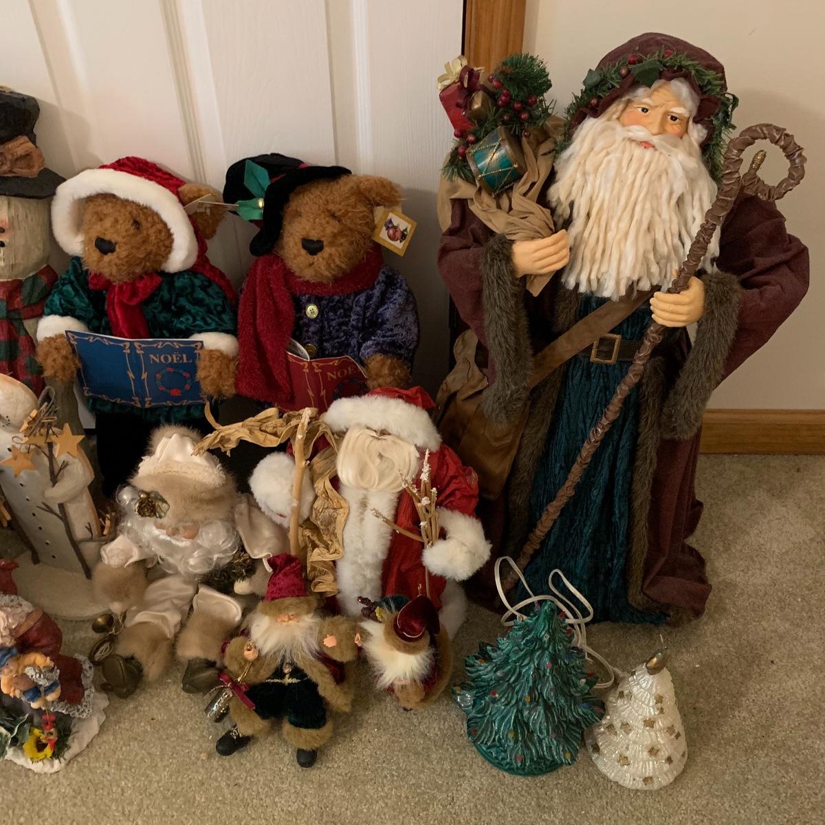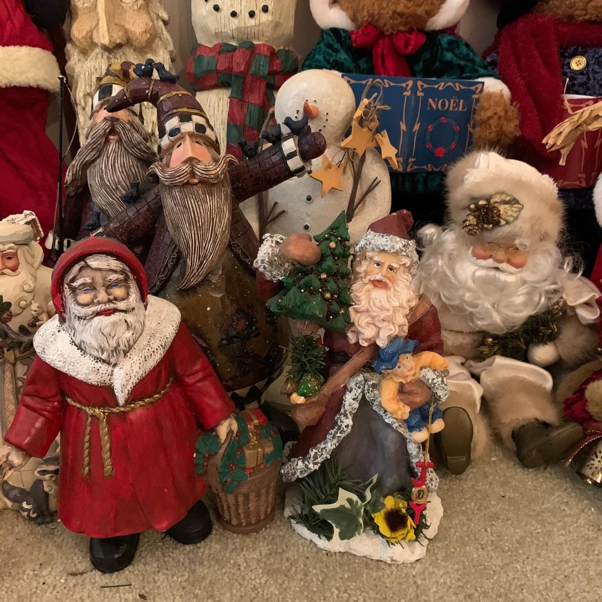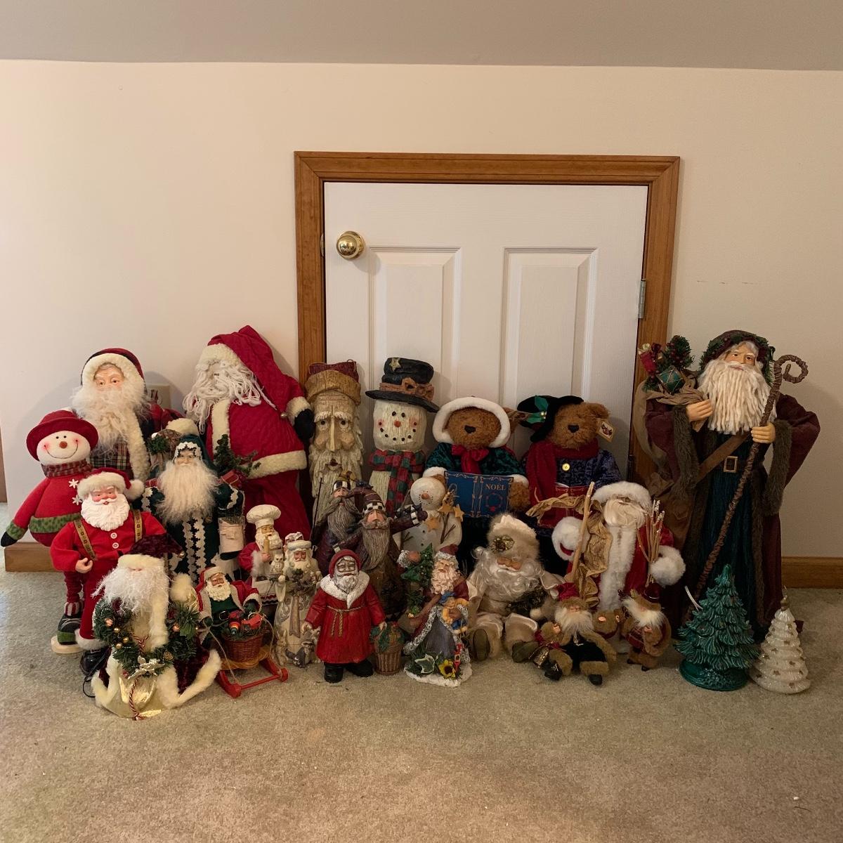 In this lot you’ll find a large collection of Christmas figurines. The tallest is a hooded Santa that measures about 27” tall. The smallest measure about 7”. There are approximately 16 Santas, 3 snowmen, two bears, & two Christmas trees. One tree plugs in and lights up. The other is a candle. Some figurines are wood, some fabric, and some ceramic. They all appear to have been stored carefully and well taken care of. Shipping available but please note that it would be a very large and costly package.