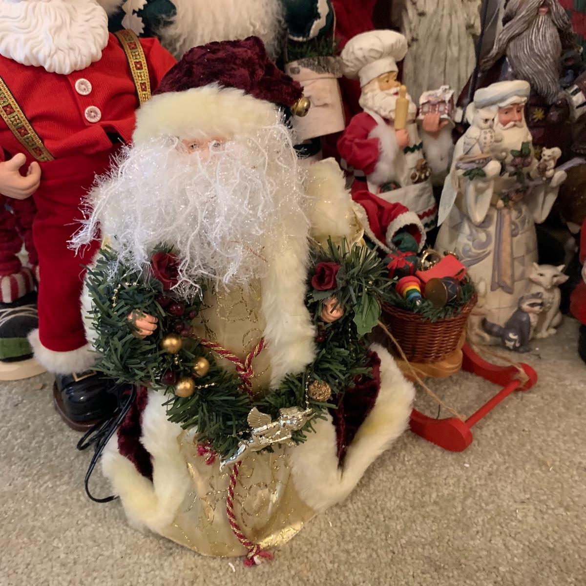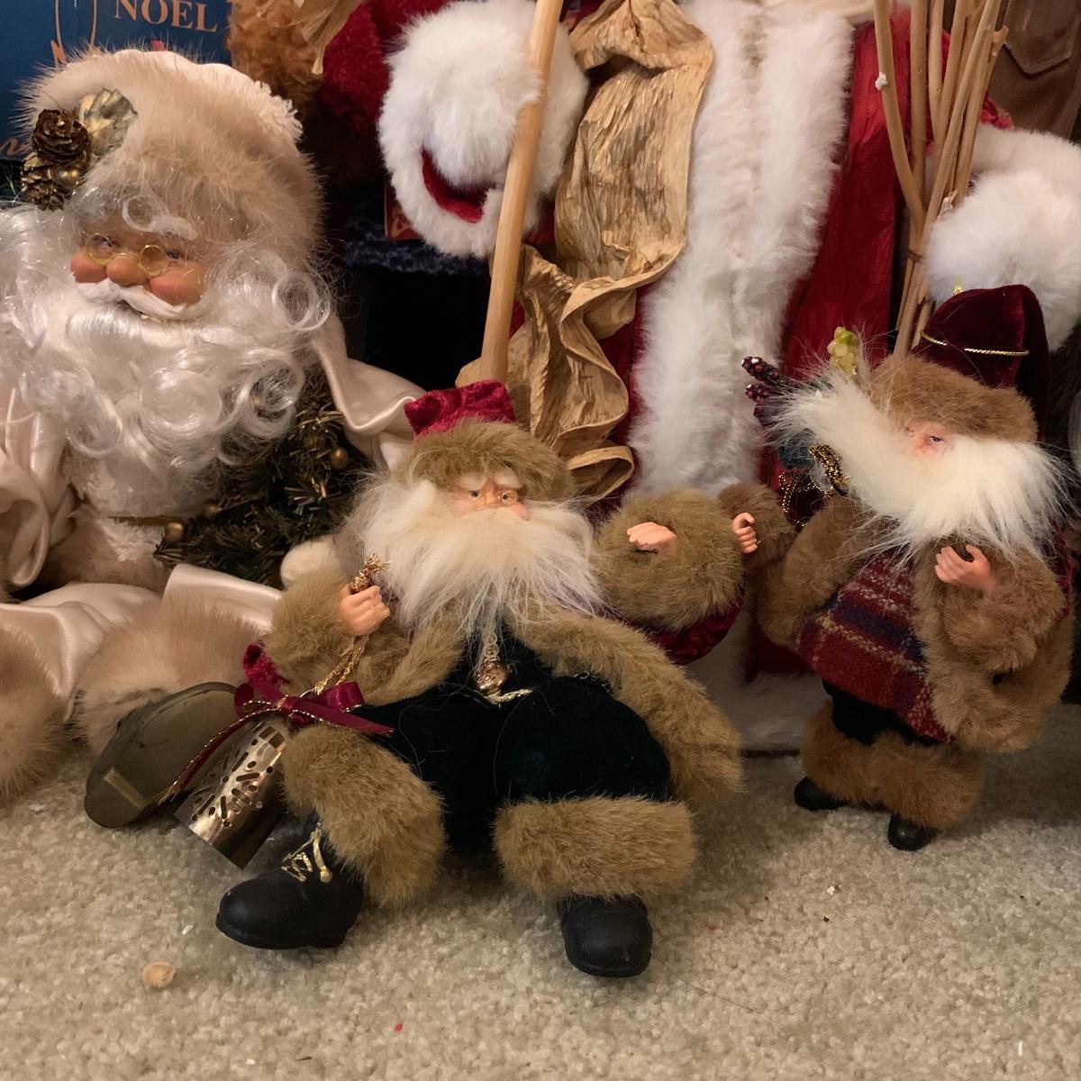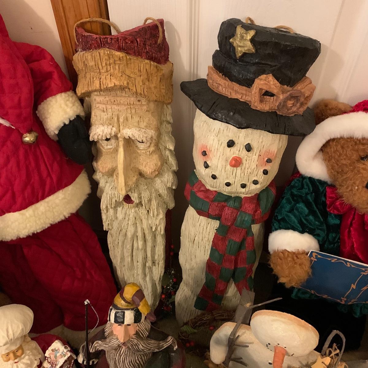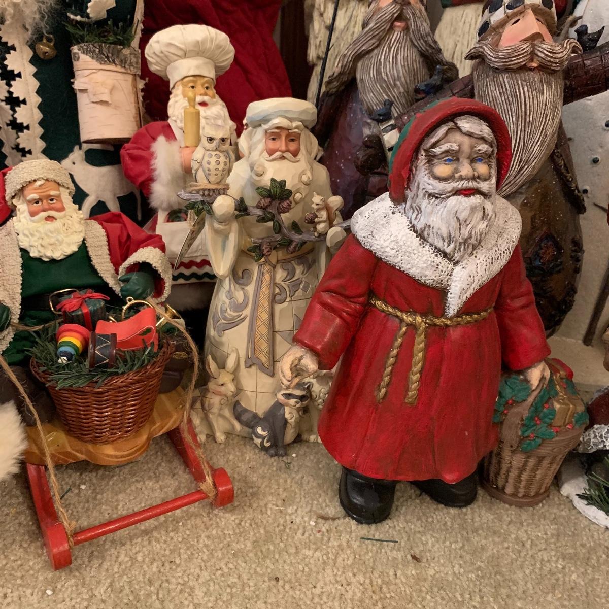 In this lot you’ll find a large collection of Christmas figurines. The tallest is a hooded Santa that measures about 27” tall. The smallest measure about 7”. There are approximately 16 Santas, 3 snowmen, two bears, & two Christmas trees. One tree plugs in and lights up. The other is a candle. Some figurines are wood, some fabric, and some ceramic. They all appear to have been stored carefully and well taken care of. Shipping available but please note that it would be a very large and costly package.