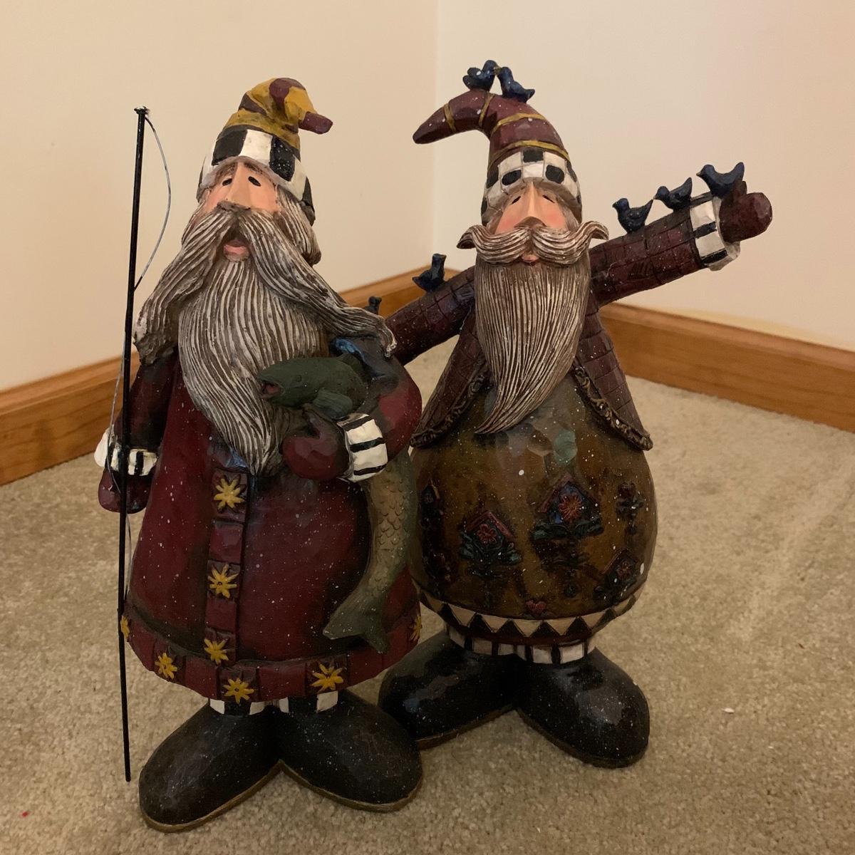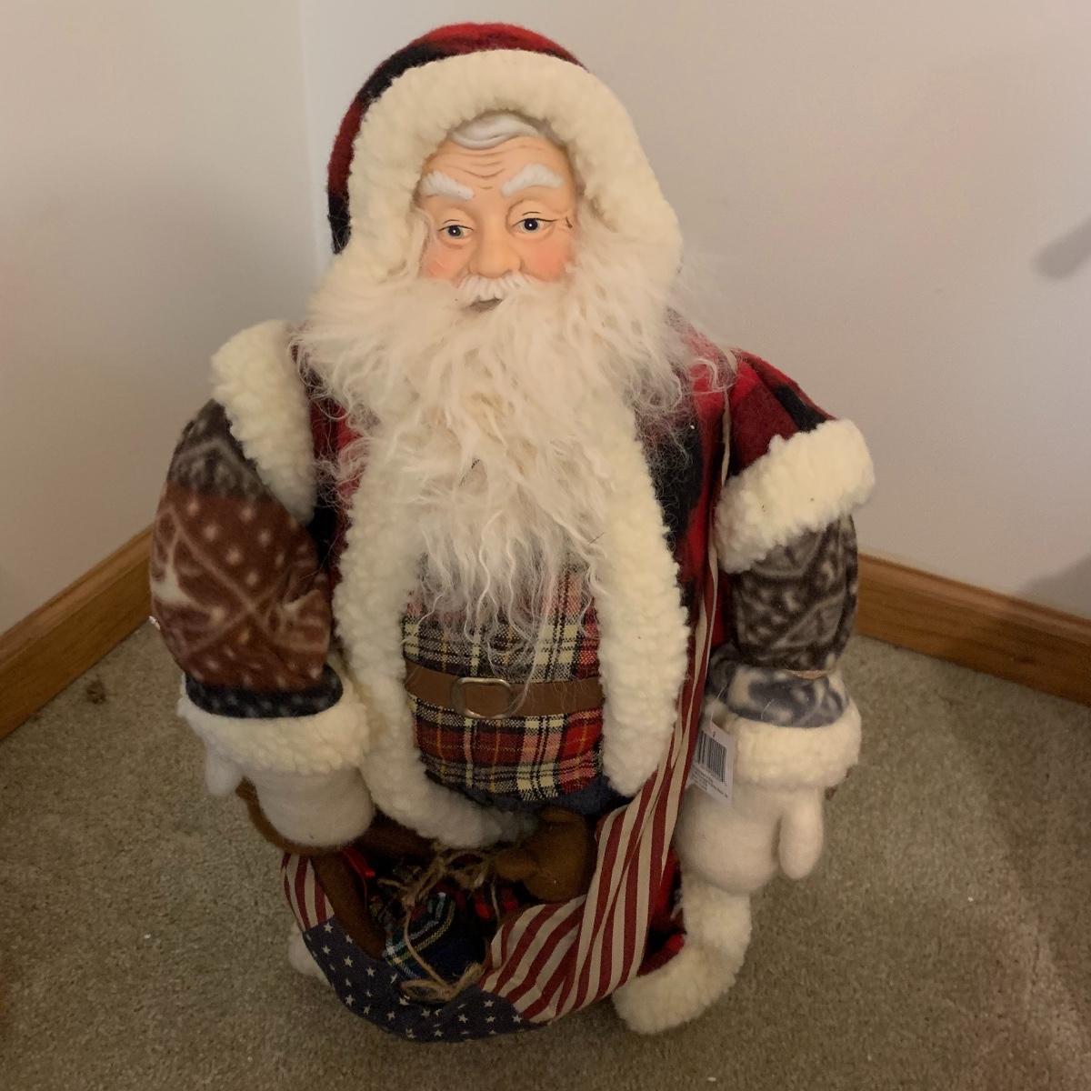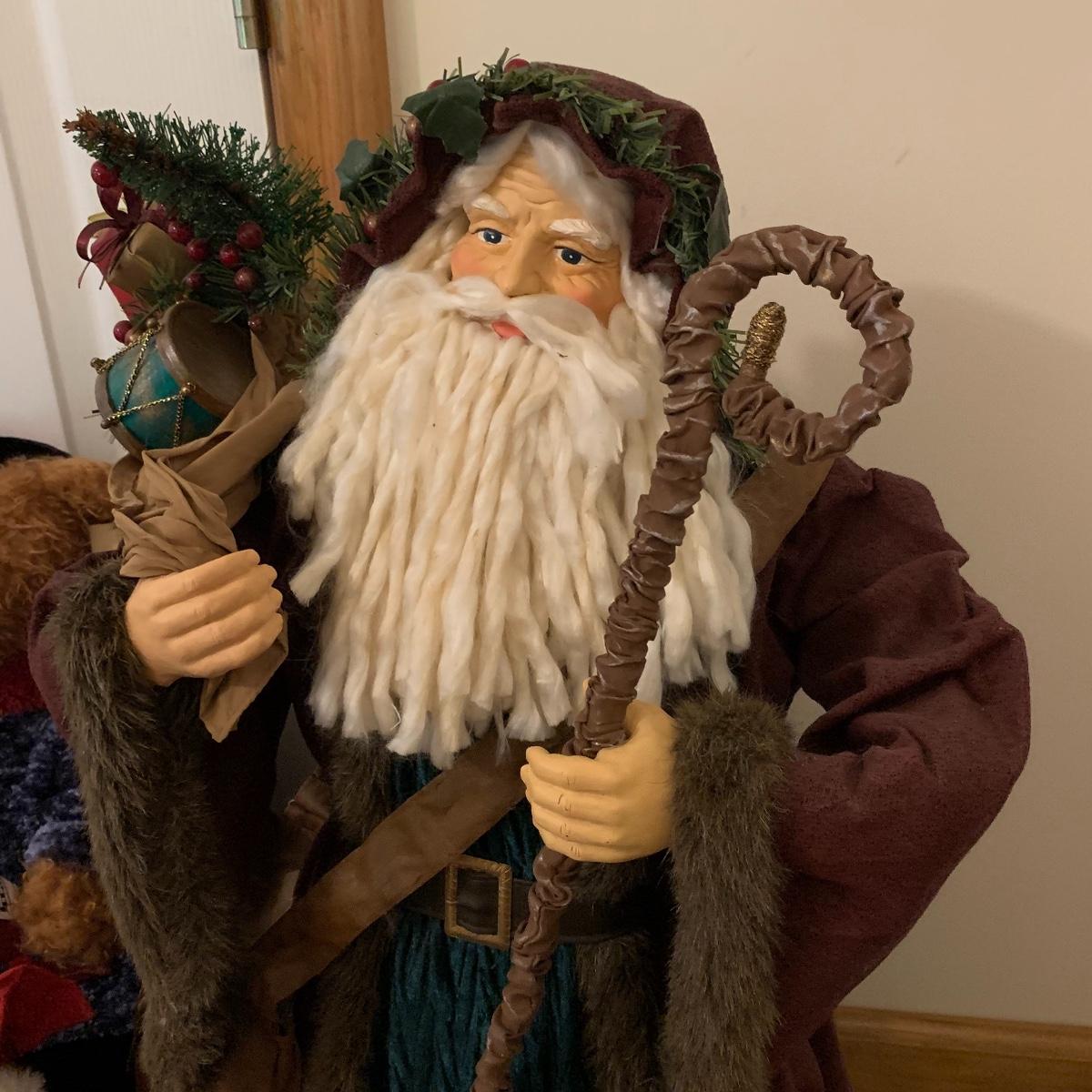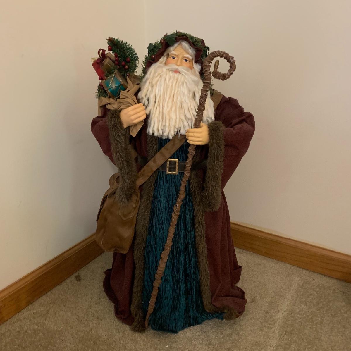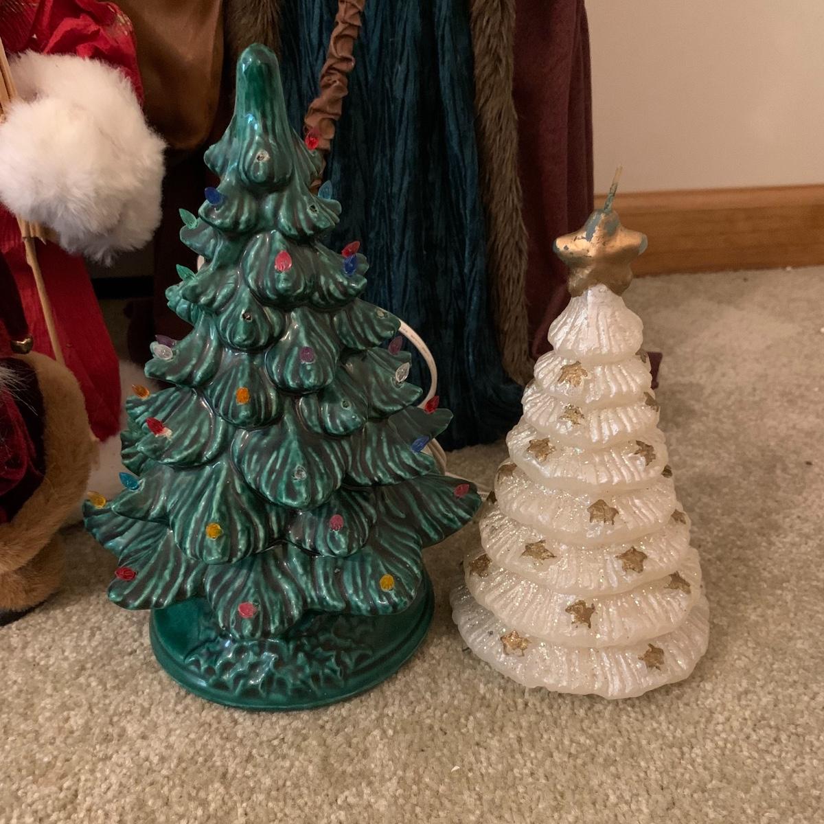 In this lot you’ll find a large collection of Christmas figurines. The tallest is a hooded Santa that measures about 27” tall. The smallest measure about 7”. There are approximately 16 Santas, 3 snowmen, two bears, & two Christmas trees. One tree plugs in and lights up. The other is a candle. Some figurines are wood, some fabric, and some ceramic. They all appear to have been stored carefully and well taken care of. Shipping available but please note that it would be a very large and costly package.