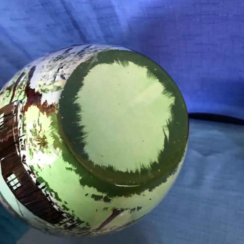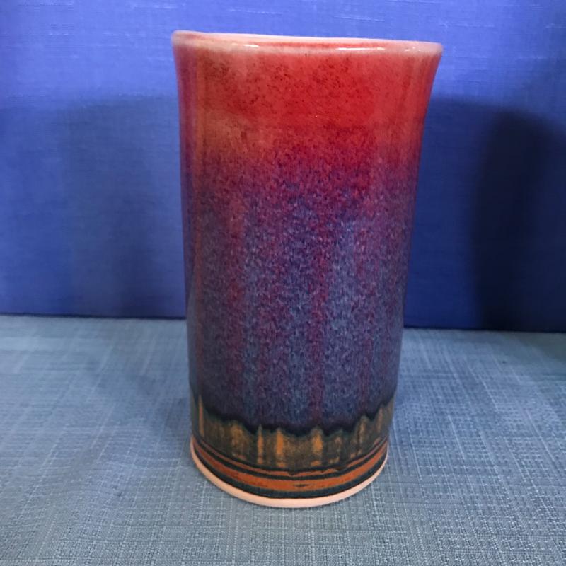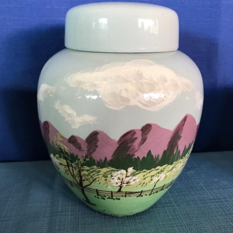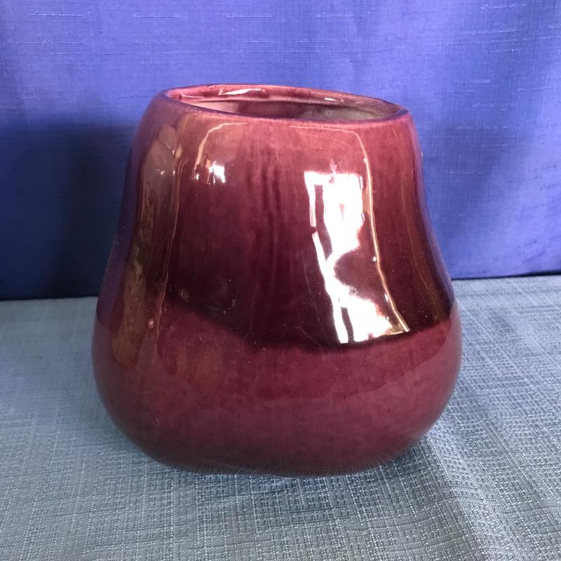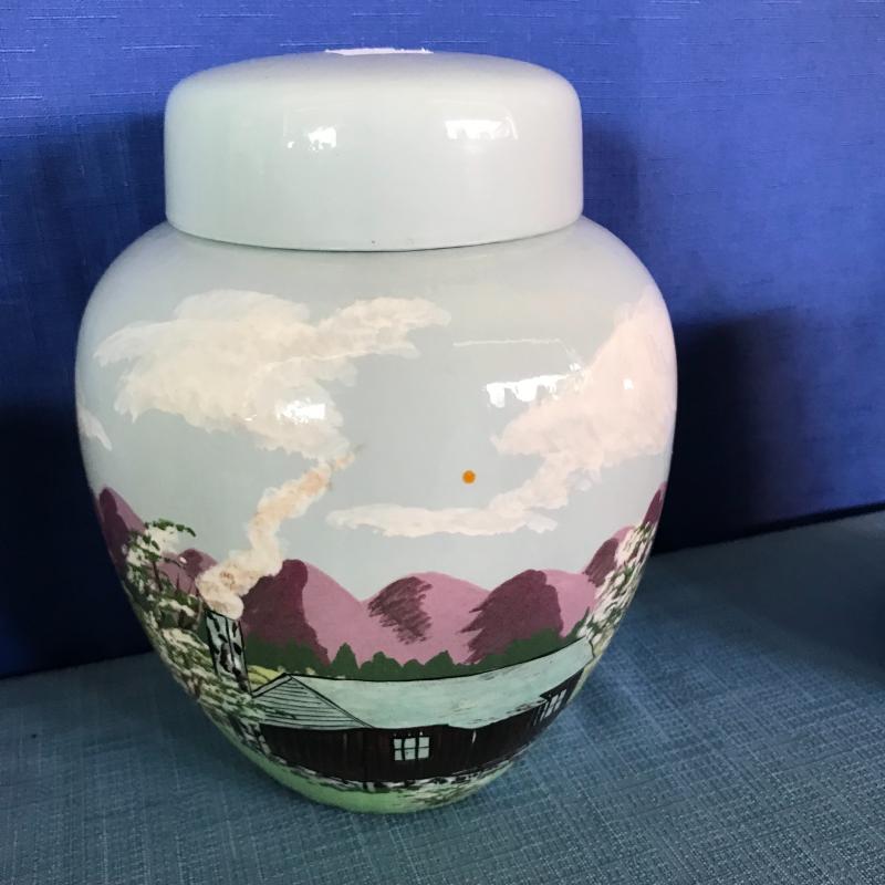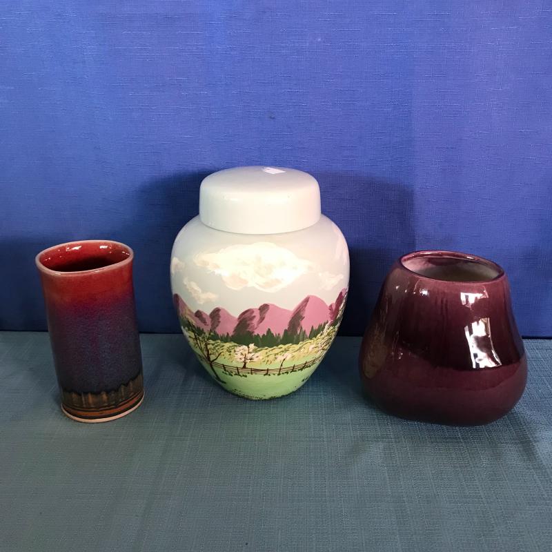 Lot contains a painted, lidded container (approx. 7” x 9”), locally made pottery drinking glass and eggplant-like vase.