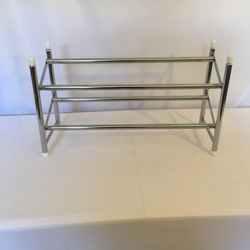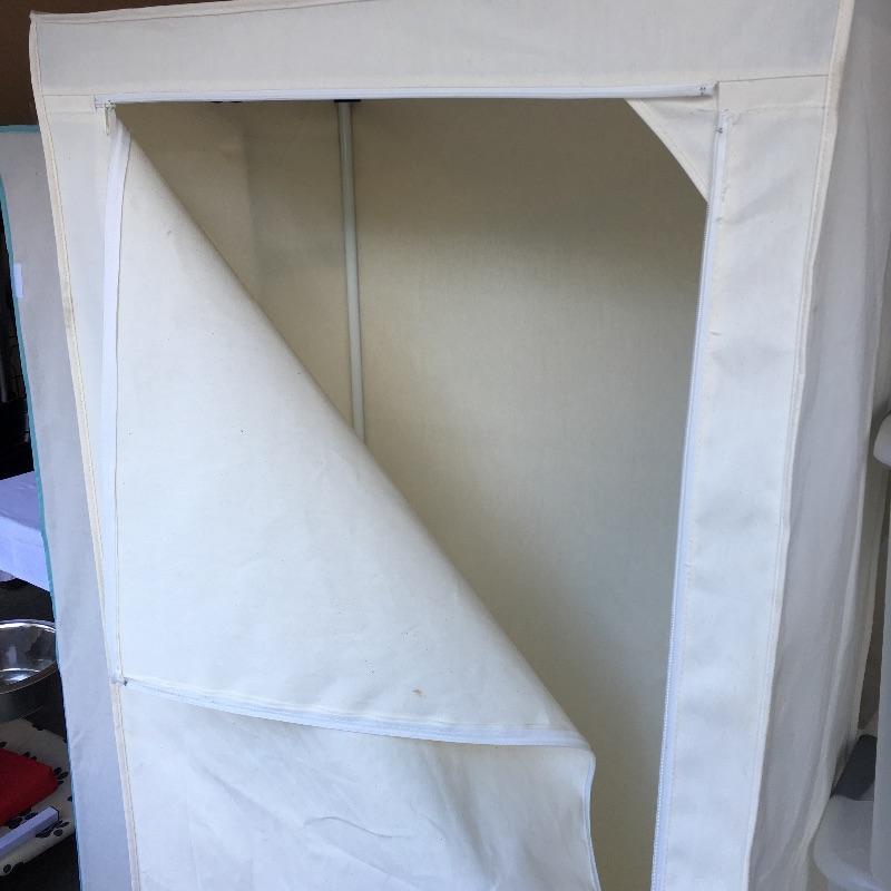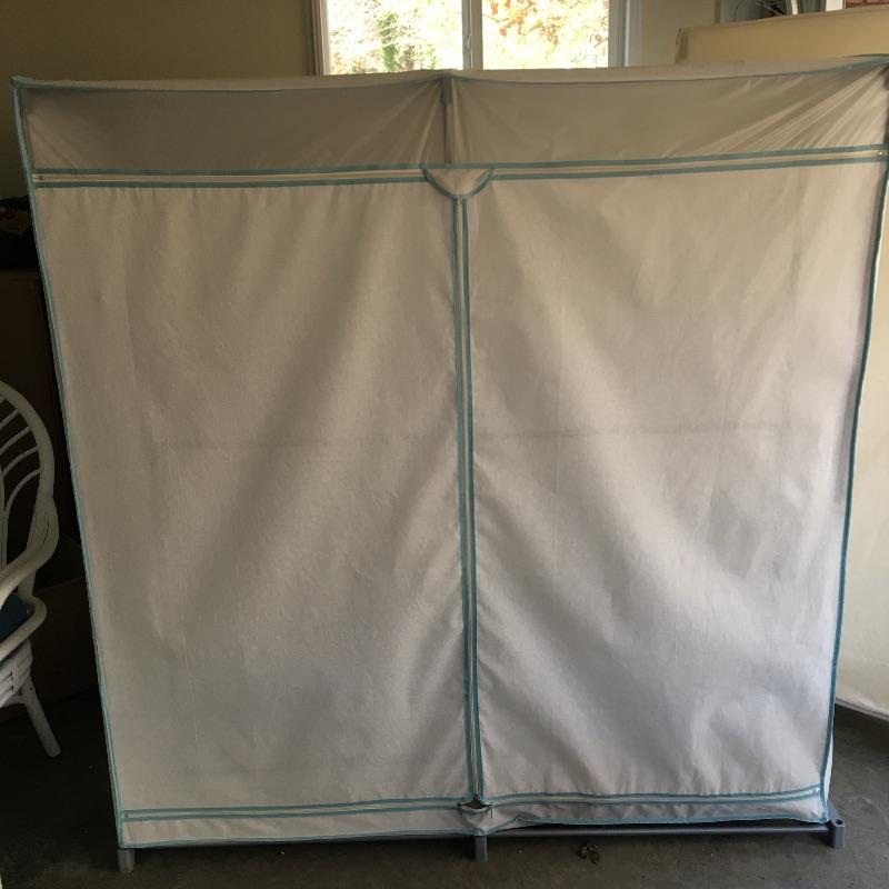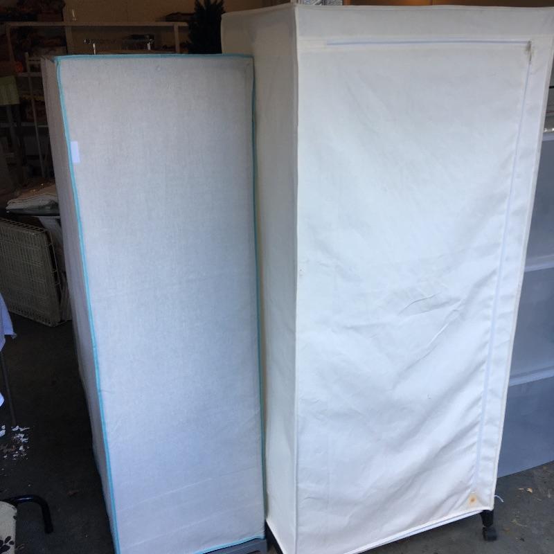Pair of wardrobes, adjustable shoe rack, six storage bags and more. You can never have too much storage. Largest wardrobe measures 19” x 59.5” x 63”.