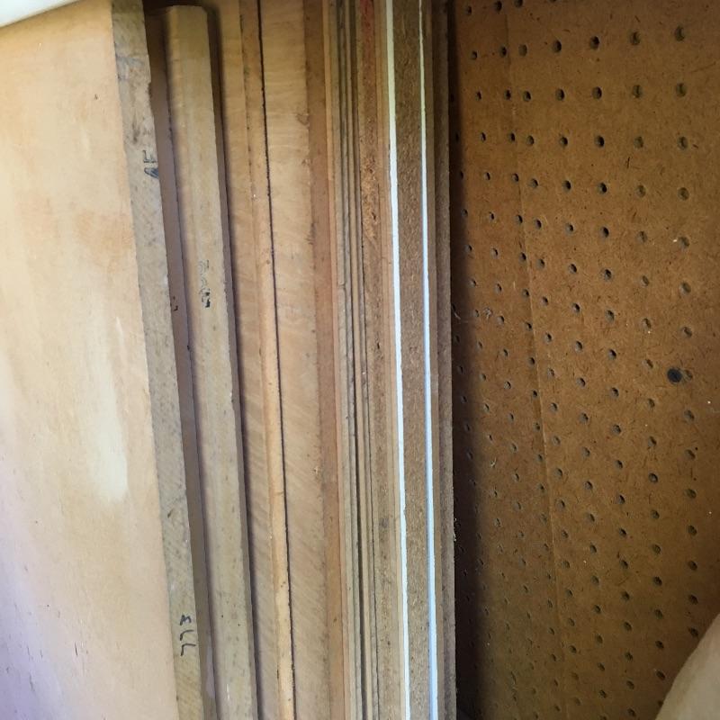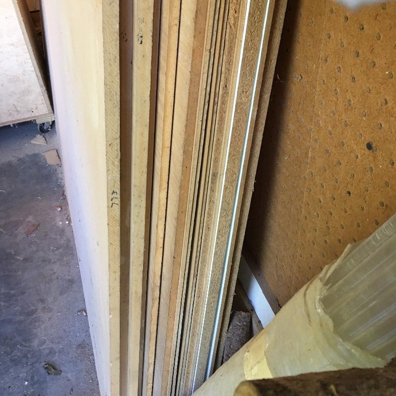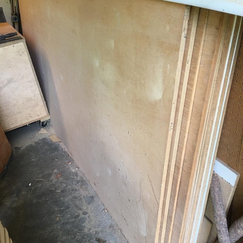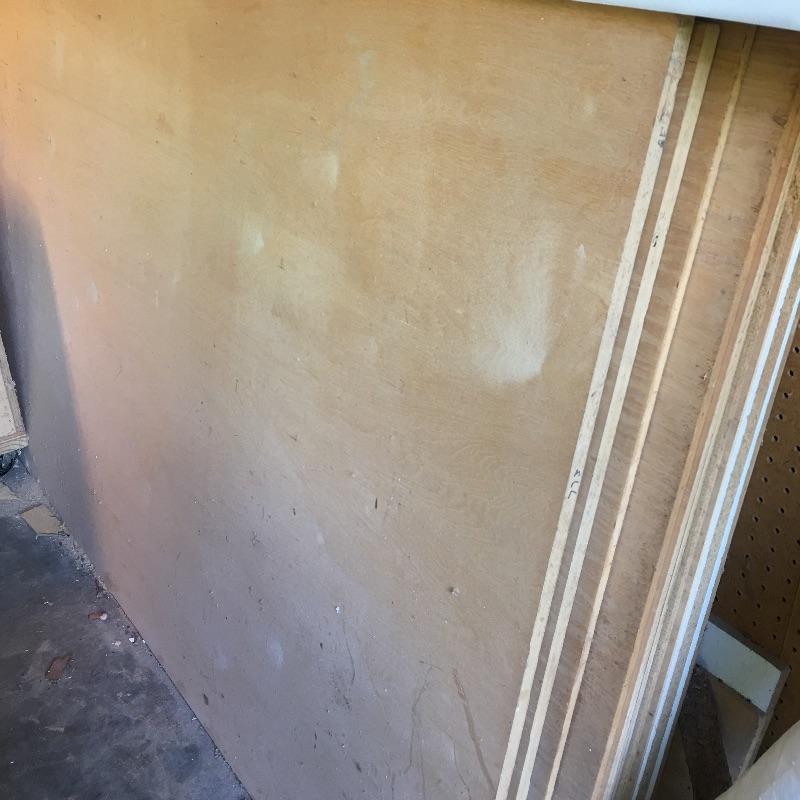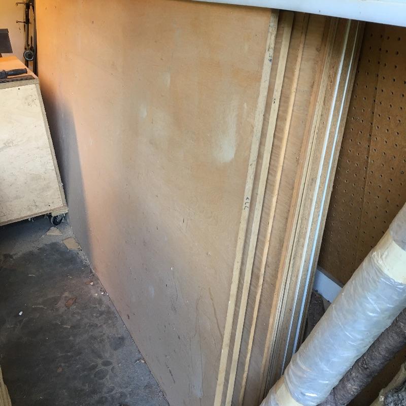Variety of plywood and other types of wood and fiberboard. Largest piece measures 48.5” x 96.5”.