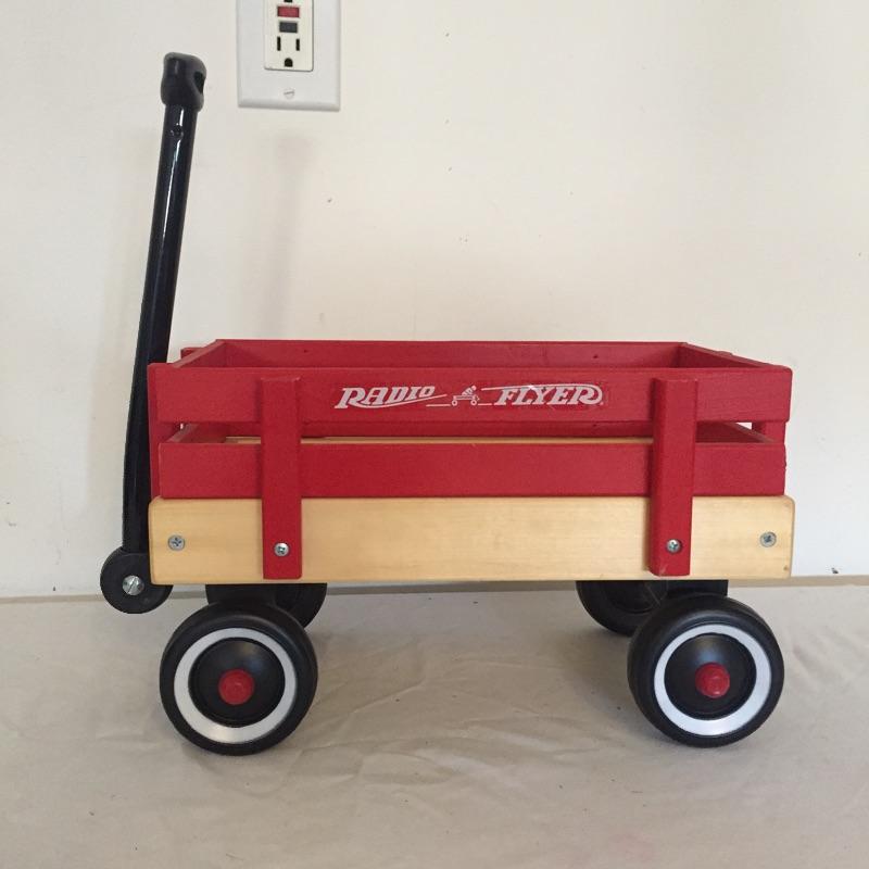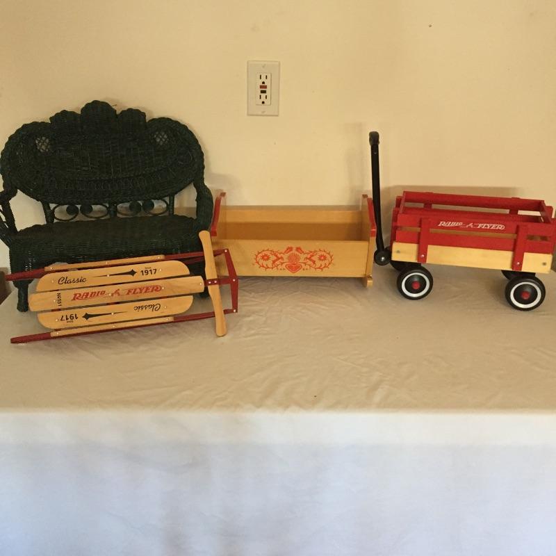 Awesome Radio Flyer wagon and sled, doll crib and wicker chair. Make all the little ones in your household smile with this super cool lot. Wagon measures 7.5” x 14” x 7.5”.
