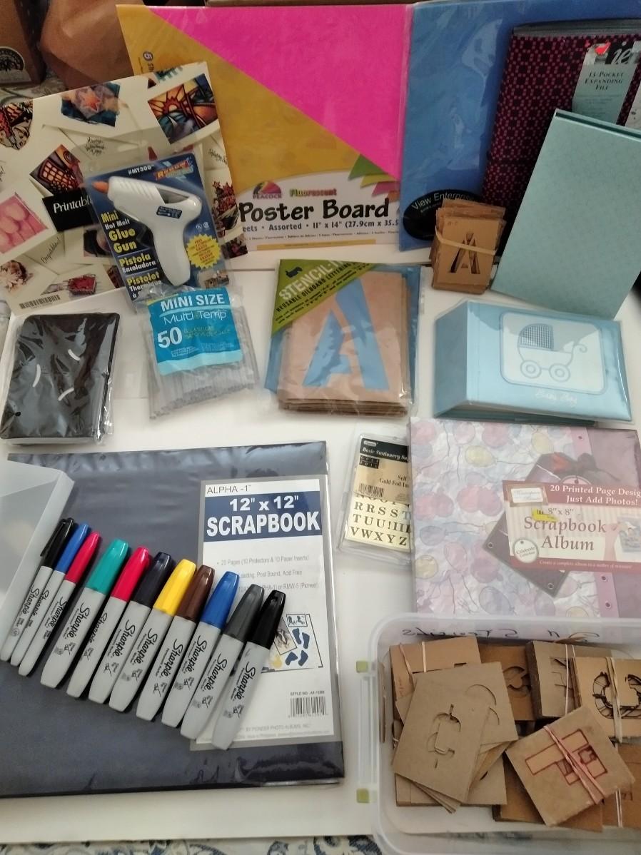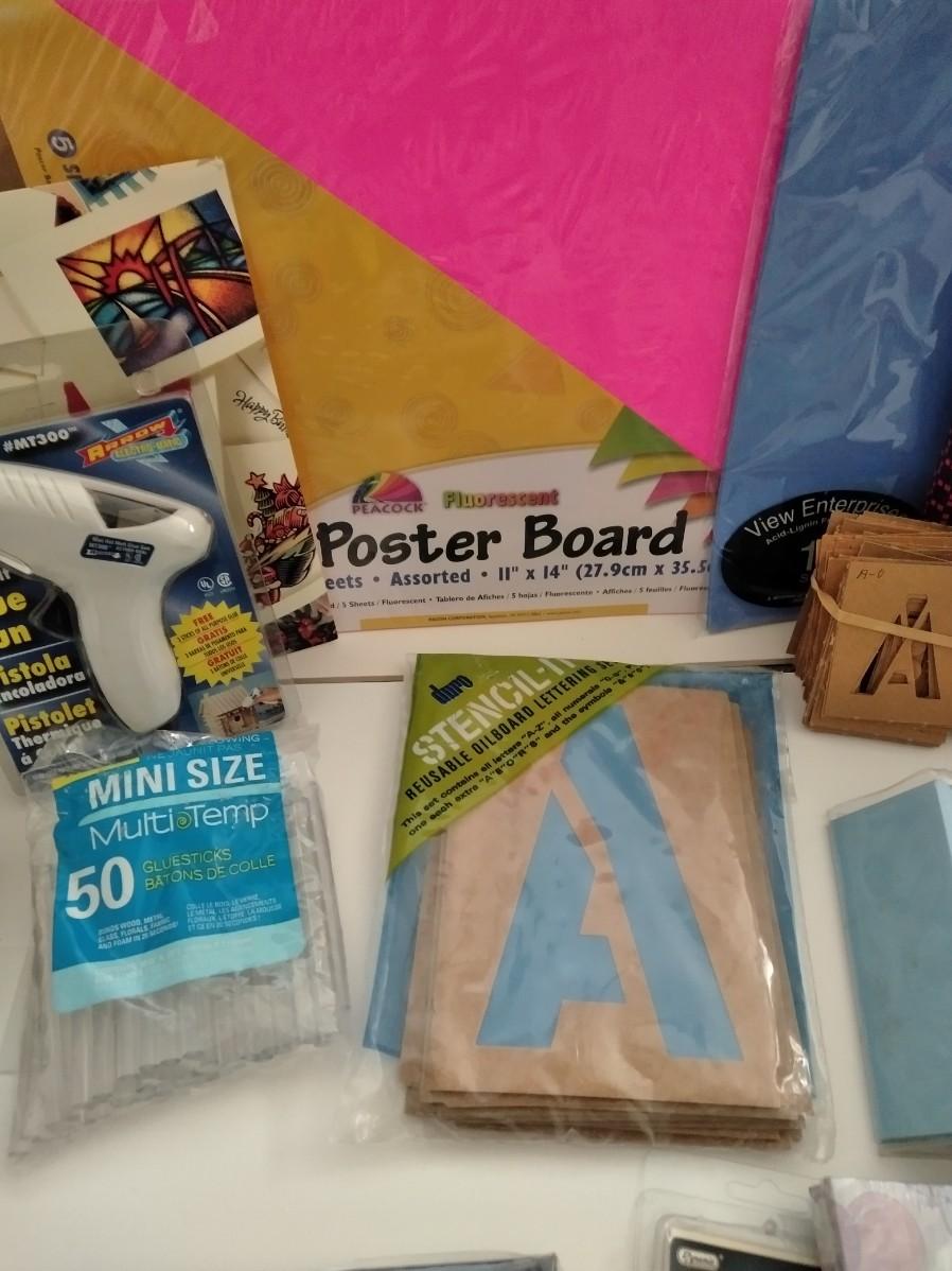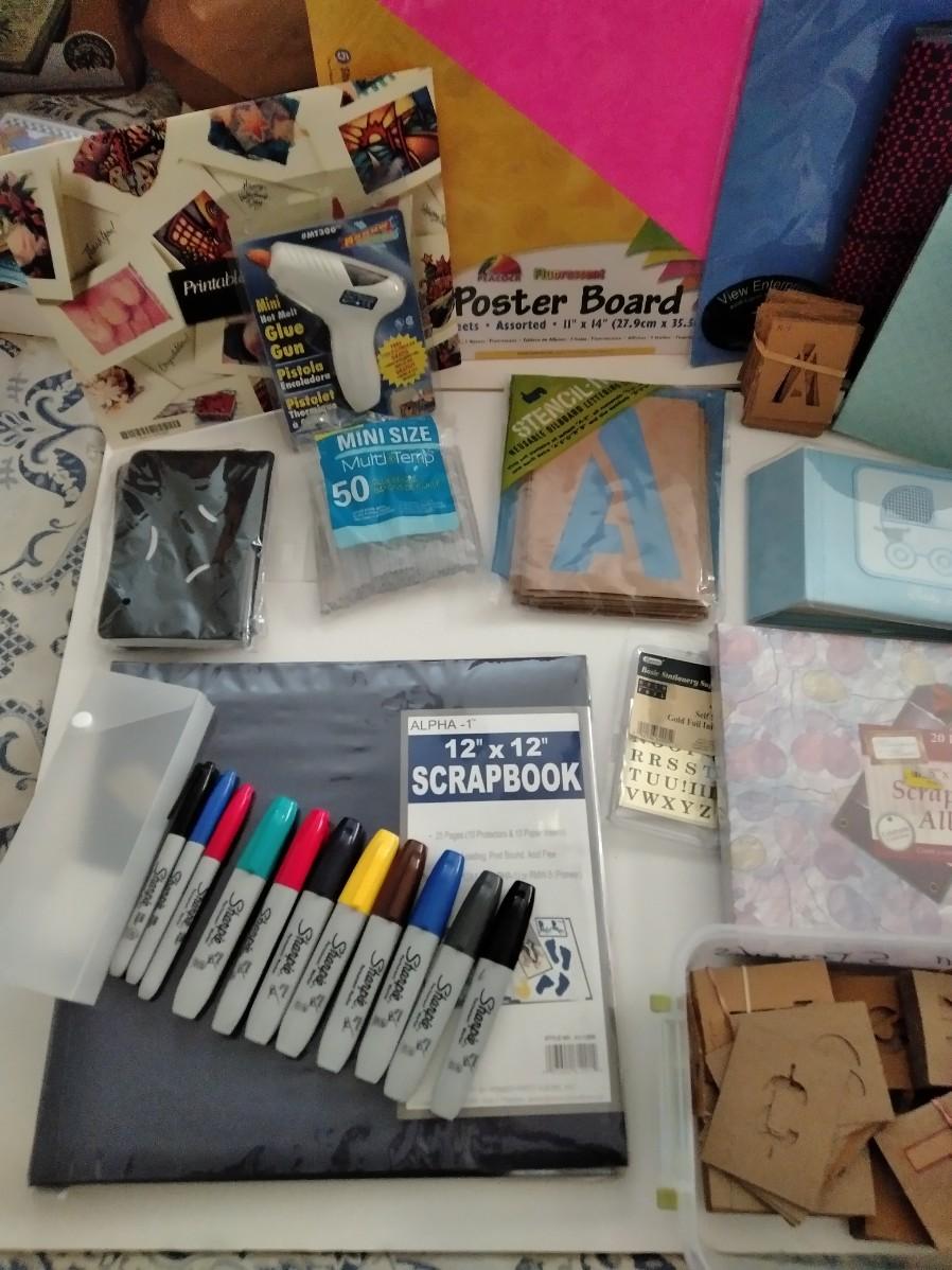POSTERBOARD, SCRAPBOOKS AND PHOTO ALBUMNS, COLORED SHARPIES, STENCILS, GLUE GUN AND GLUE STICKS, LETTER STICKERS, AND MORE