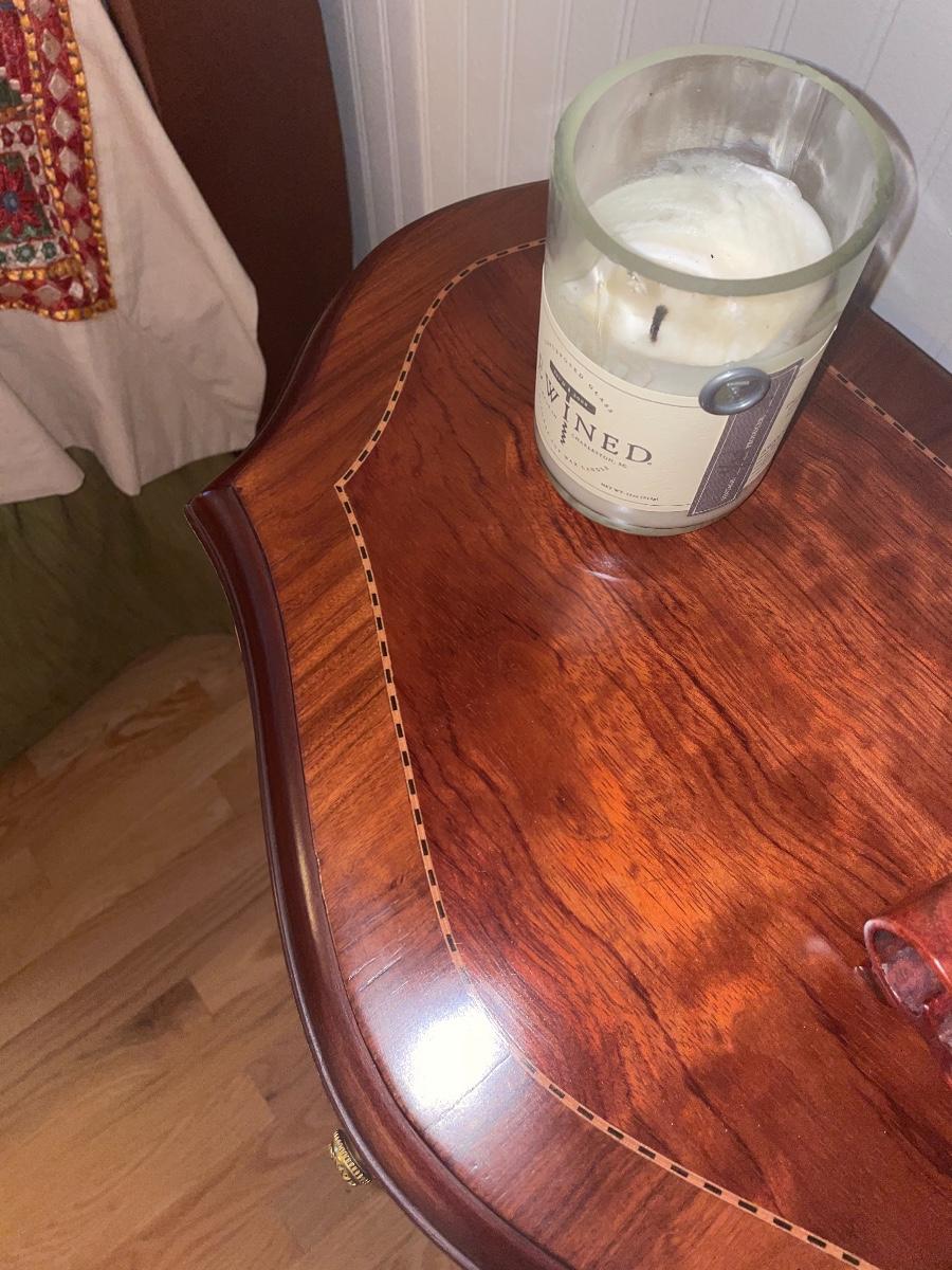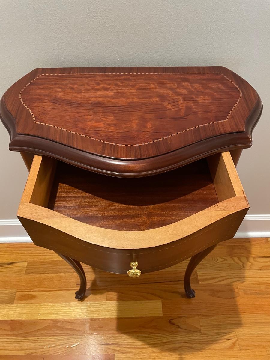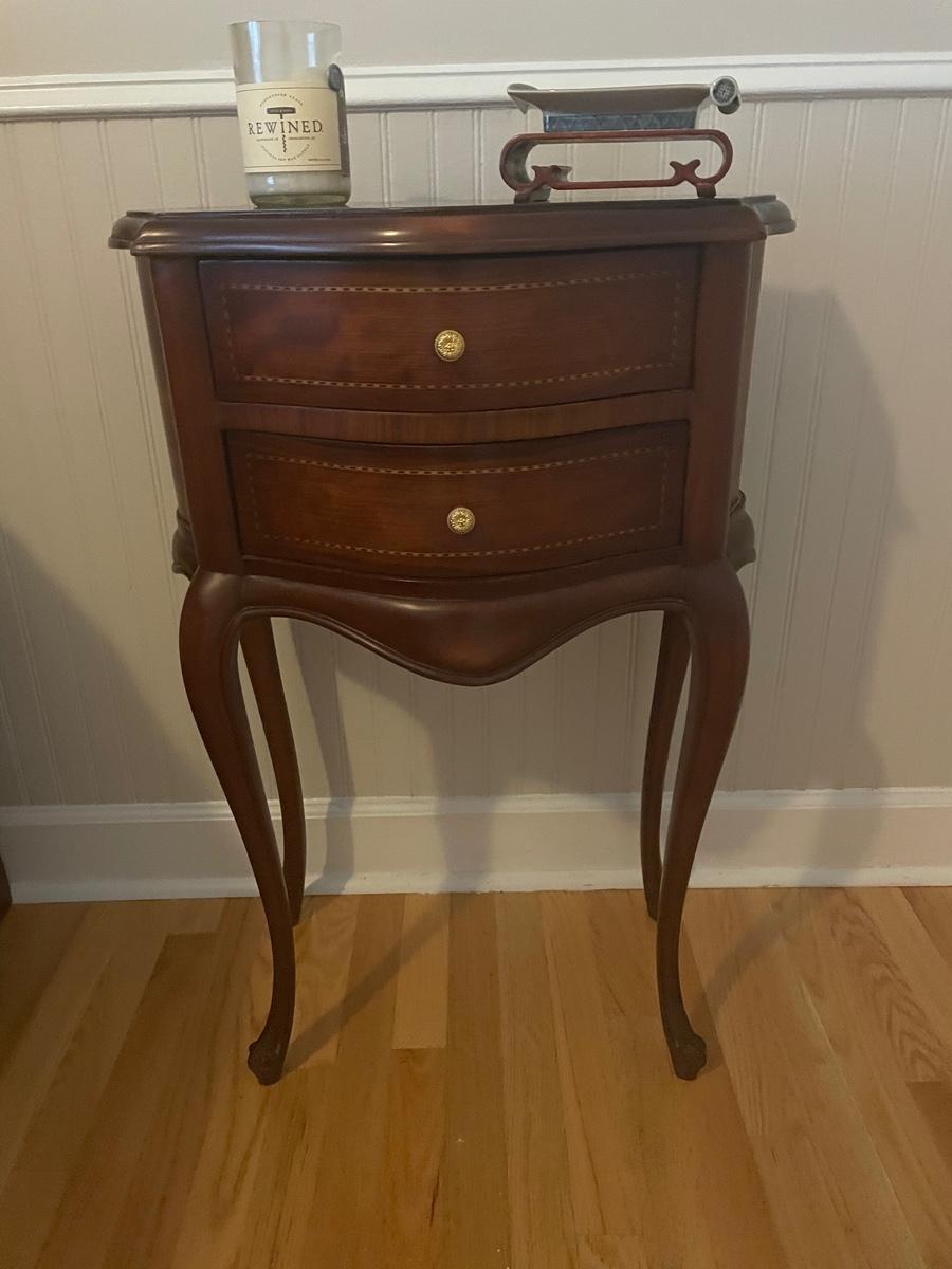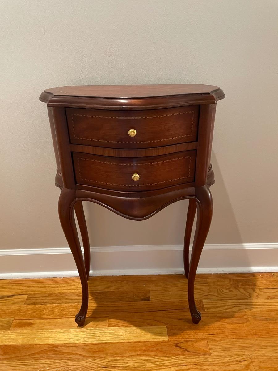 Lovely wood side table with 2 drawers. and marquetry inlay detail. 32" x 22" x 13"
