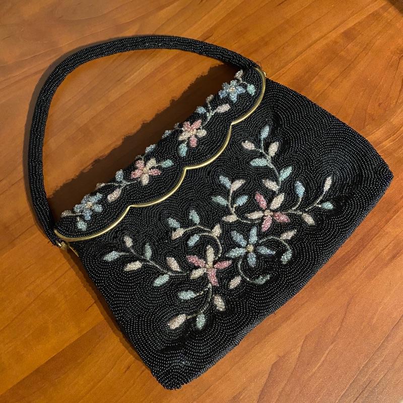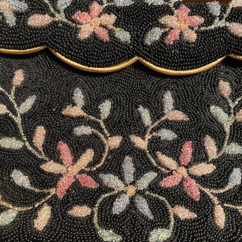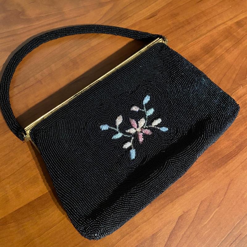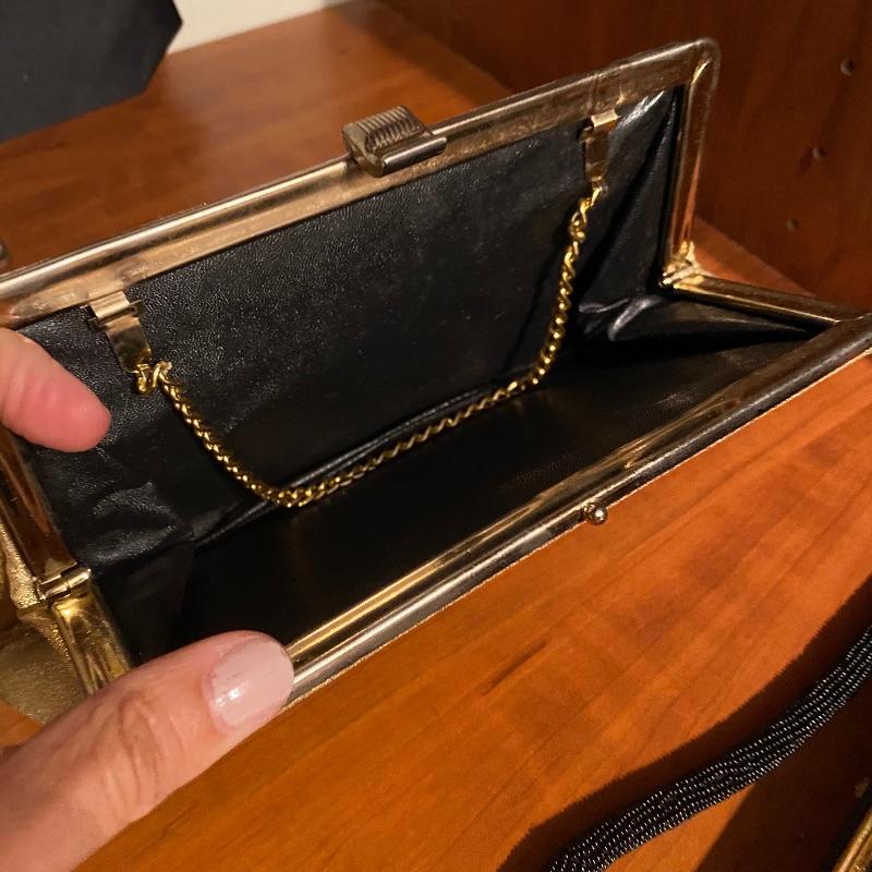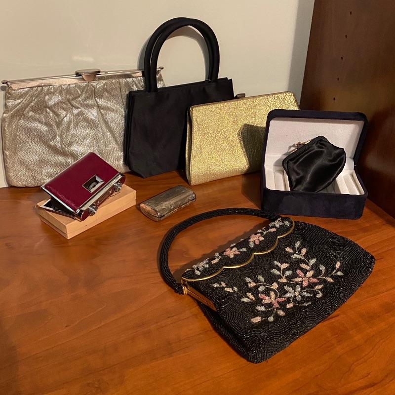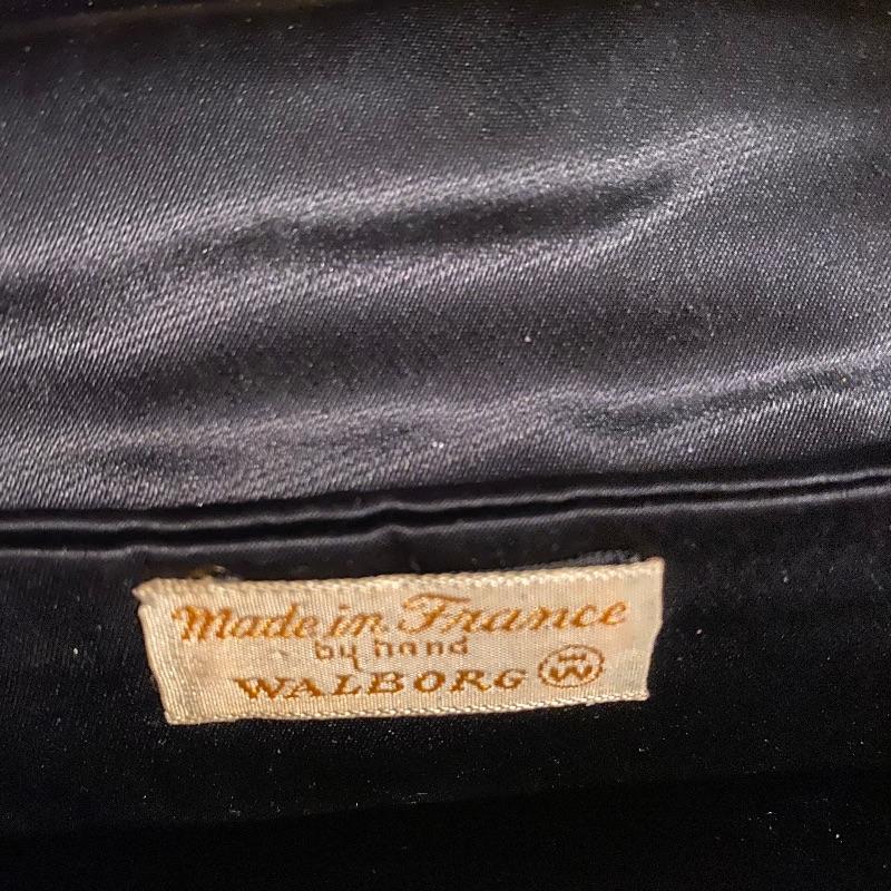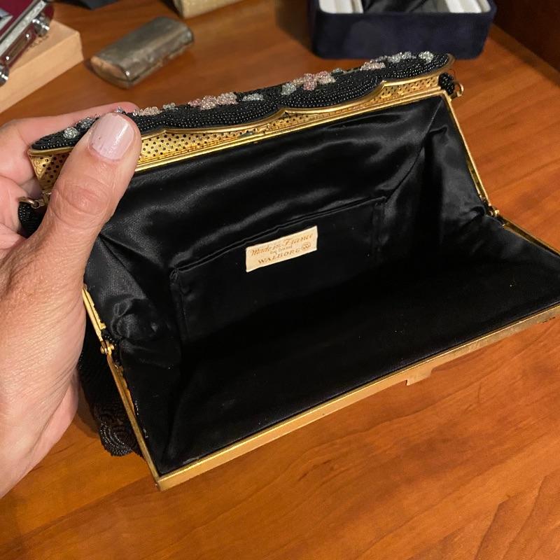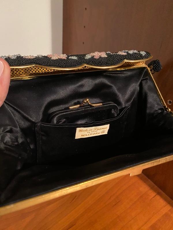 Look at the gorgeous detail on this formal handbag made in France by Walborg. It’s in excellent condition and has a spring loaded opening and matching silk coin purse. Included are silver, gold and black purses for every occasion. The lot also includes a folding pair of opera glasses by Empire, a metal pill box and a small jewelry holder. Shipping available