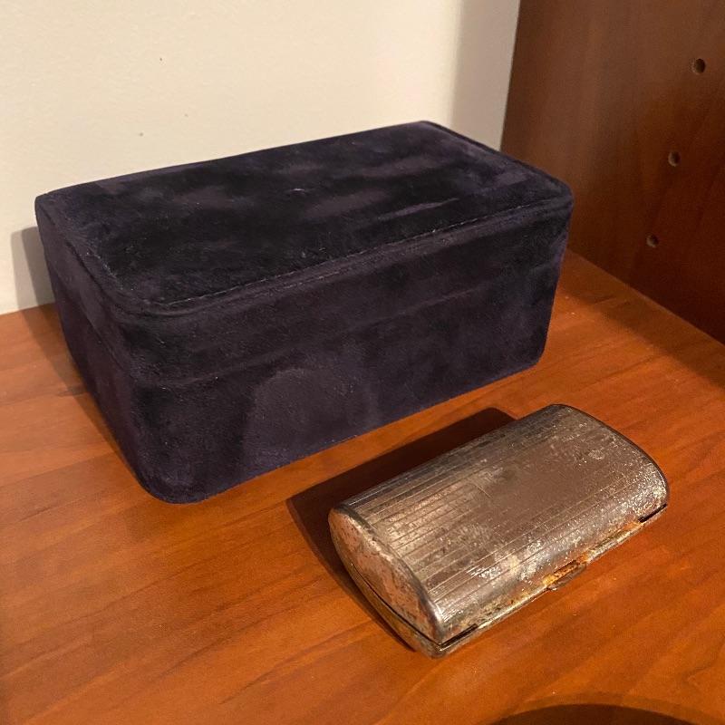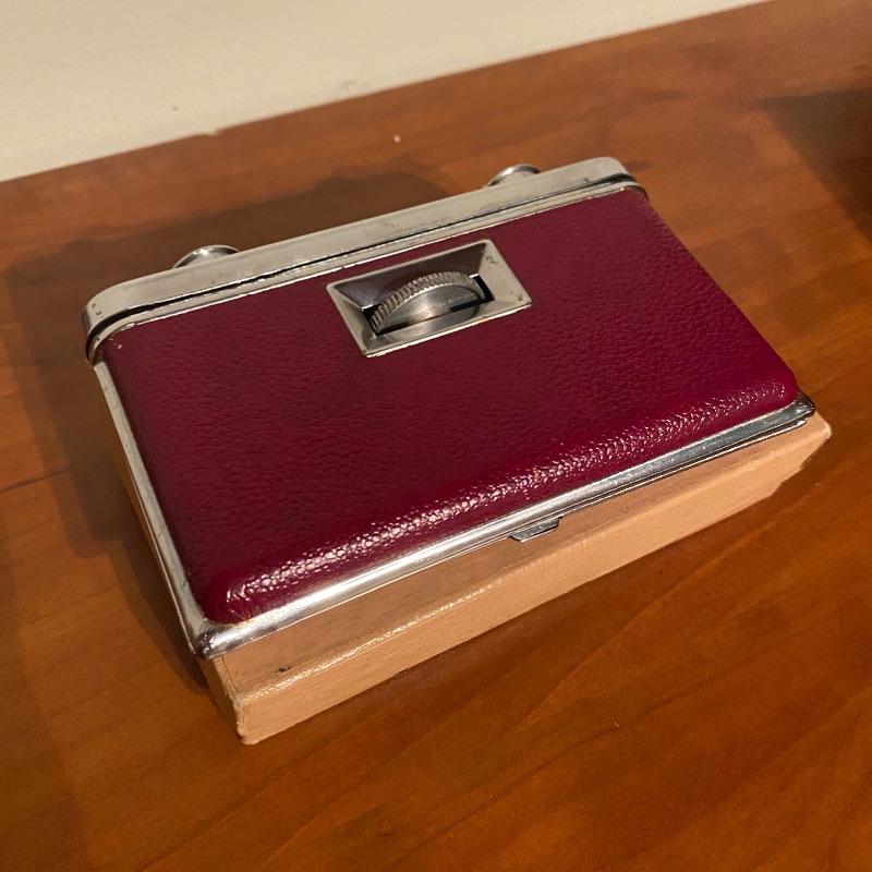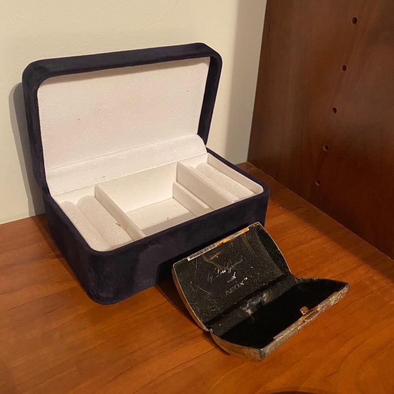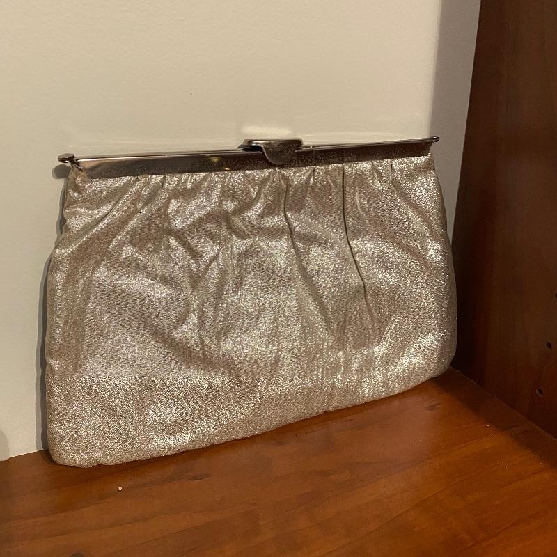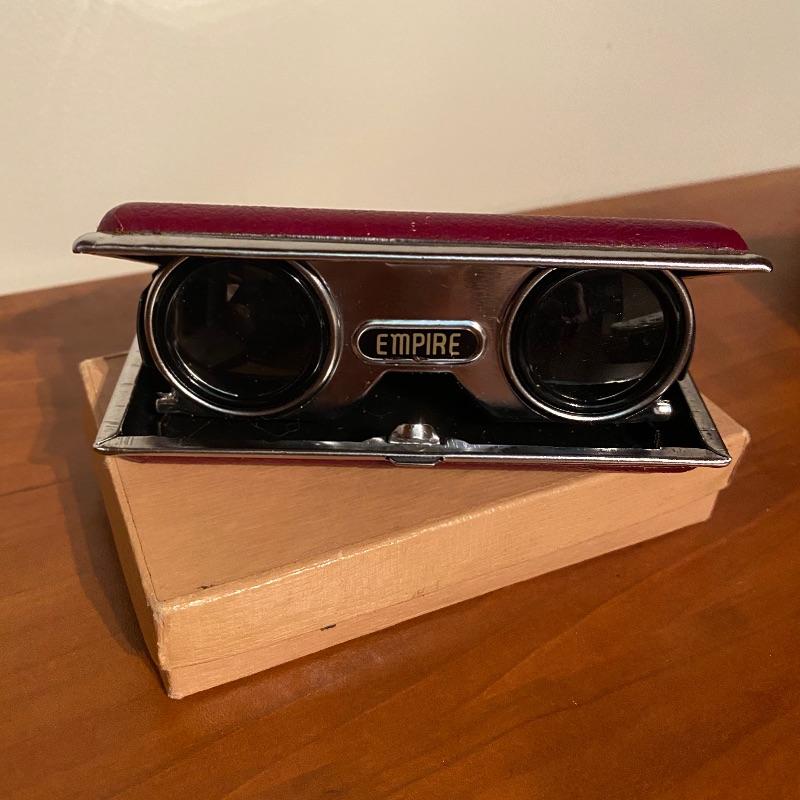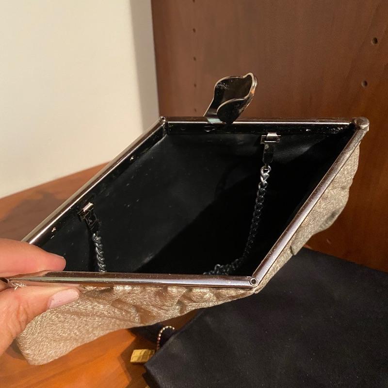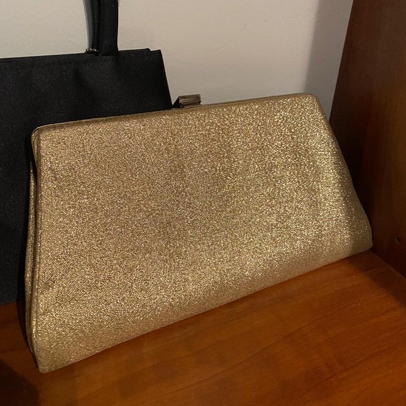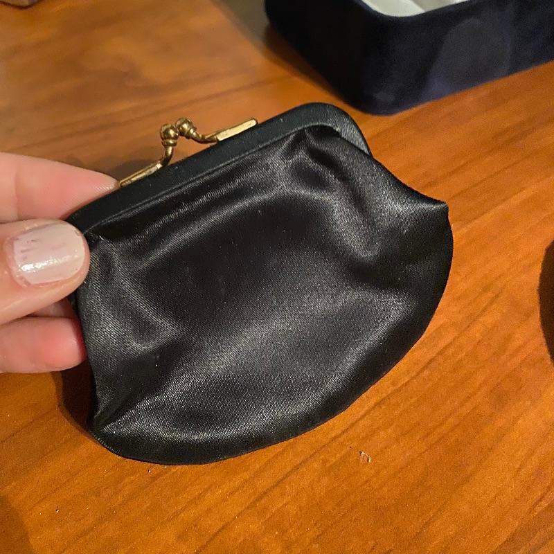 Look at the gorgeous detail on this formal handbag made in France by Walborg. It’s in excellent condition and has a spring loaded opening and matching silk coin purse. Included are silver, gold and black purses for every occasion. The lot also includes a folding pair of opera glasses by Empire, a metal pill box and a small jewelry holder. Shipping available