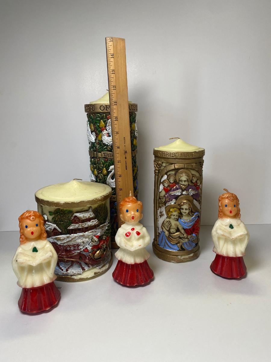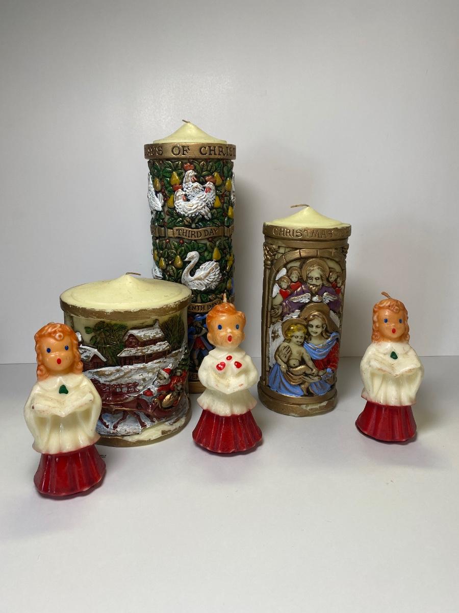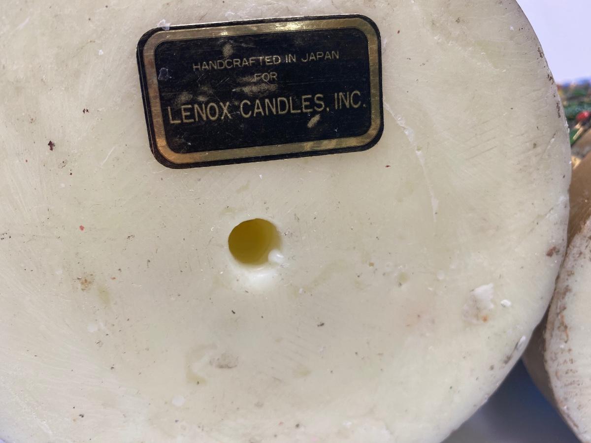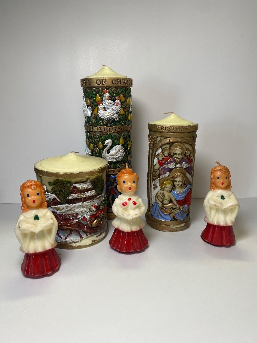 Three Lenox Christmas candles and three singing children Gurly Company Christmas candles.